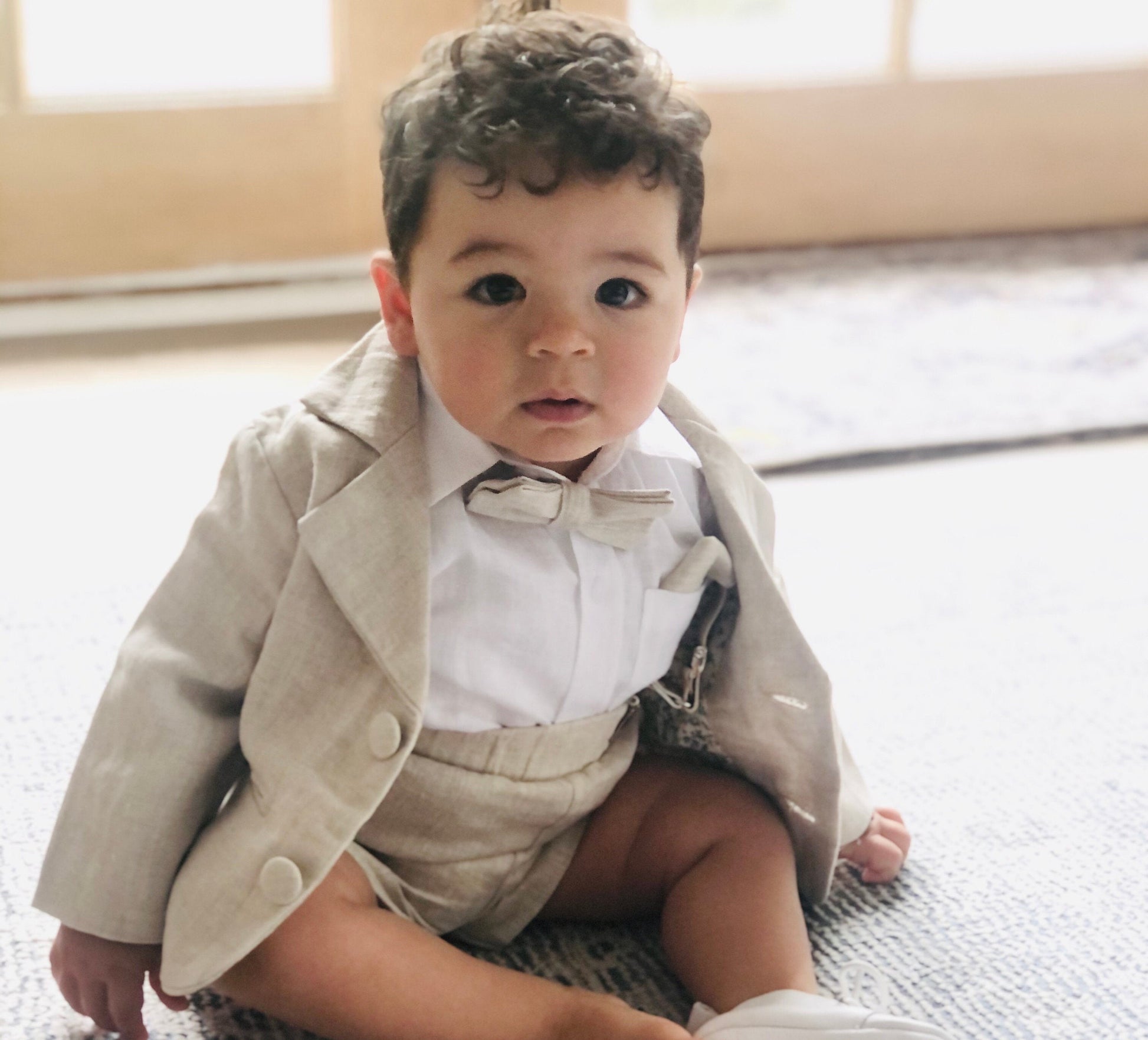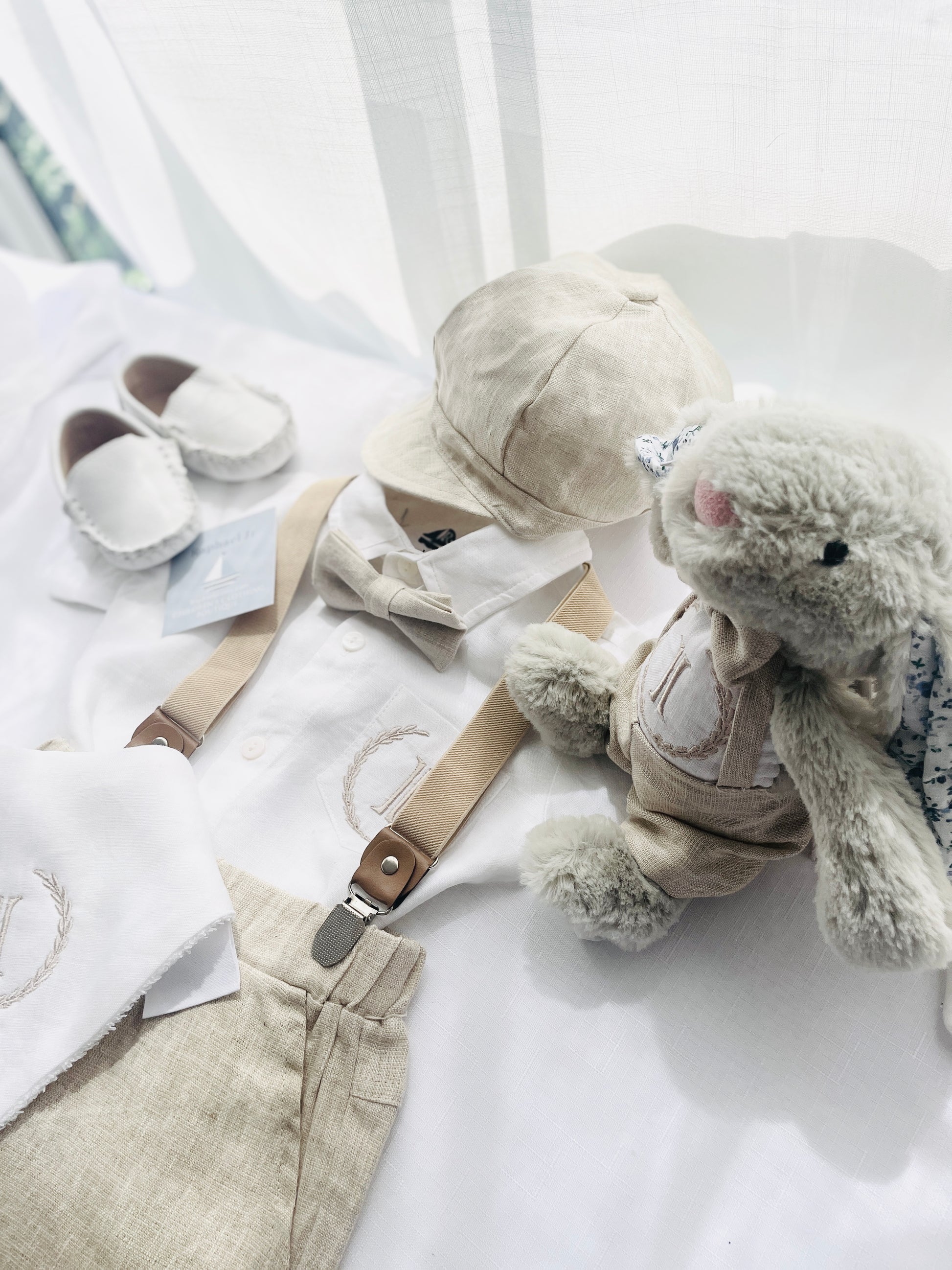 The perfect outfit! White 100% linen shirt (long or short sleeves) with adorable bowtie of your choice, matching beige (or tan) suspenders and beige 100% linen pants. Beige linen suit jacket to match.