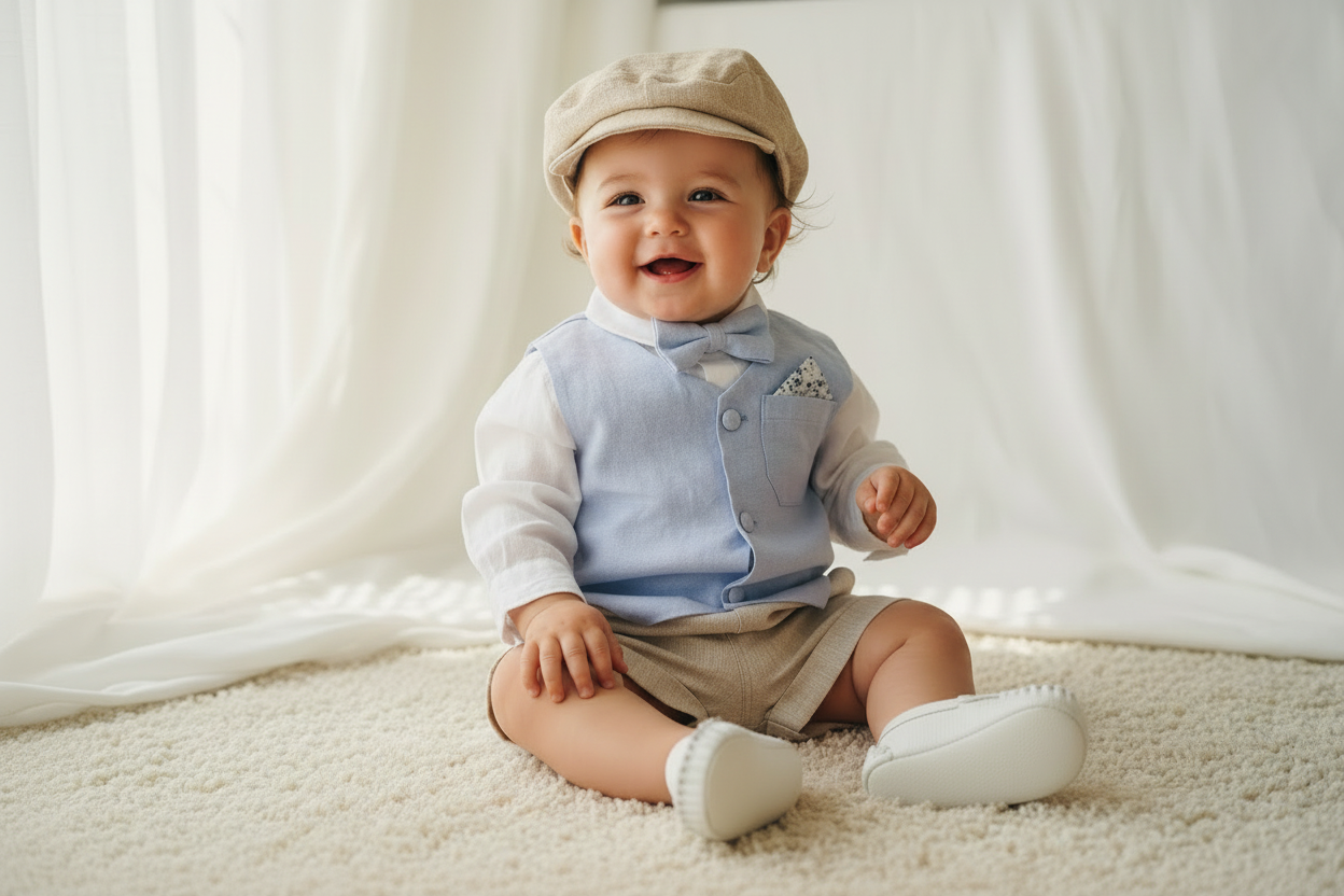 Add hat (as above add 100% cotton or linen beige paperboy style hat available is 4 sizes- XS (0-3m), S (3-6m), M (6-12m) and L (1-3 years). Flat caps available in 0-12m and 1-3 years. (white linen available also)