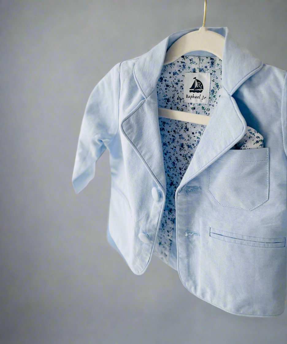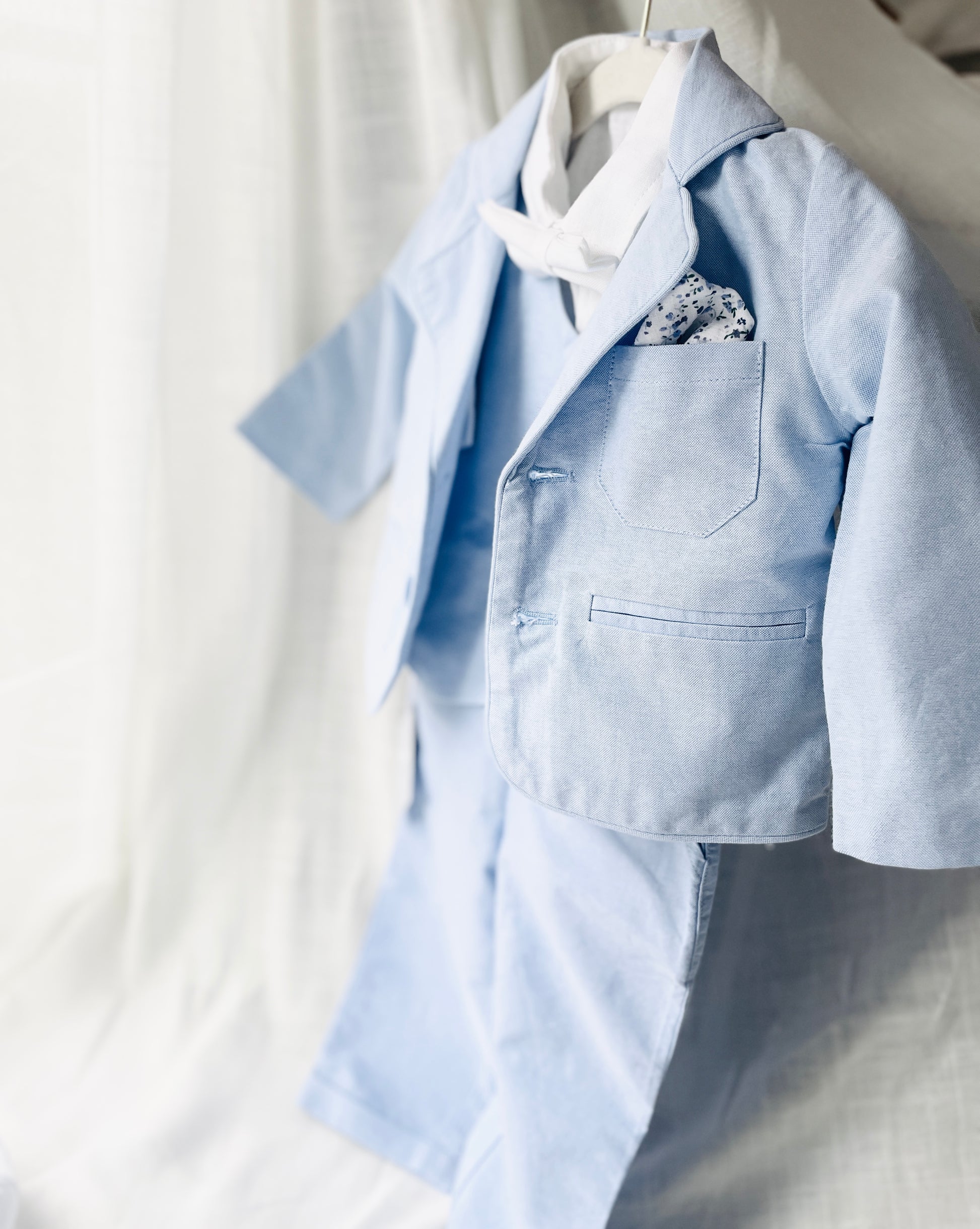 Baby and toddler boys pale blue chambray suit with blue vest, pants and jacket