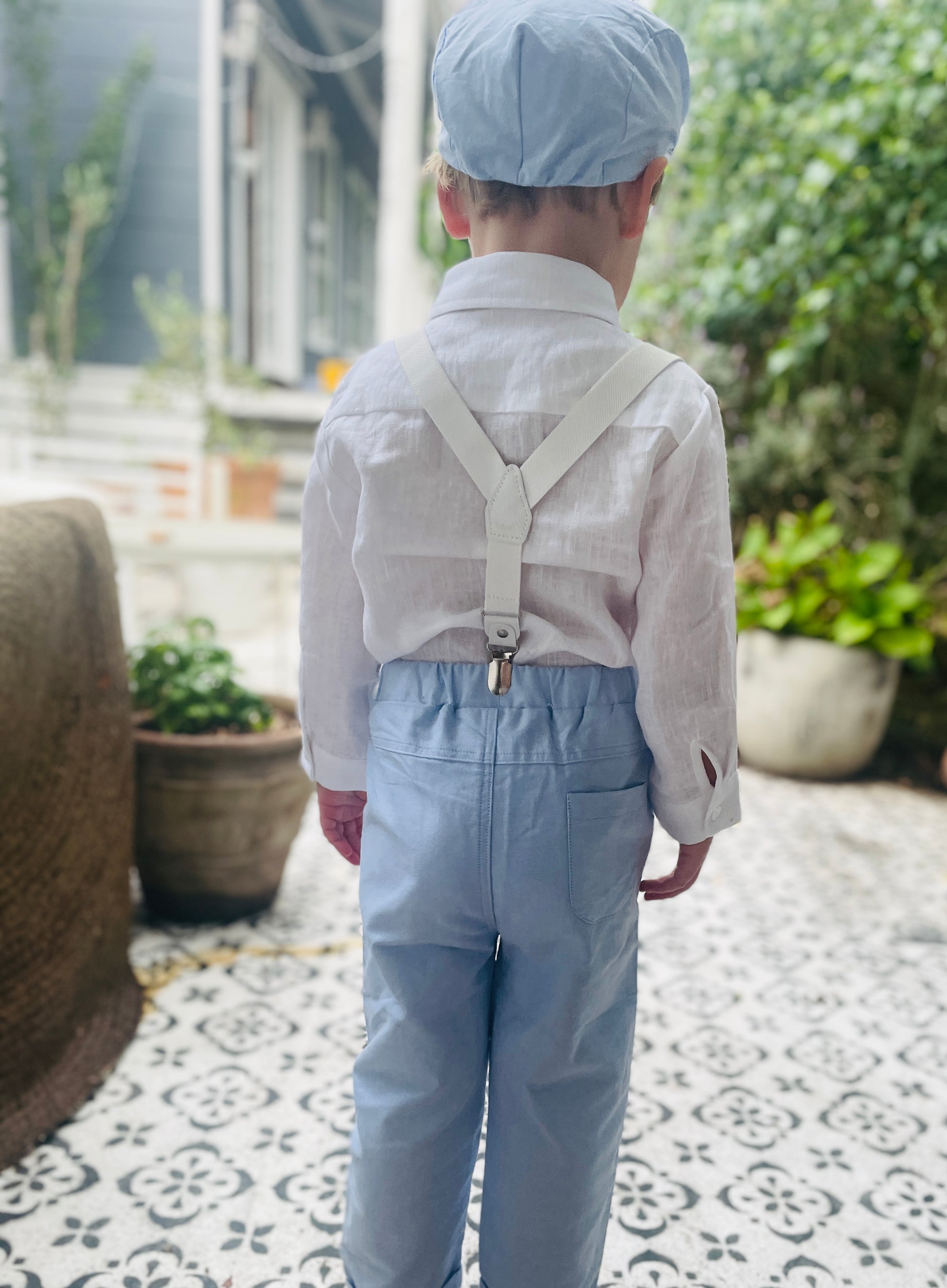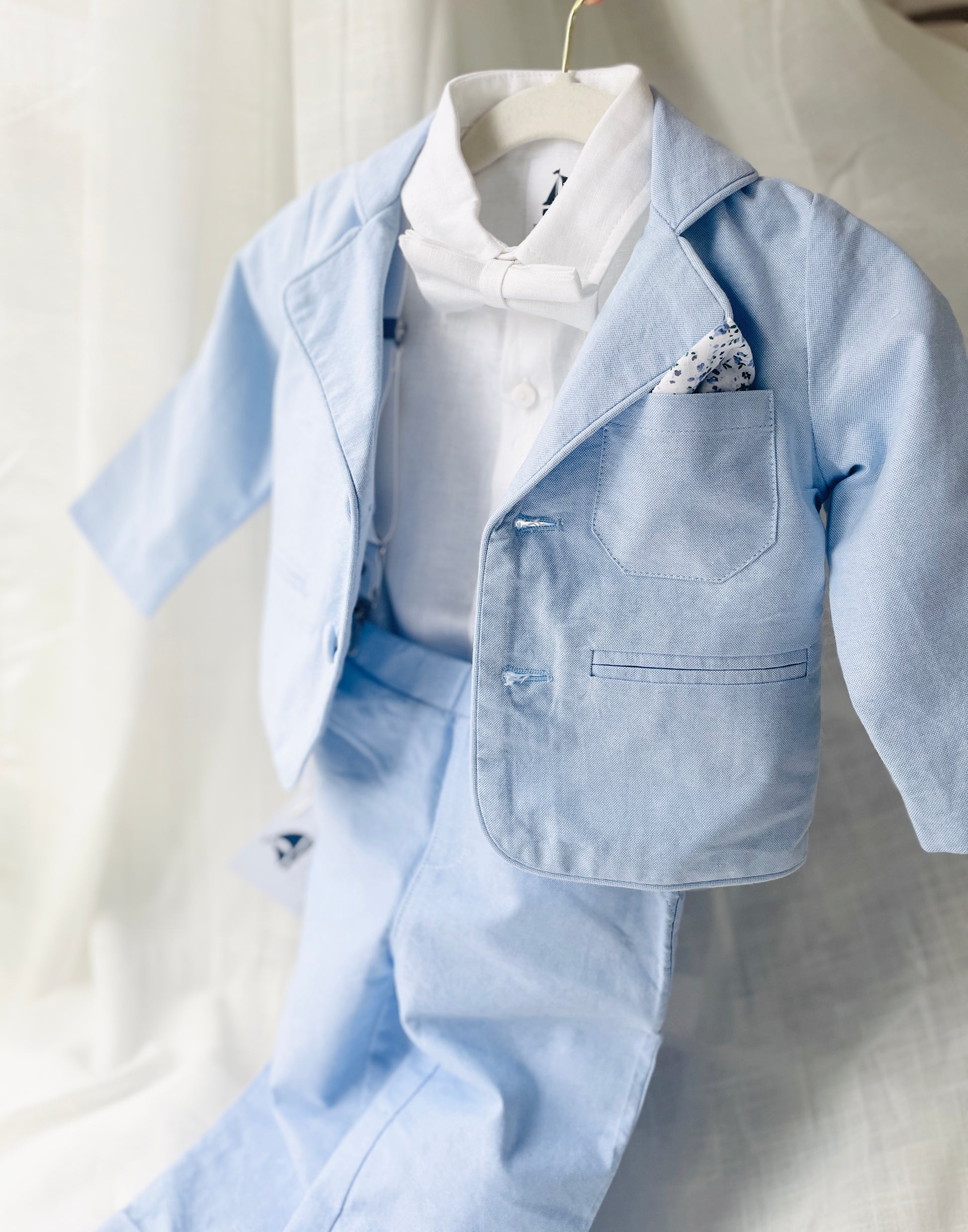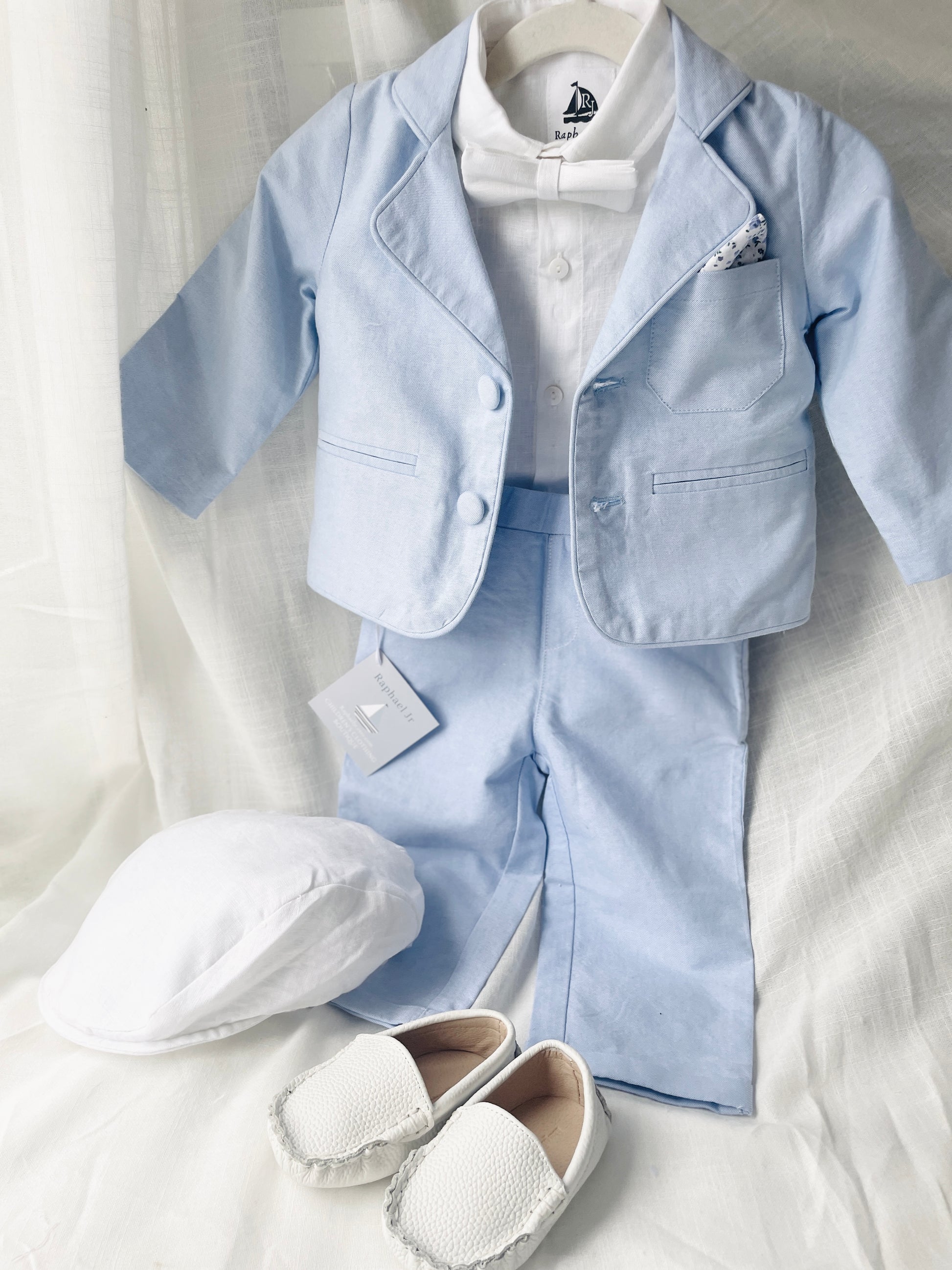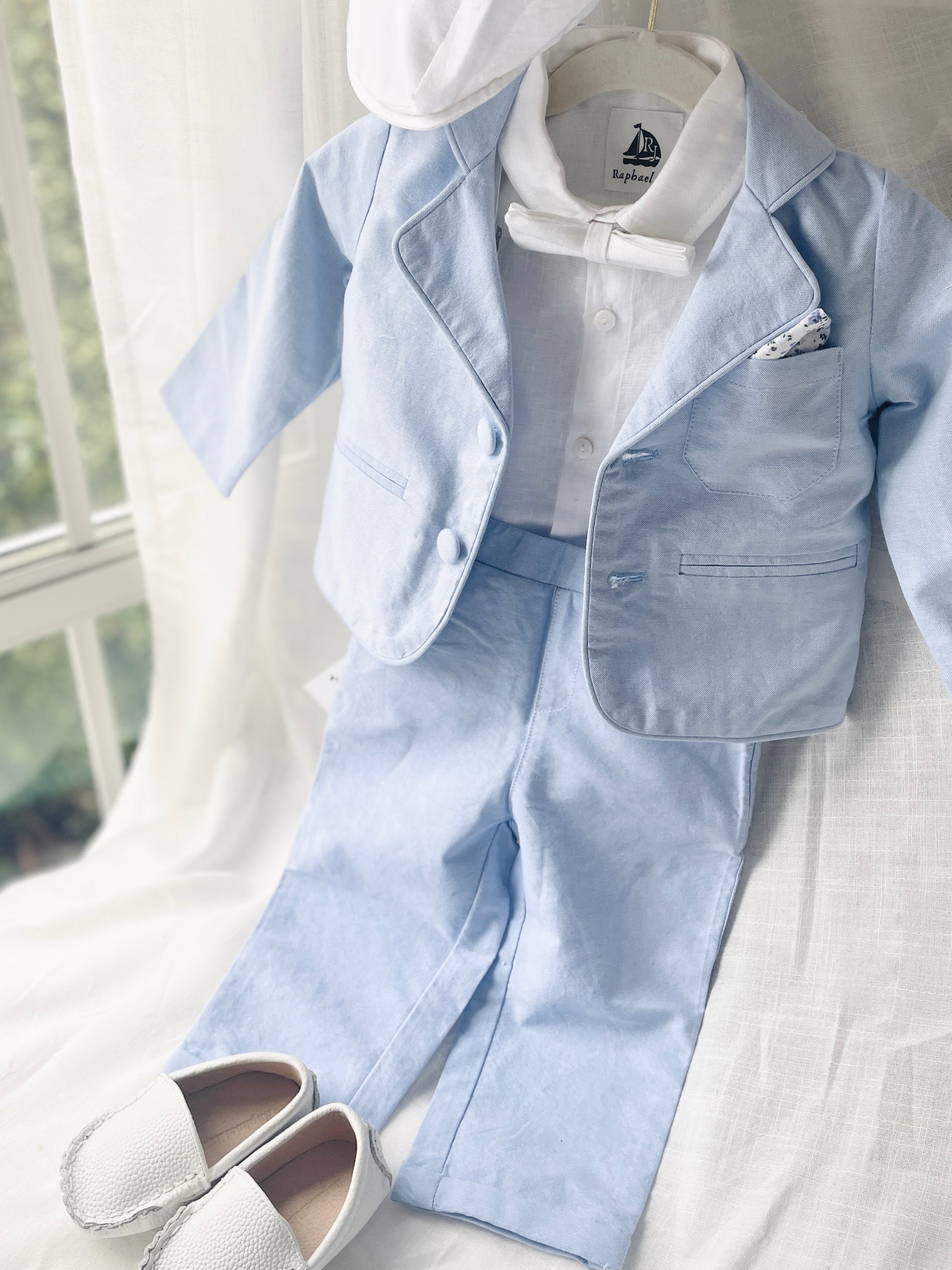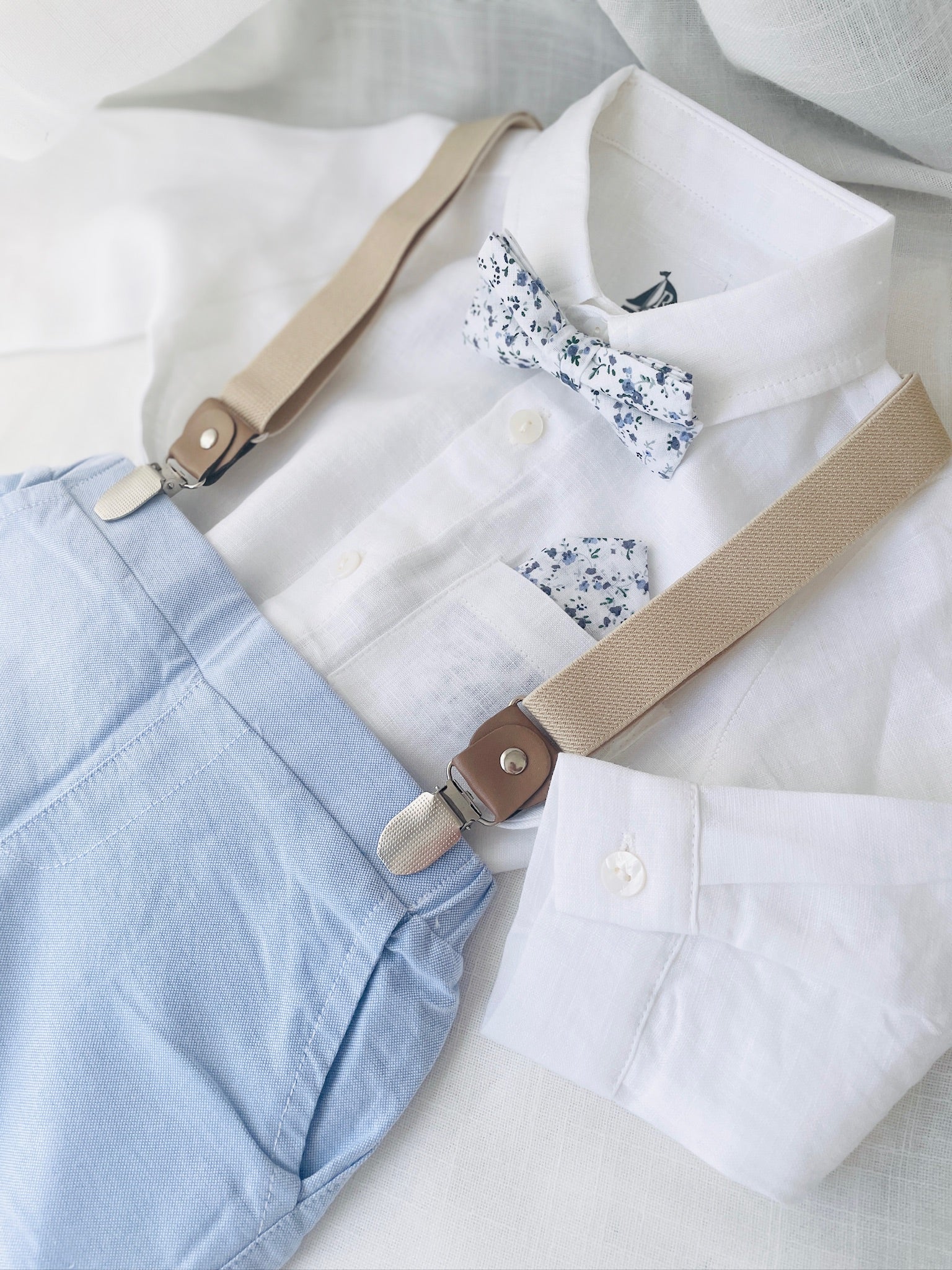 The perfect outfit! White 100% linen shirt (long or short sleeves) with adorable bowtie of your choice, matching white (or tan) suspenders and pale blue chambray 100% cotton pant and a gorgeous suit jacket and vest to match.