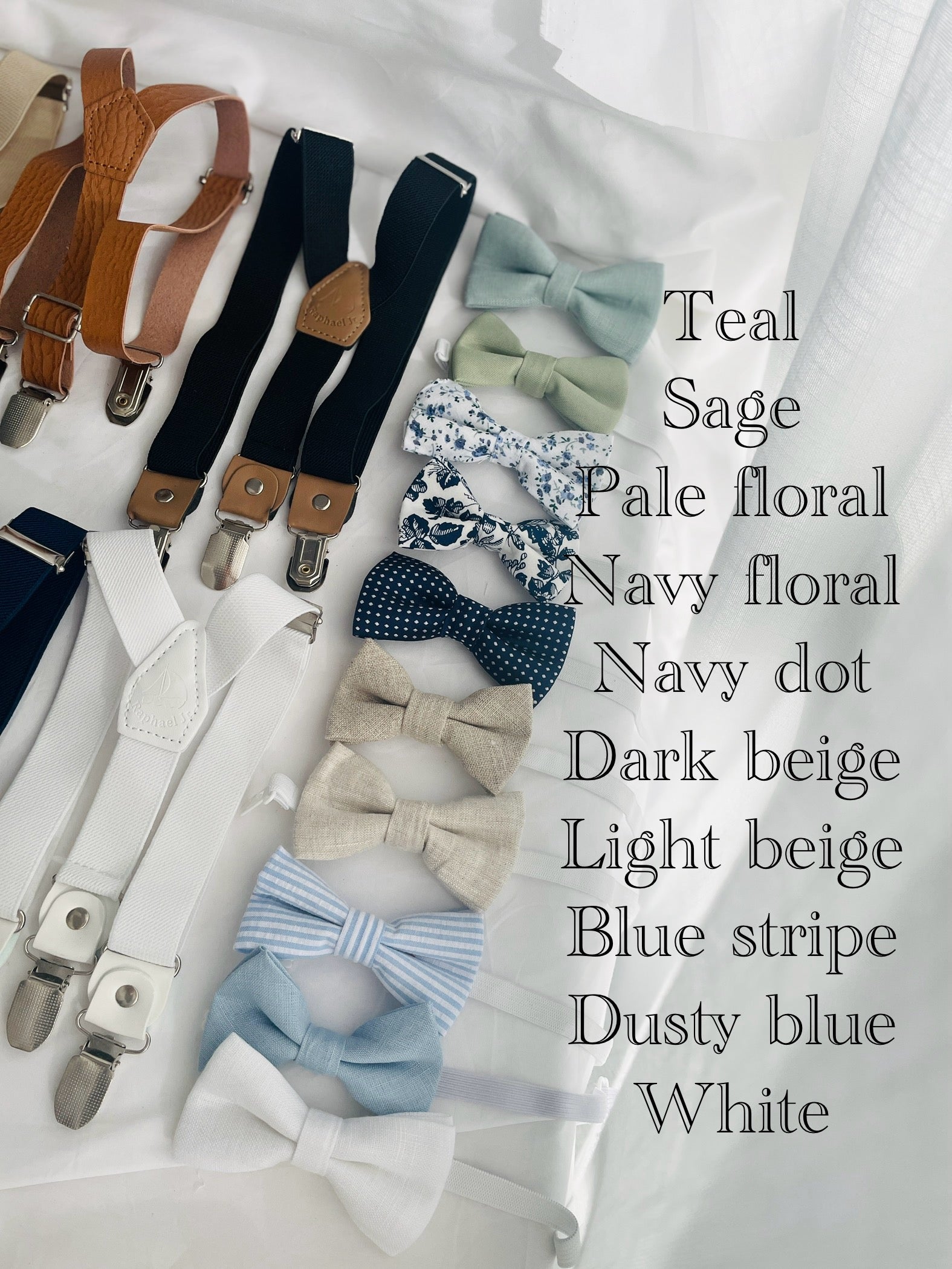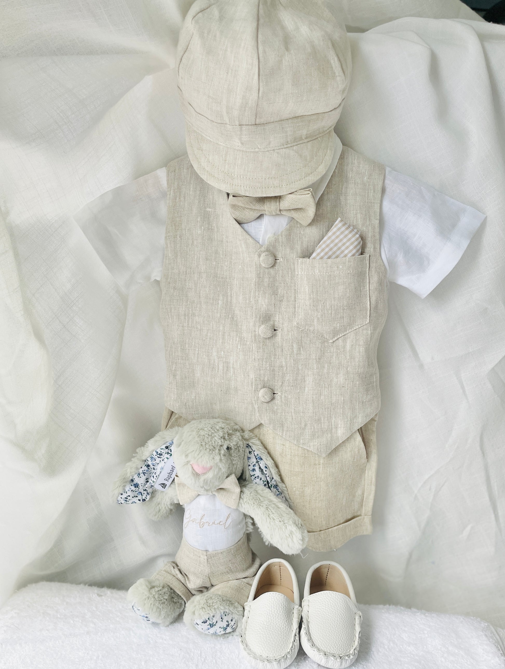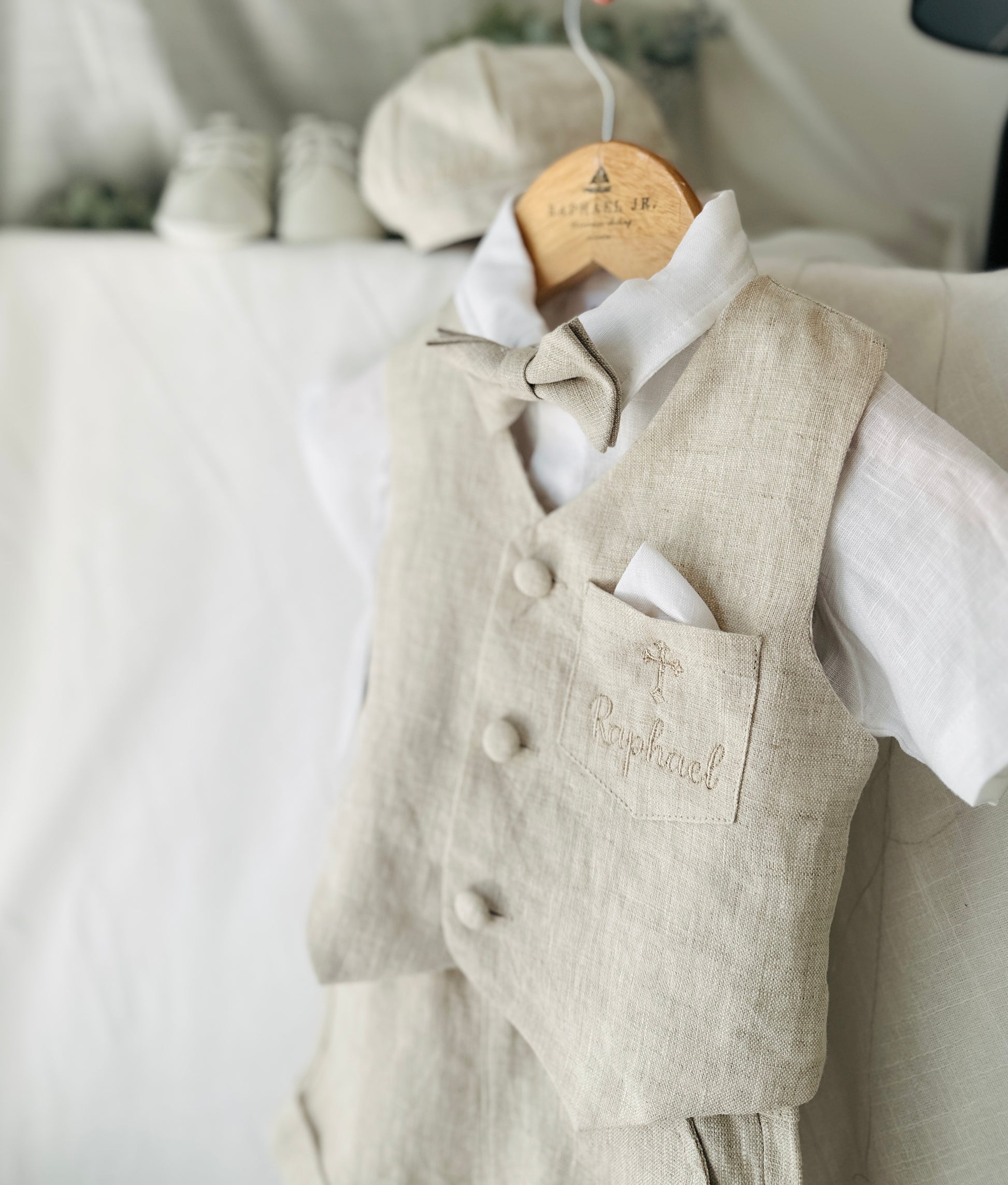 The perfect outfit! White 100% linen shirt (short sleeved) with adorable bowtie of your choice, beige suspenders and beige 100% linen shorts, and a cute vest to top it off.