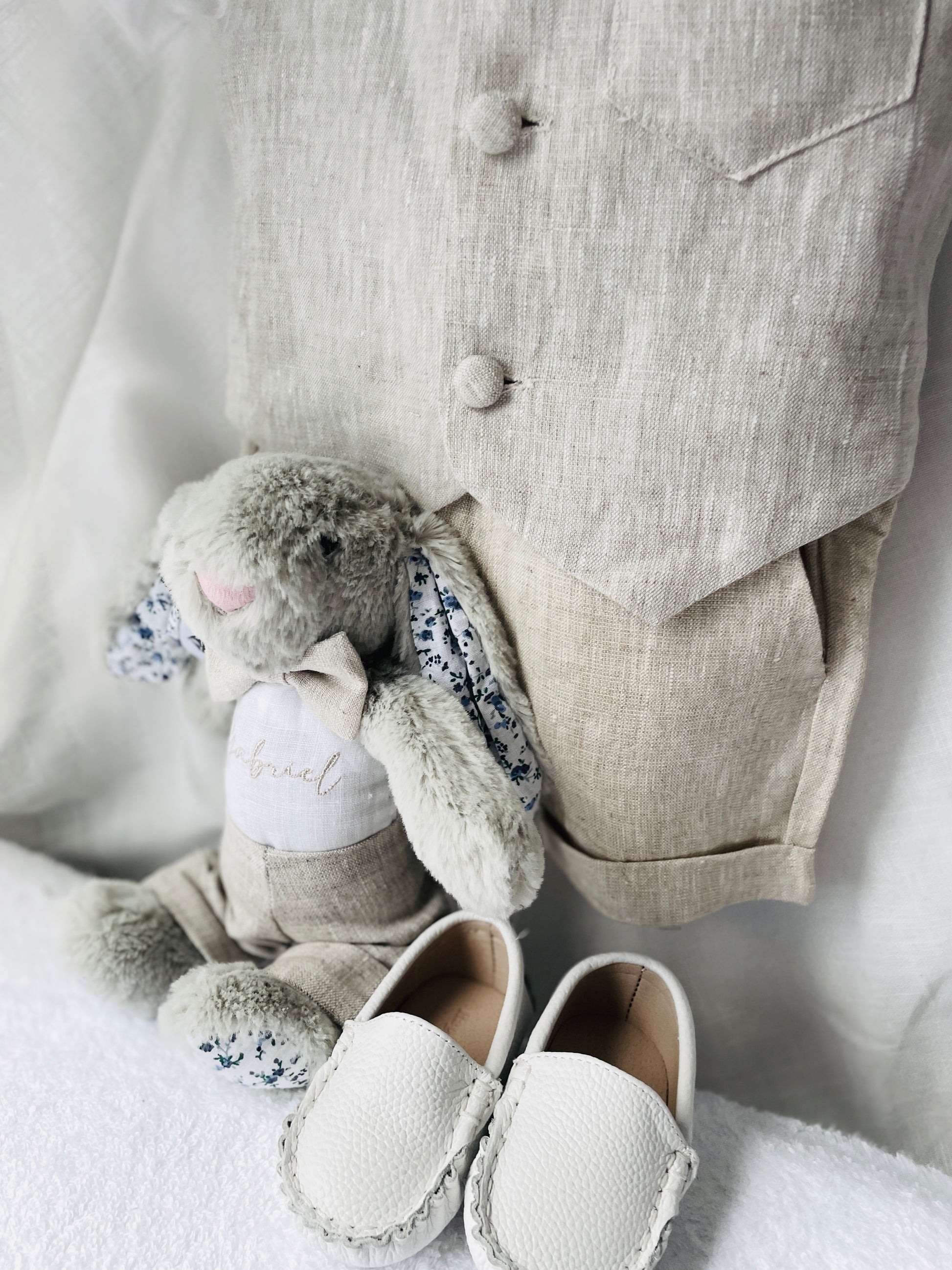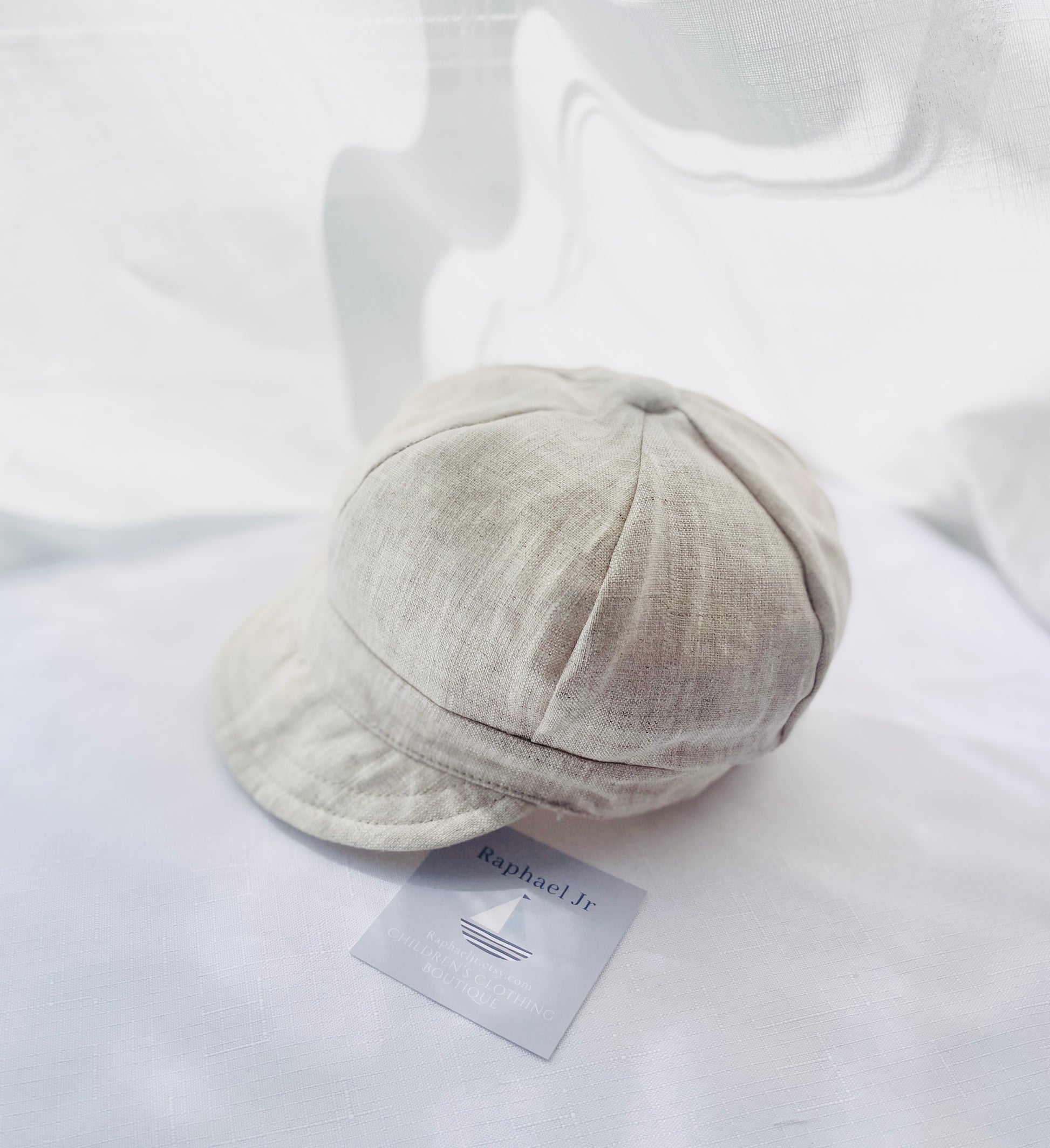 Add hat (as above add 100% cotton or linen beige paperboy style hat available is 4 sizes- XS (0-3m), S (3-6m), M (6-12m) and L (1-3 years). Flat caps available in 0-12m and 1-3 years. (white linen available also)
