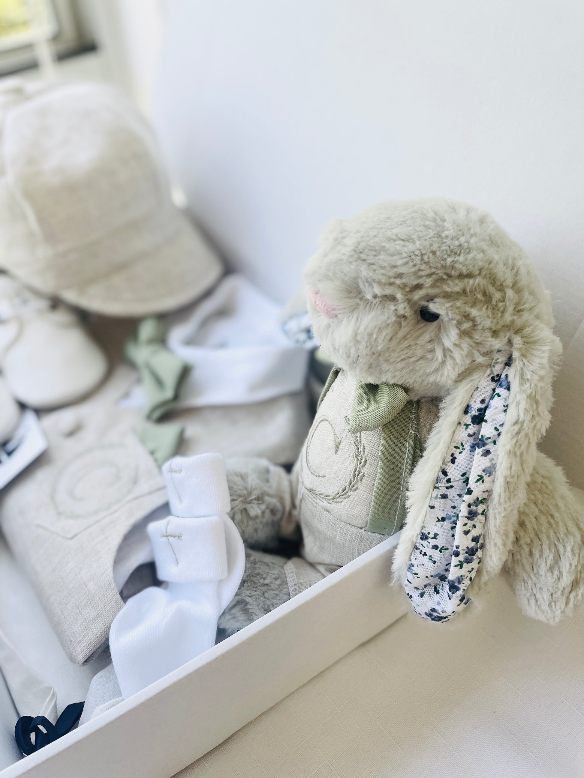 Add embroidery; add your child’s name, initials, a cross, or any custom design to the pocket of the shirt and/or vest, the cap, jacket or bunny (or all!)