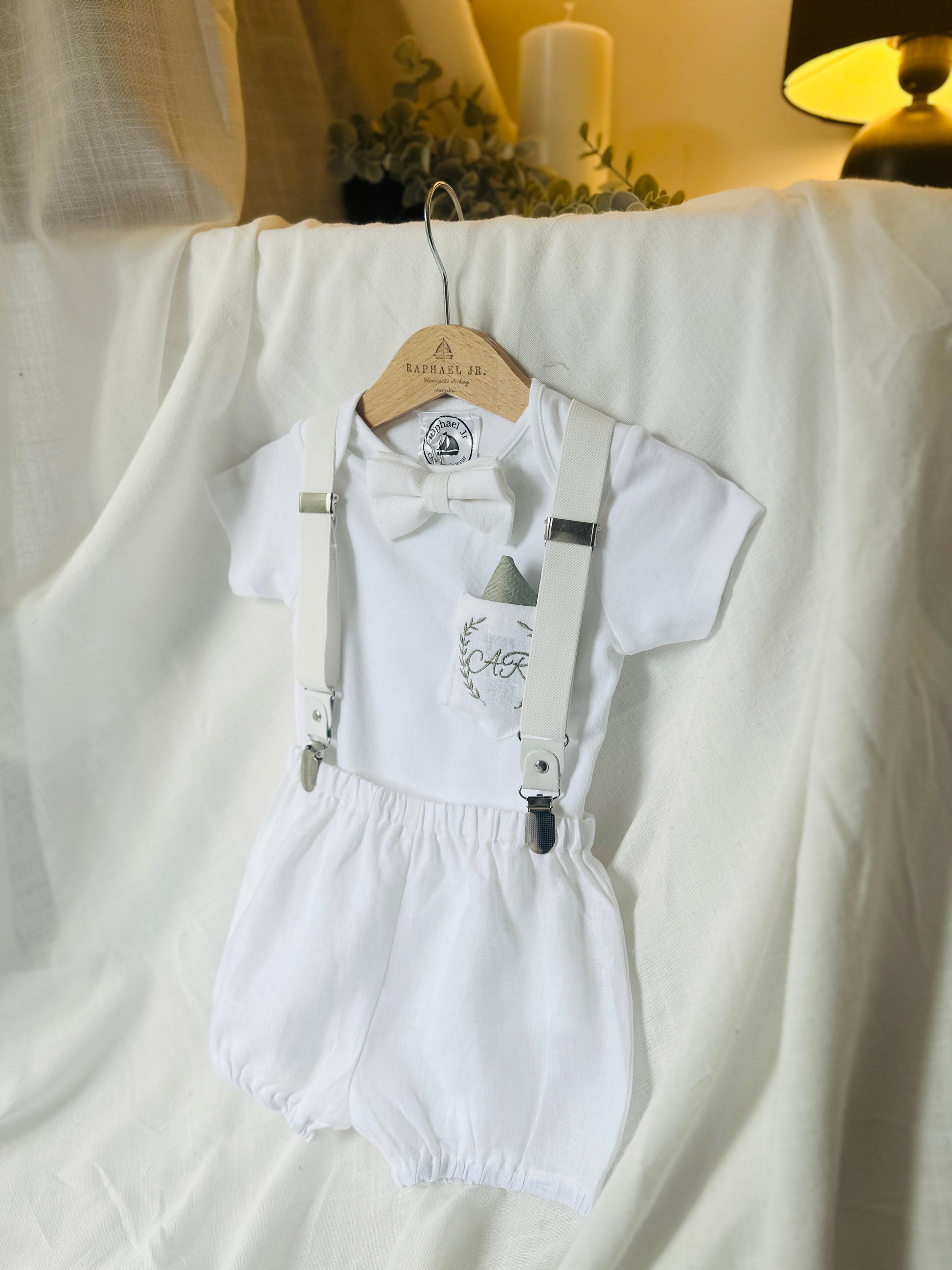 The perfect outfit! White 100% linen shirt (short sleeved) with adorable bowtie of your choice, white suspenders and white 100% linen bloomers. Optional jacket, cap, shoes, embroidery