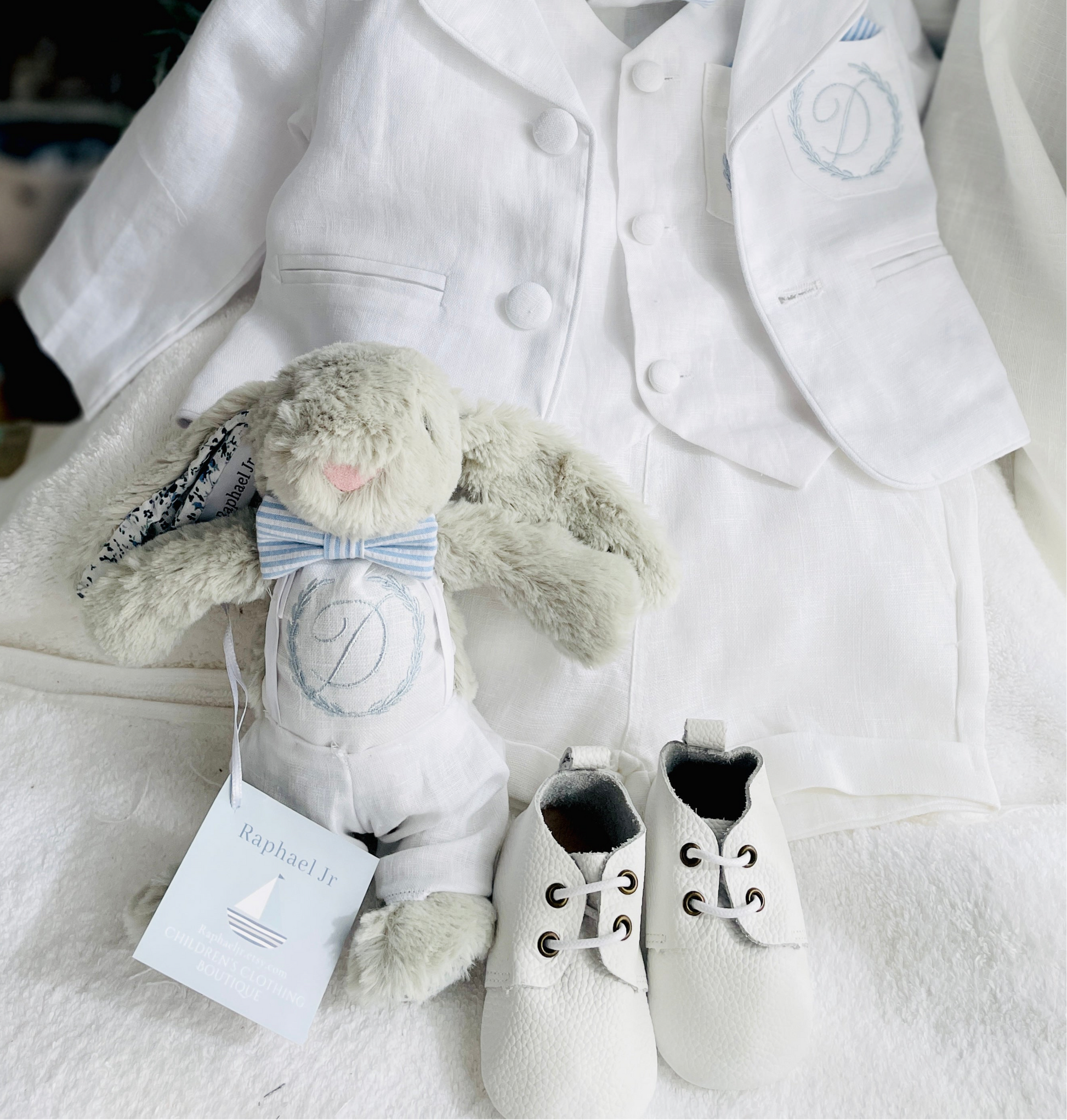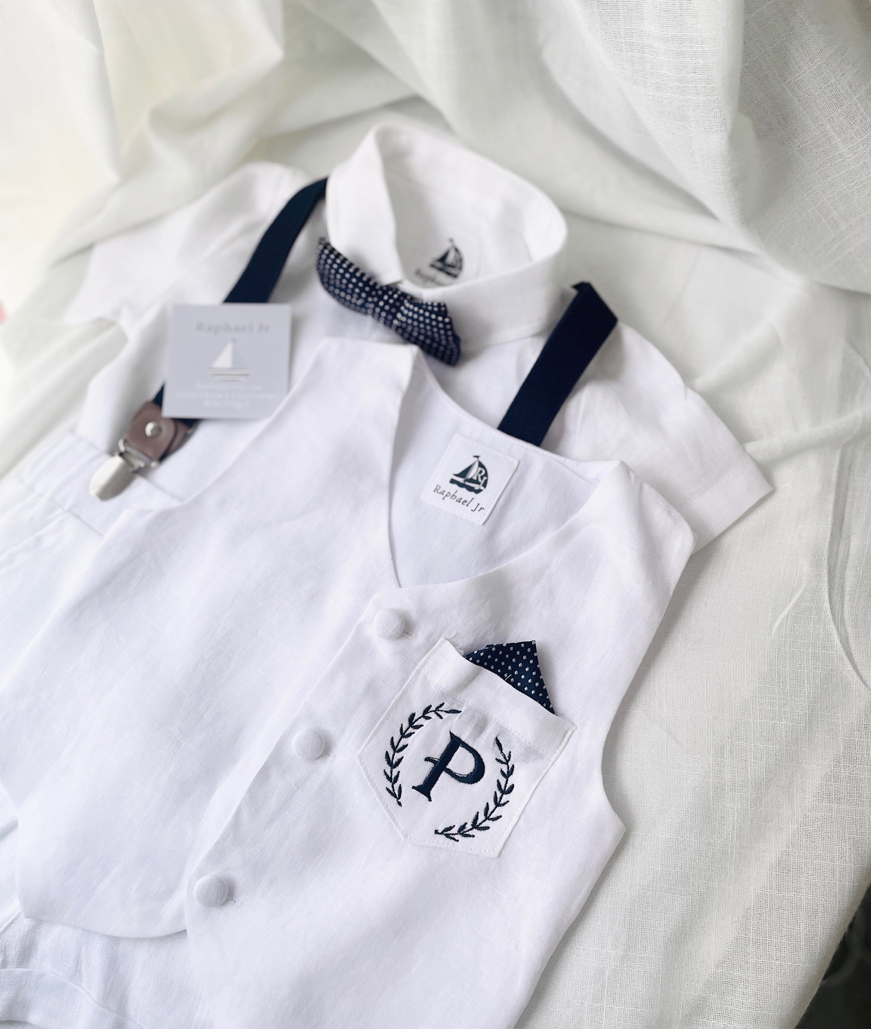 The perfect outfit! White 100% linen shirt (long sleeved) with adorable bowtie of your choice, white suspenders and white 100% linen pants, and a cute vest to top it off.