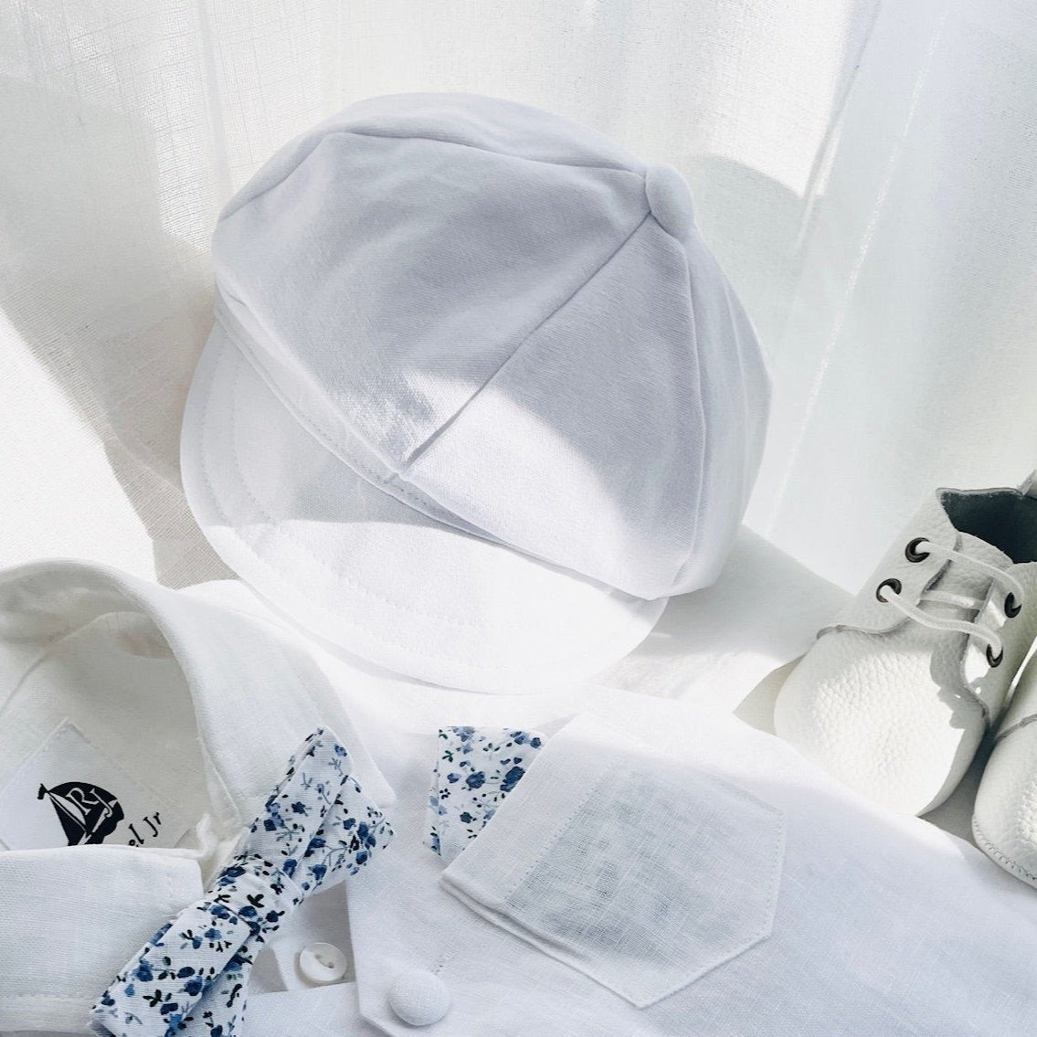 Add hat (as above add 100% cotton or linen white paperboy style hat available is 4 sizes- XS (0-3m), S (3-6m), M (6-12m) and L (1-3 years). Flat caps available in 0-12m and 1-3 years. (beige linen available also)