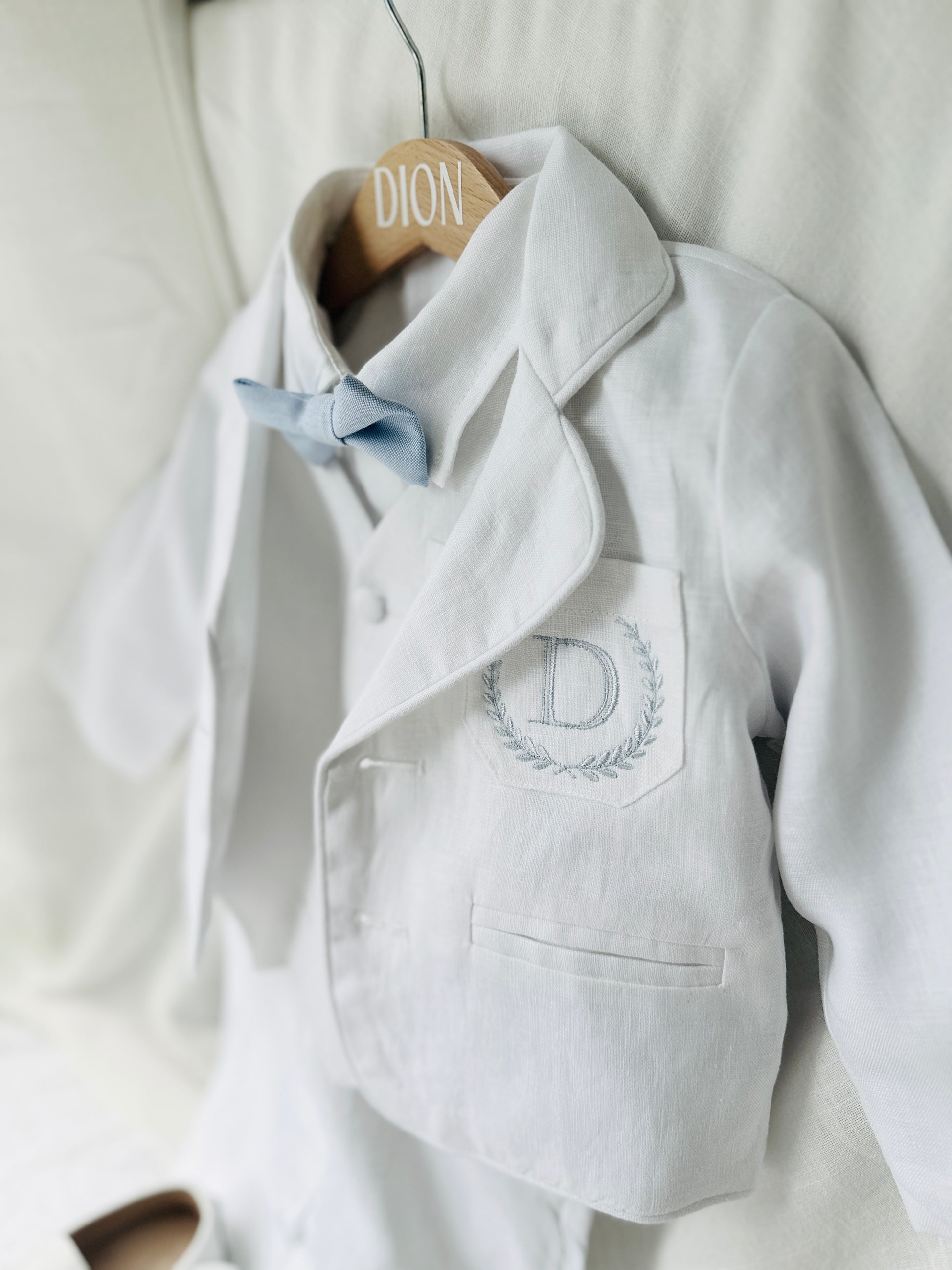 The perfect outfit! White 100% linen shirt (long sleeved) with adorable bowtie of your choice, white suspenders and white 100% linen pants, and a cute vest to top it off.