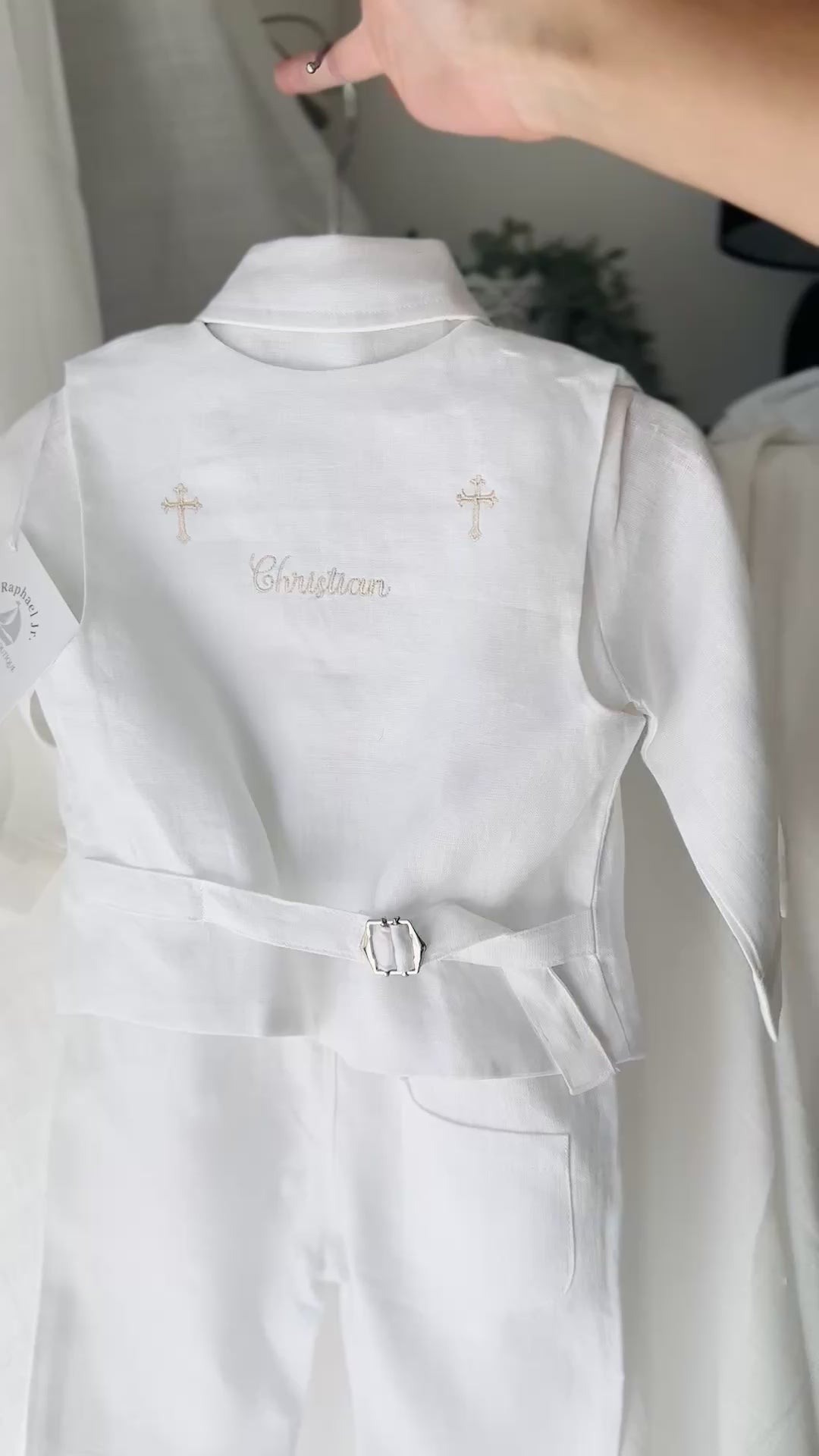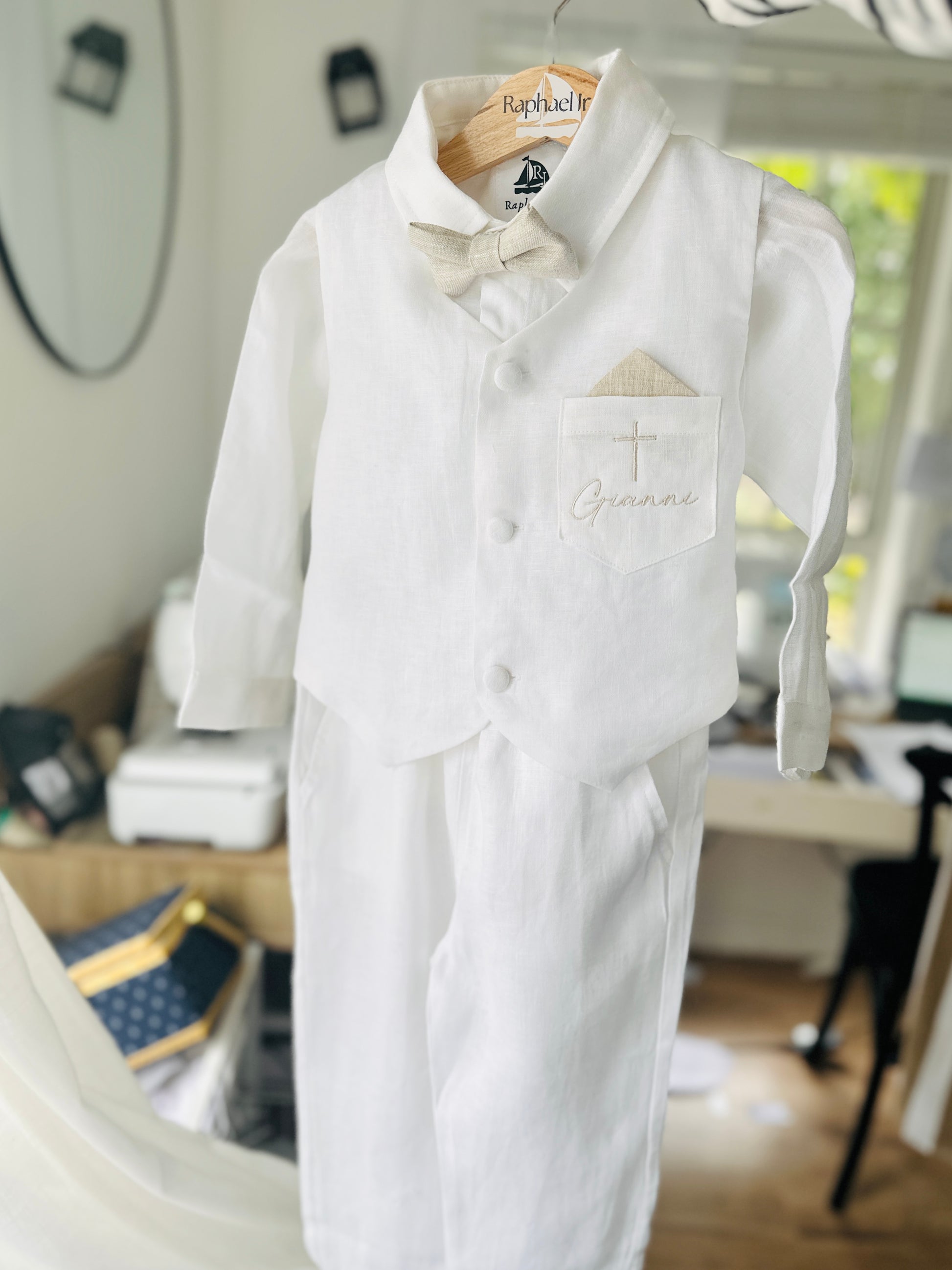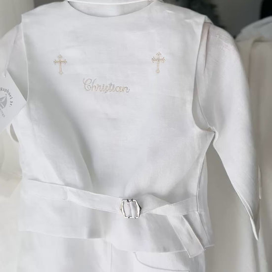 Boys white linen full length Baptism set with vest, shirt, pants, suspenders and bow tie