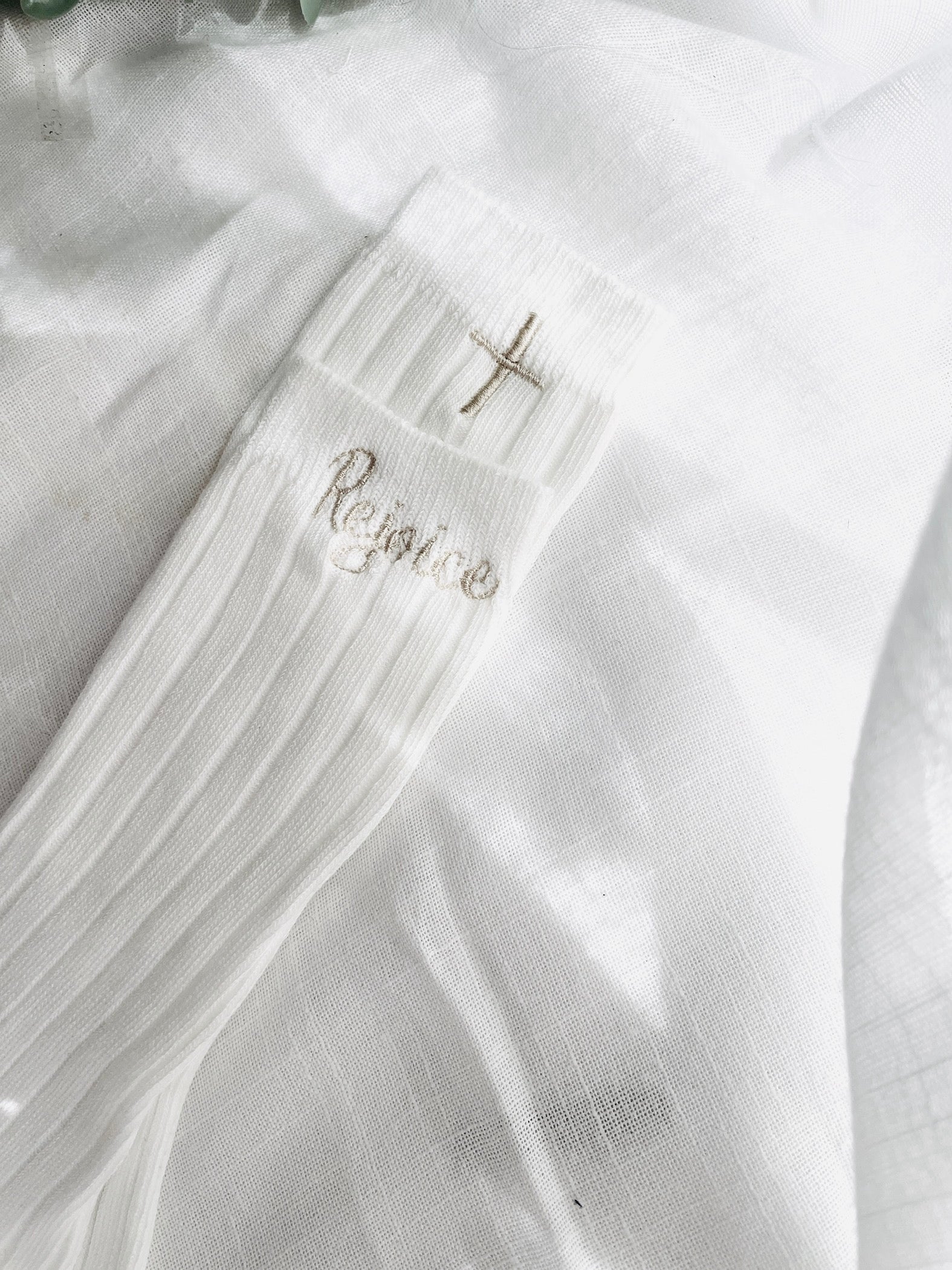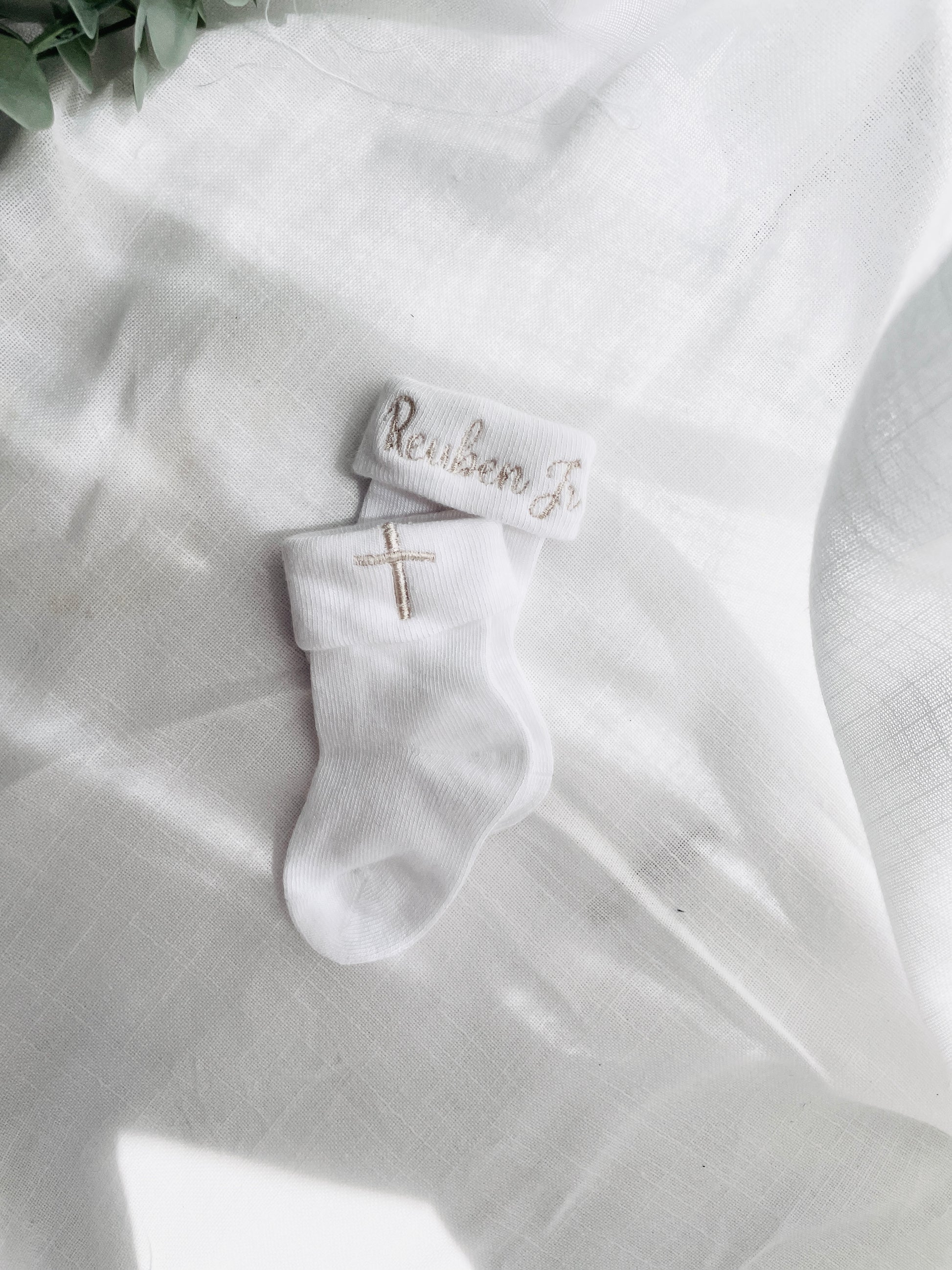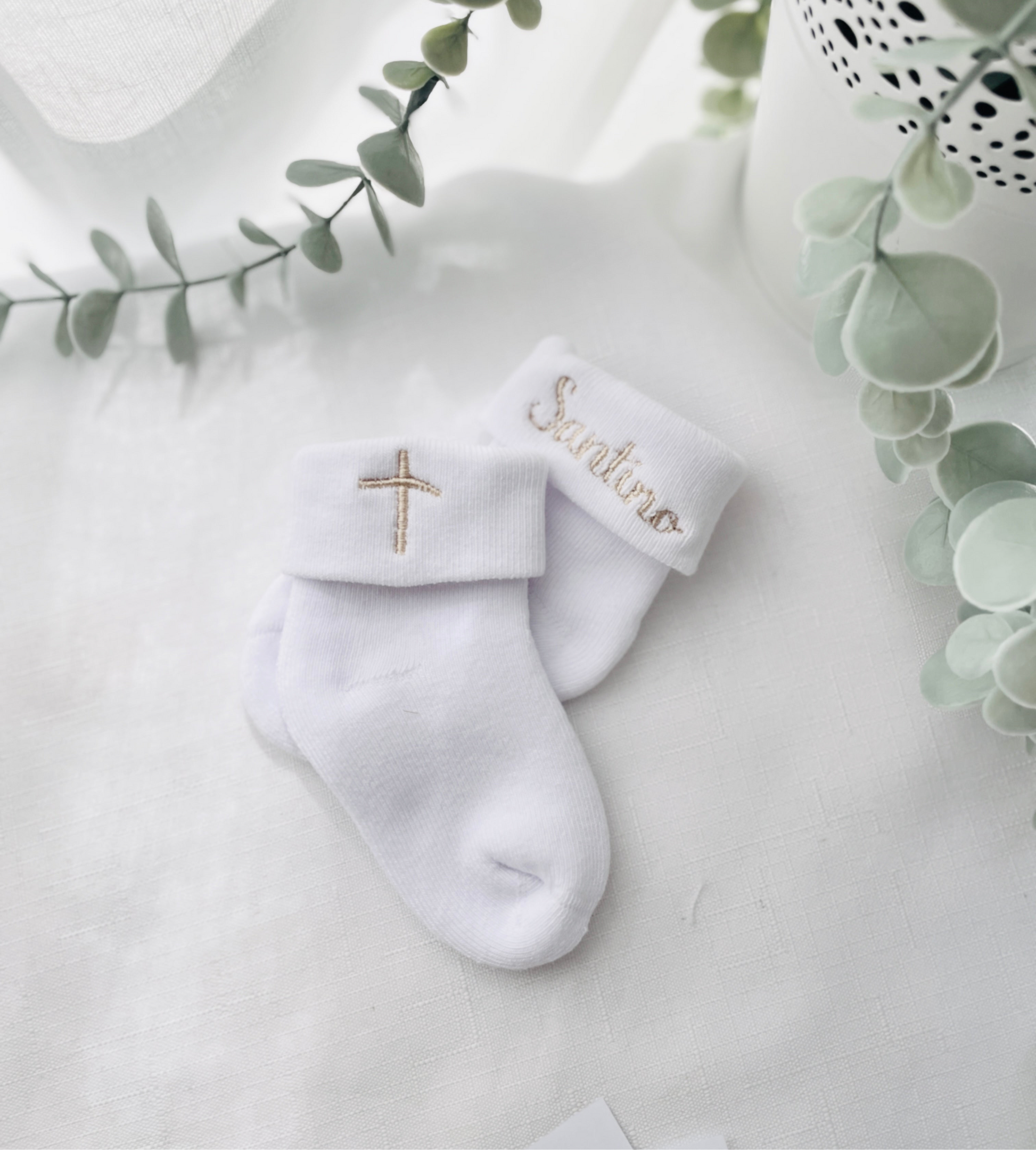 White short or long socks which can be embroidered with a name, date and/or a cross.