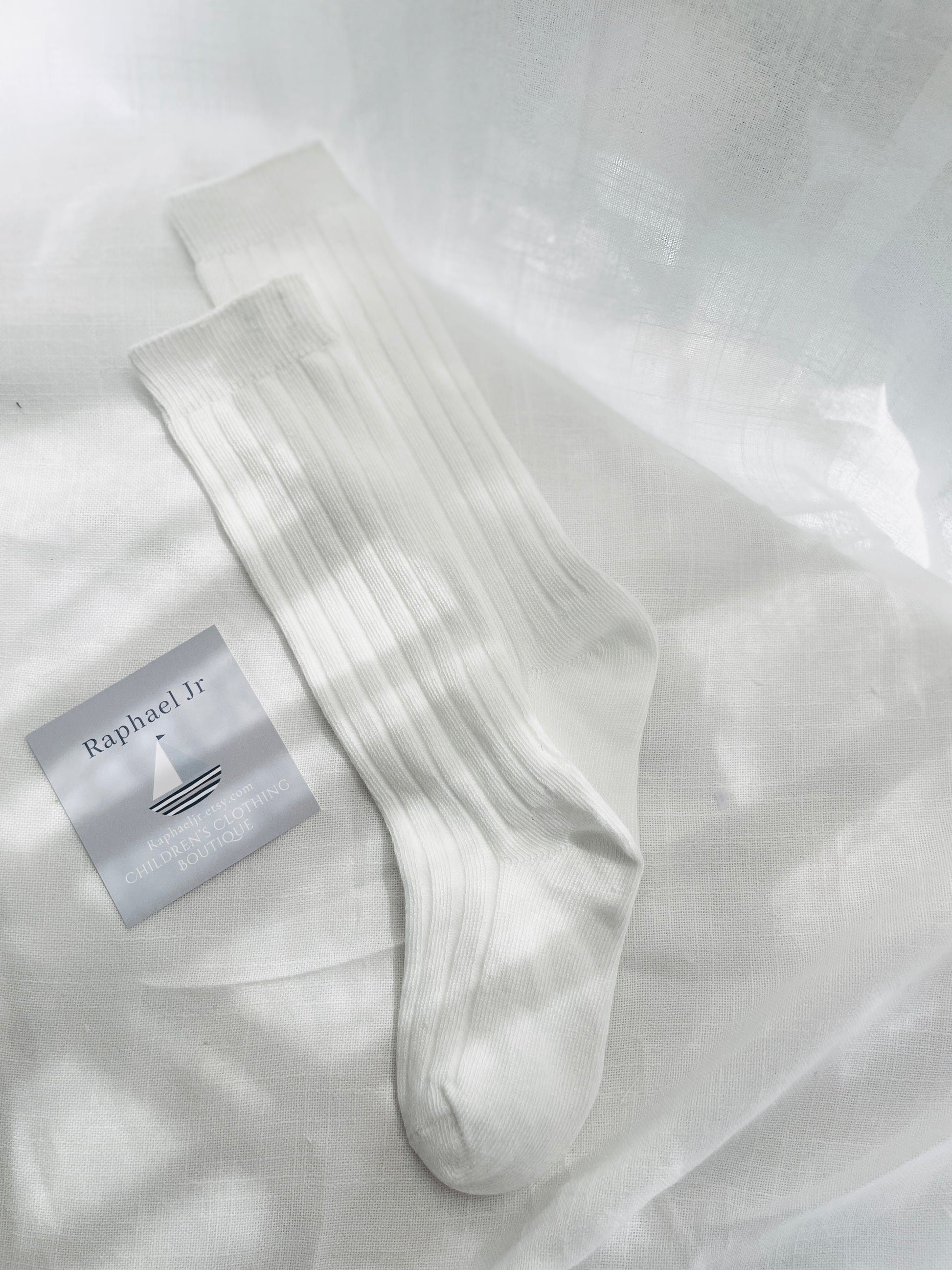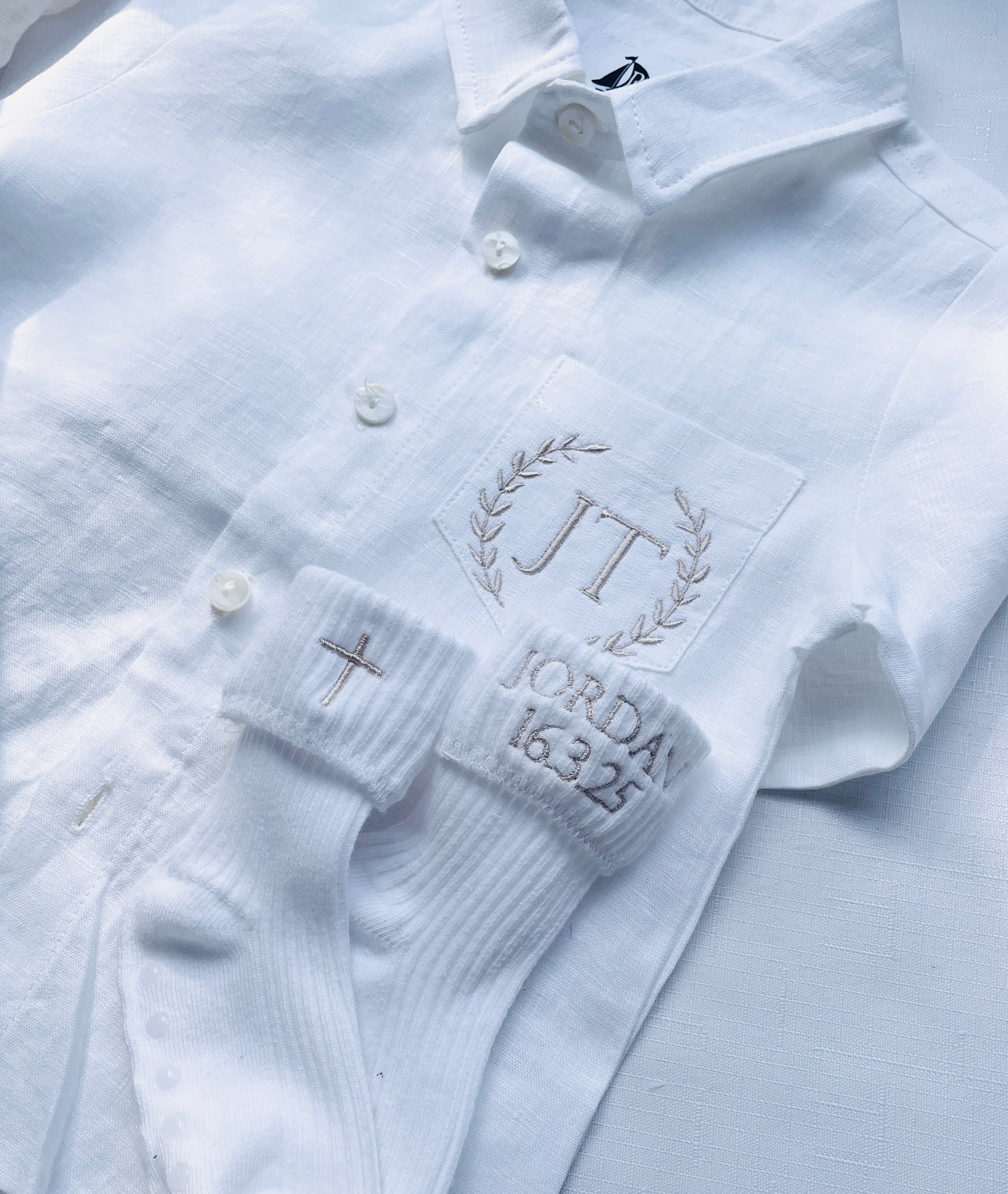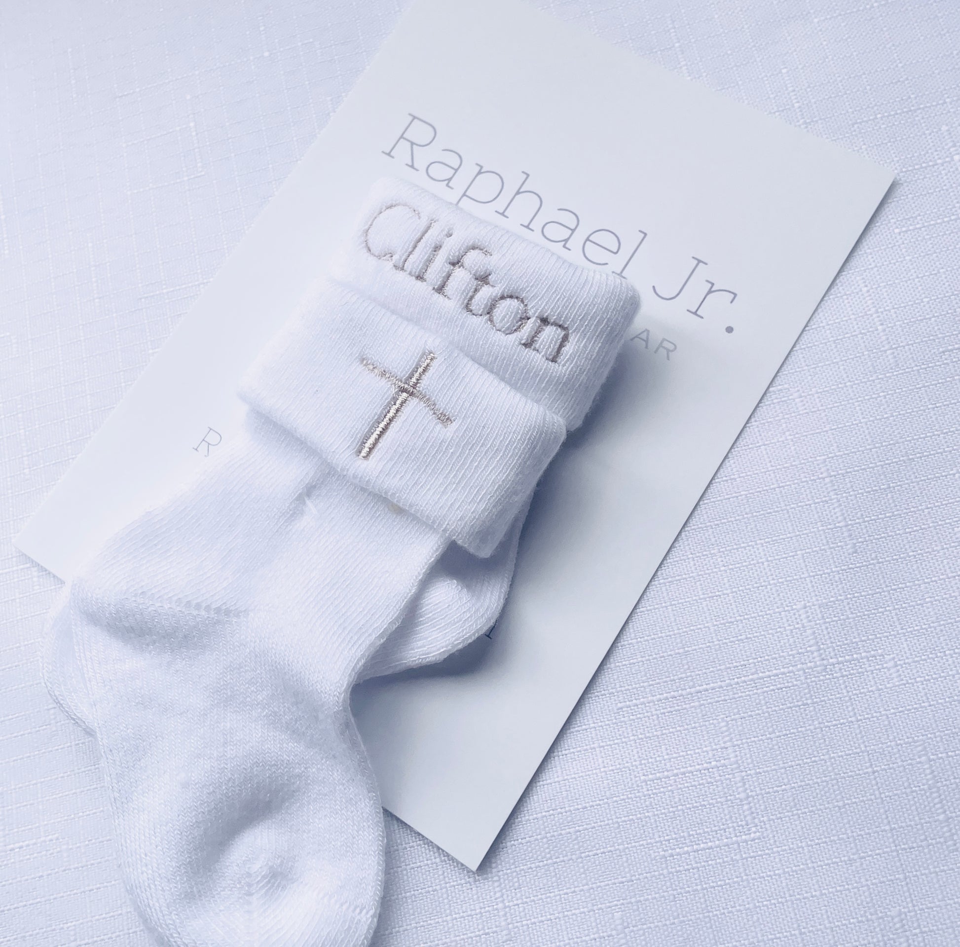 White short or long socks which can be embroidered with a name, date and/or a cross.