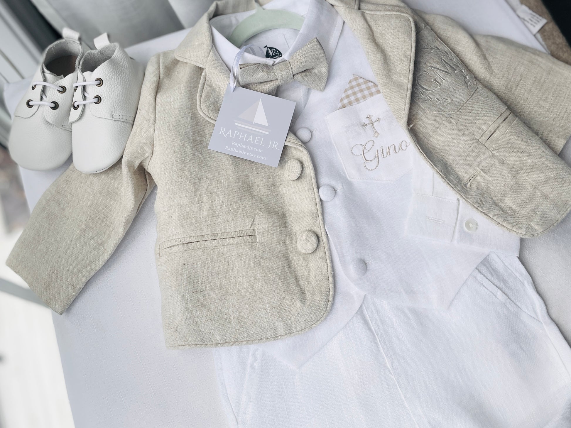 Add on an optional bowtie (colour of your choice), suspenders and/or embroidery. Classic styling with a modern touch, the blazer is perfect for ring bearers and page boys, christening, baptisms, birthdays and any special event. Machine washable, durable, soft and breathable linen, and gentle cotton (100%) lining soft on baby's skin.