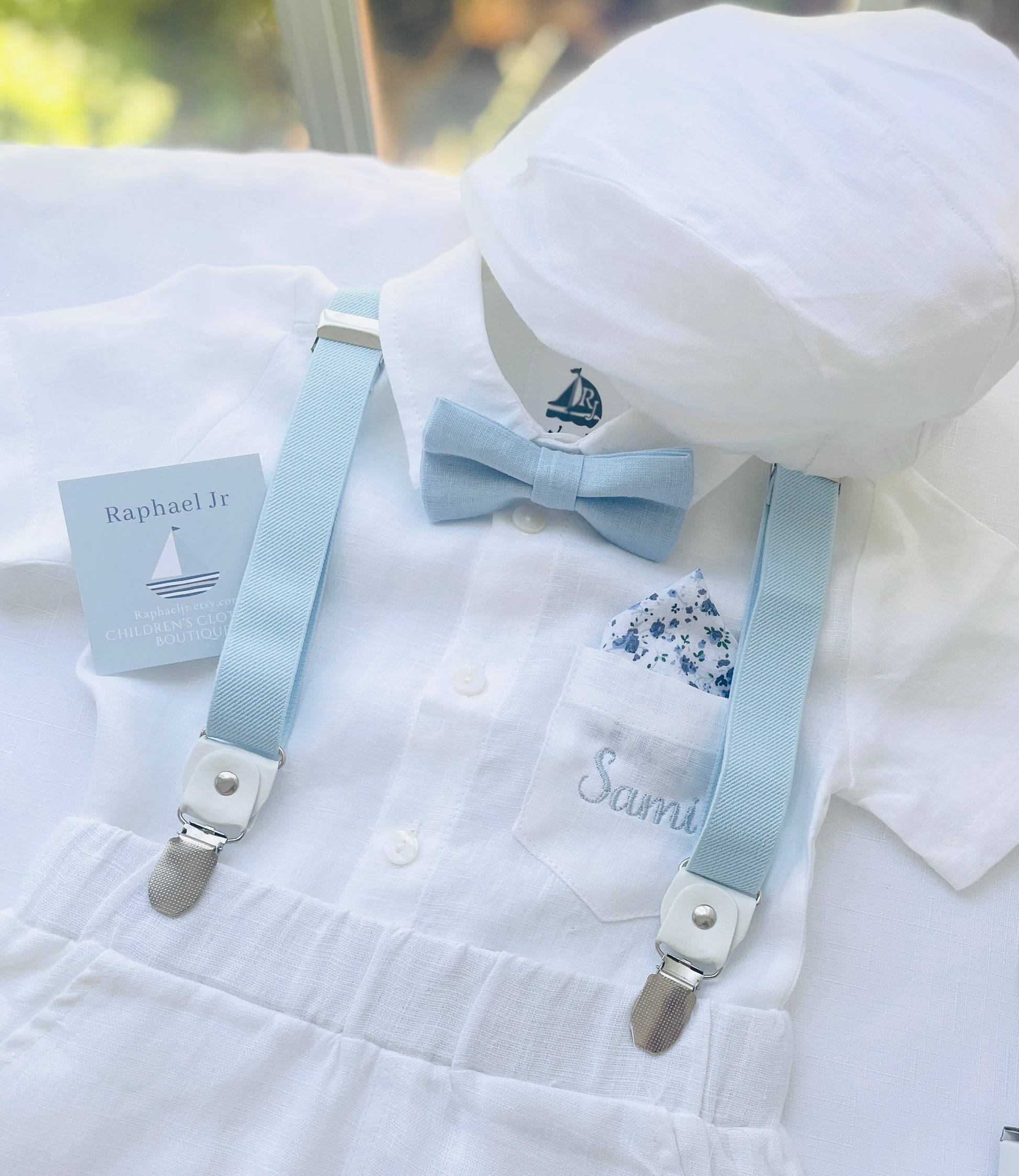 Pure white linen outer, white cotton lining. Handmade paperboy cap for your little boys birthday, wedding or Baptism.