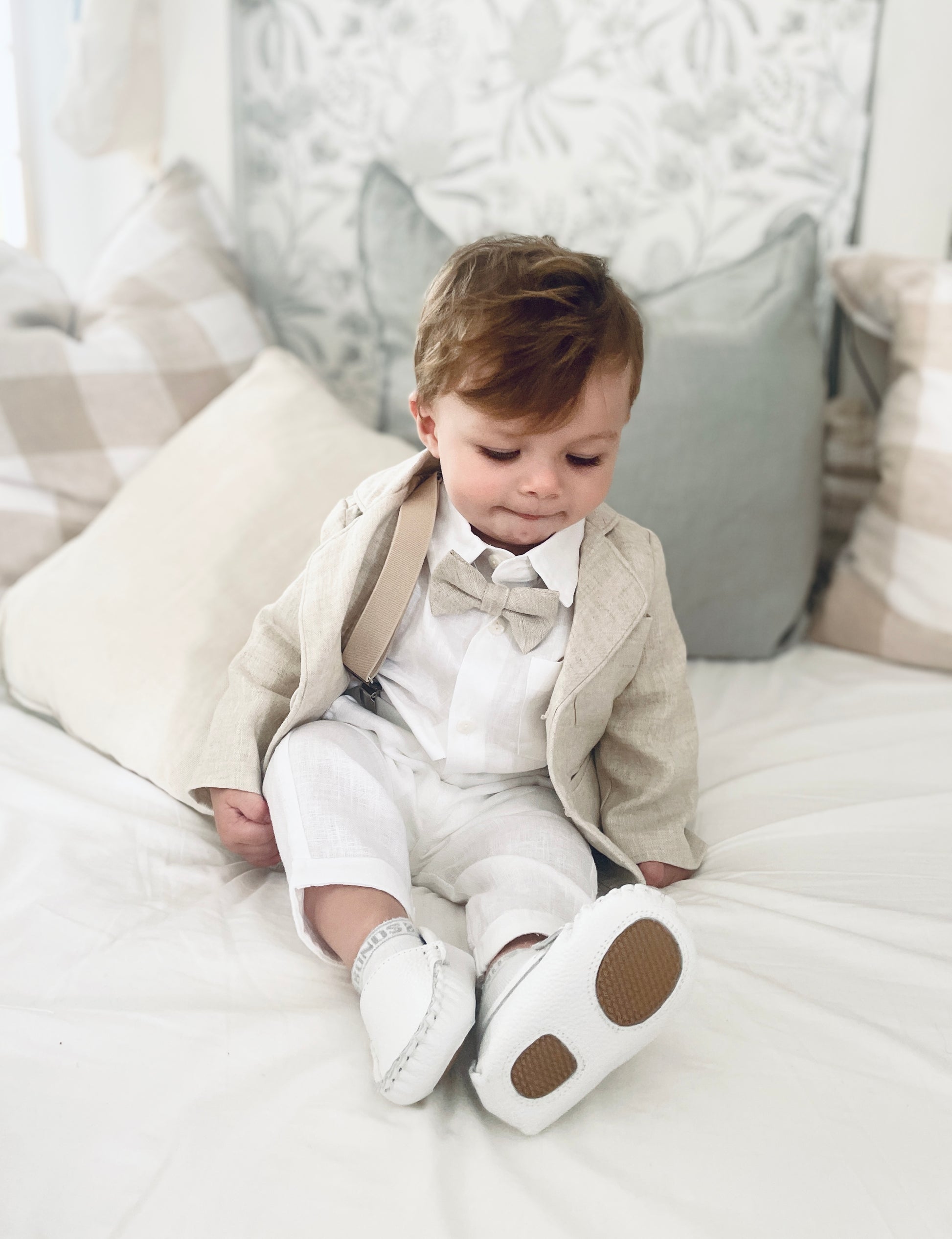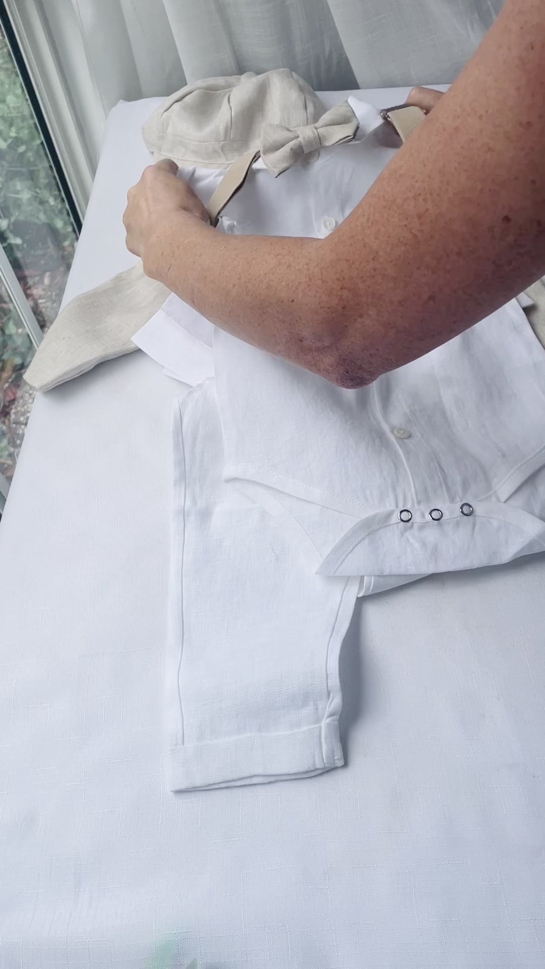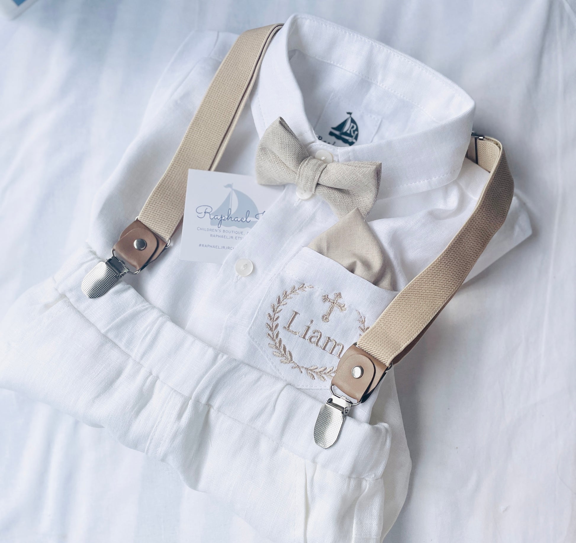 Gorgeous pure linen shirt, with pants, suspenders and Bowtie to match. Standard set comes with the white linen pants, shirt, beige suspenders and bow tie, checkered beige pocket square.