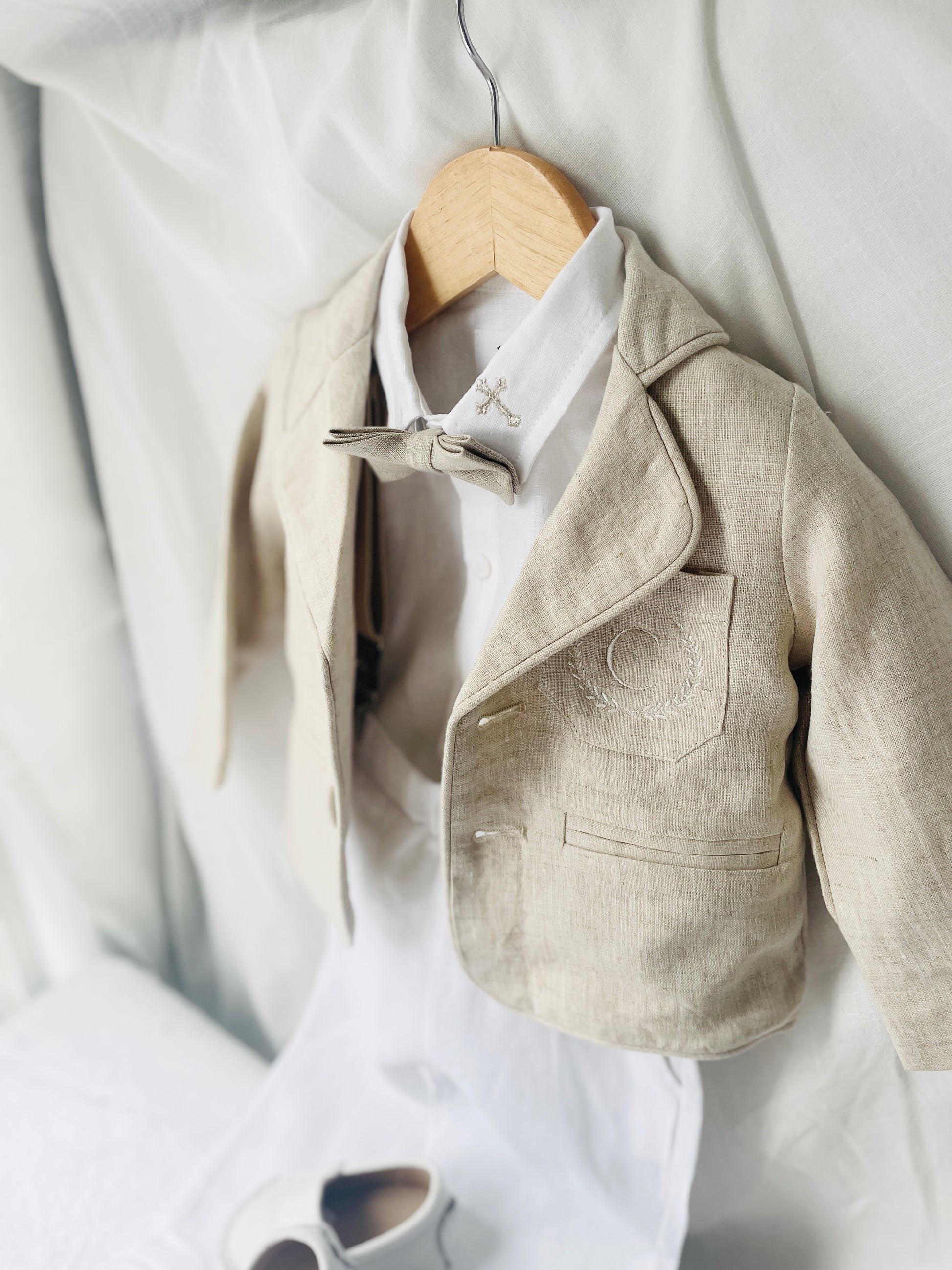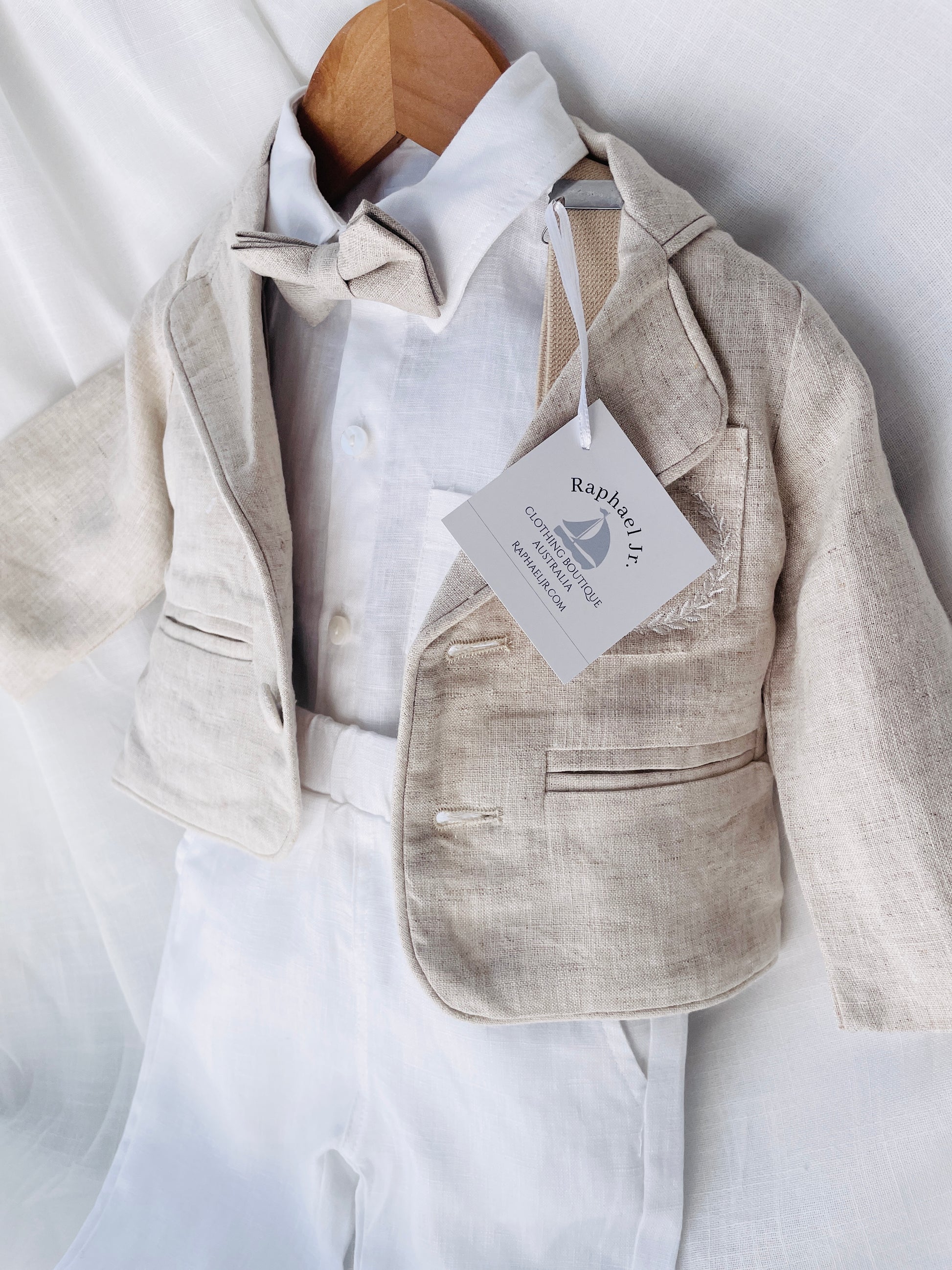White and Beige Linen Set with optional Jacket Accessories and Embroidery Available