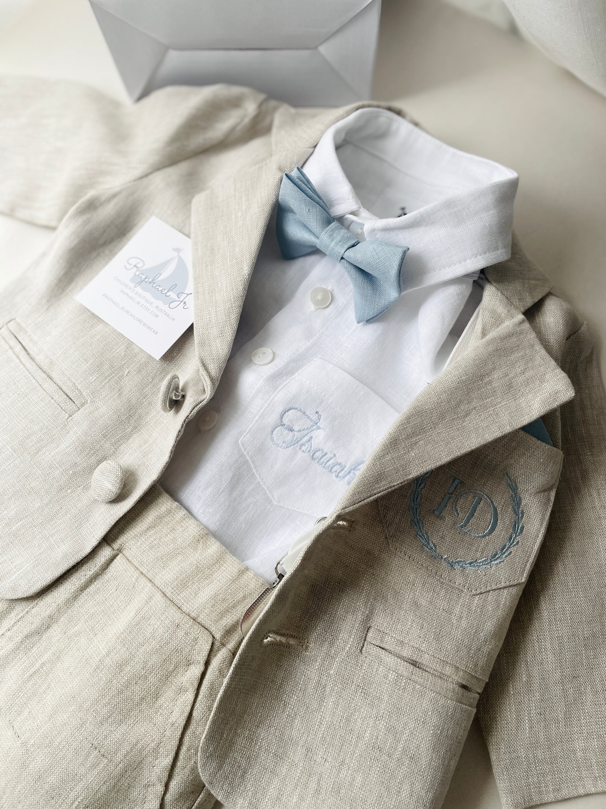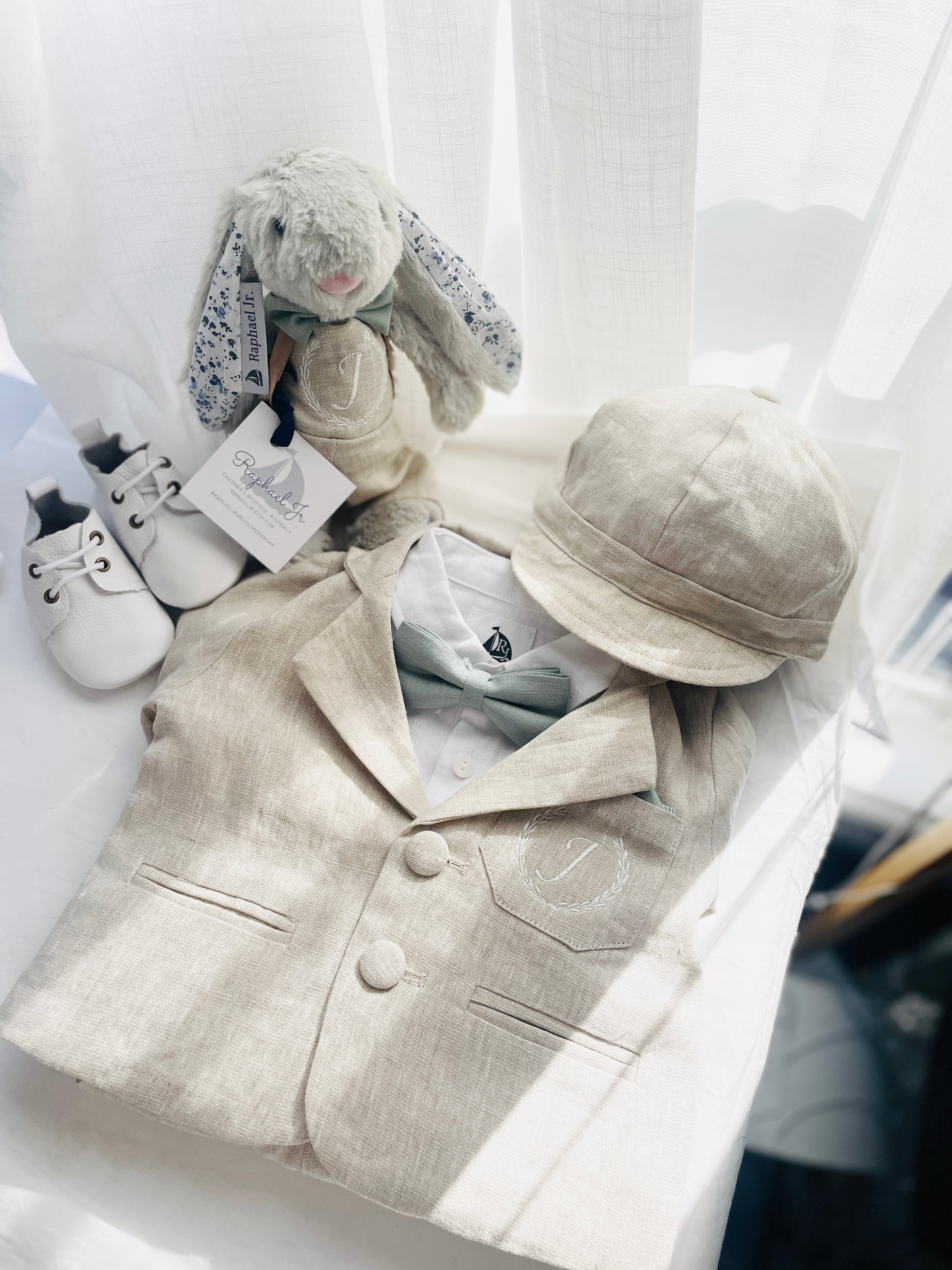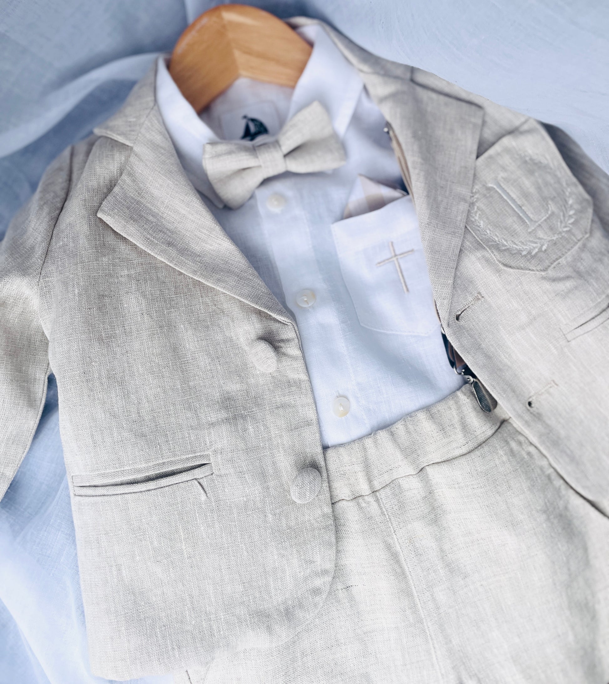 Beige linen baby and toddler boys formal baptism or wedding suit with accessories and optional personalisation