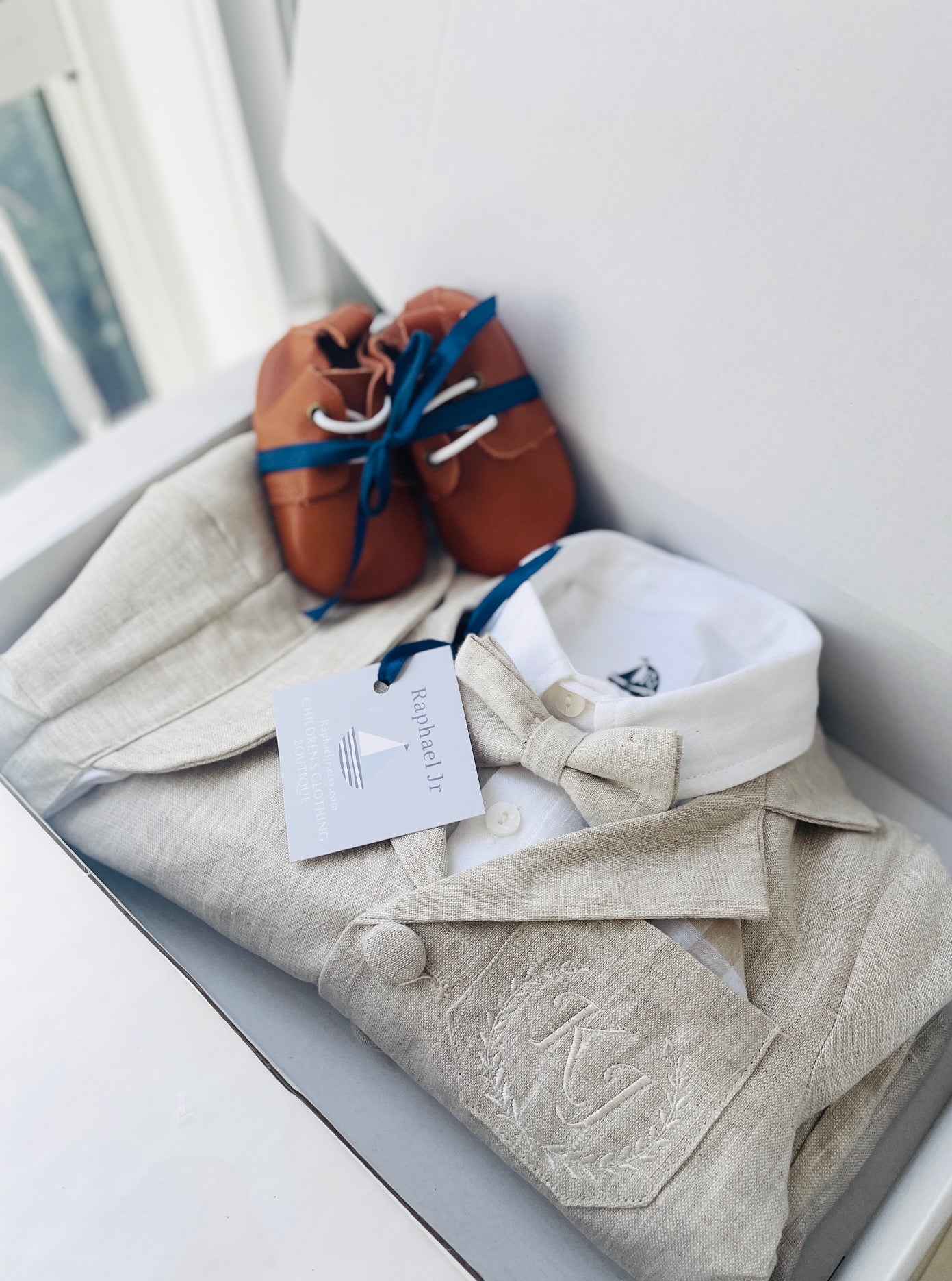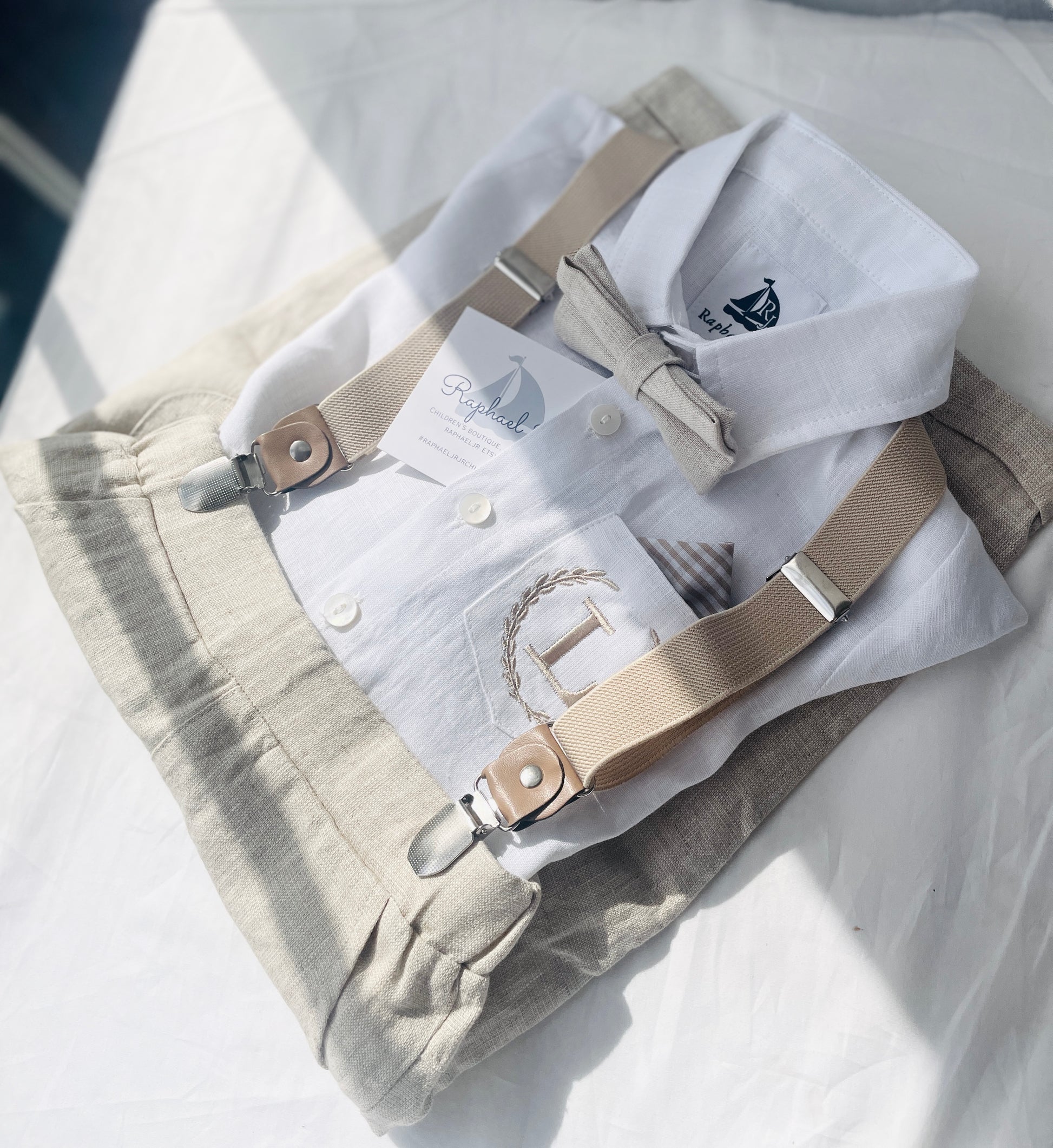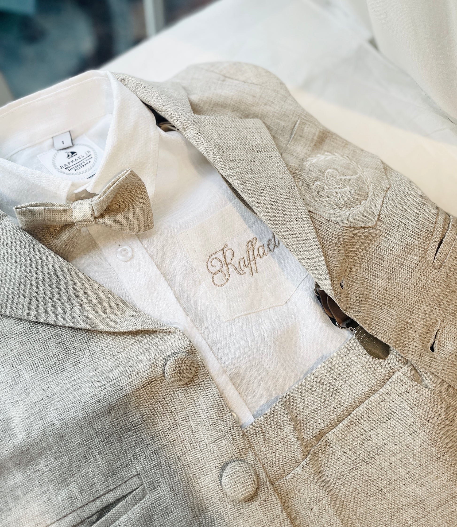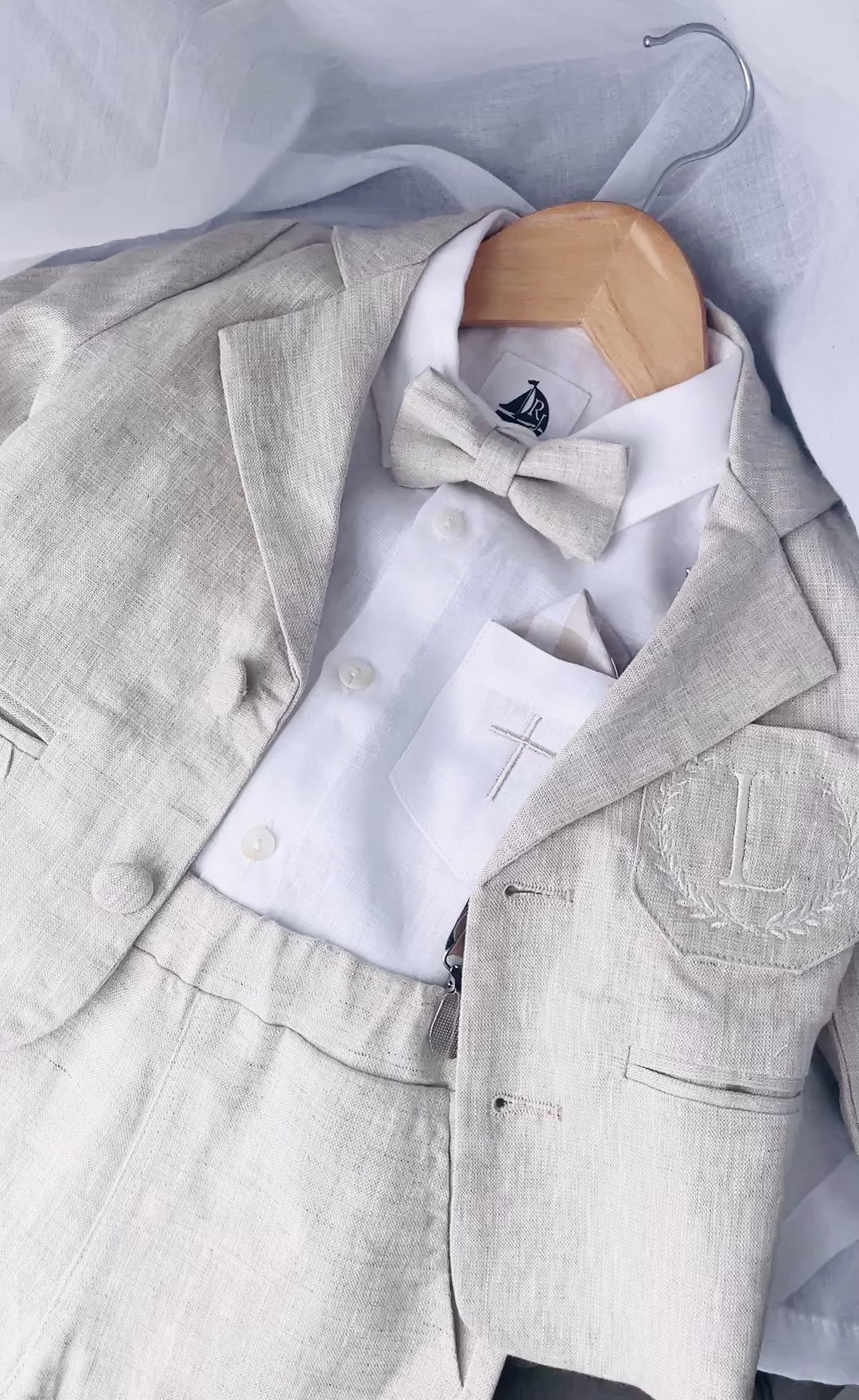 Beige linen baby and toddler boys formal baptism or wedding suit with accessories and optional personalisation