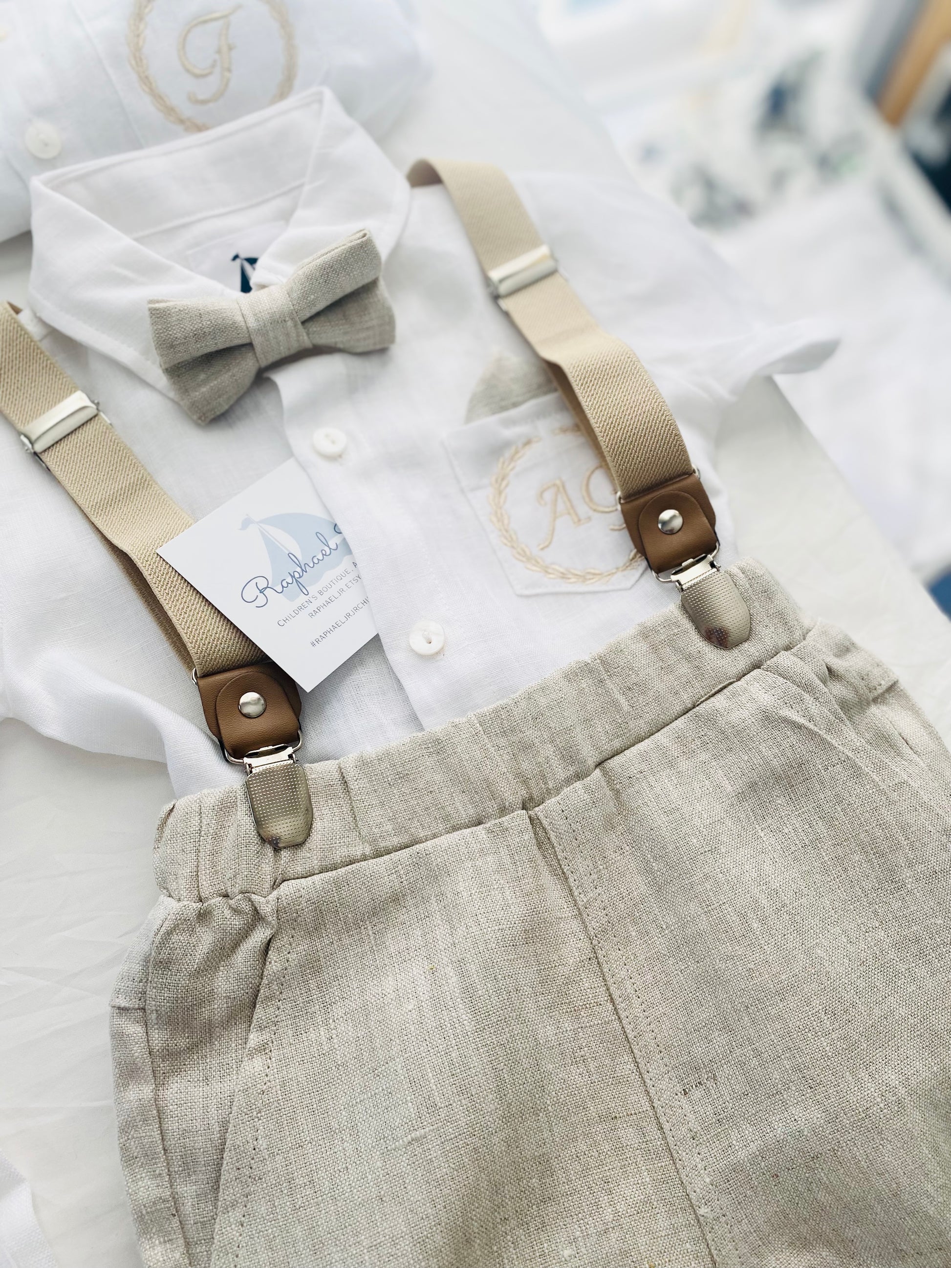 Gorgeous pure linen shirt, with pants, suspenders and Bowtie to match. Durable, stylish, formal attire made with the highest quality natural fabrics, for a classic baptism look with a modern twist. Many bow tie colour schemes are available to fit your theme, please check the photos for available colours (and feel free to request a specific colour to match your theme!).