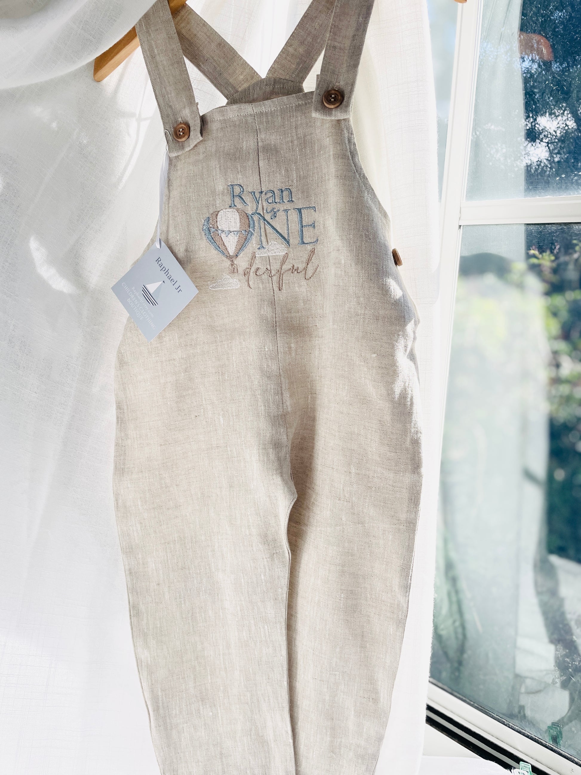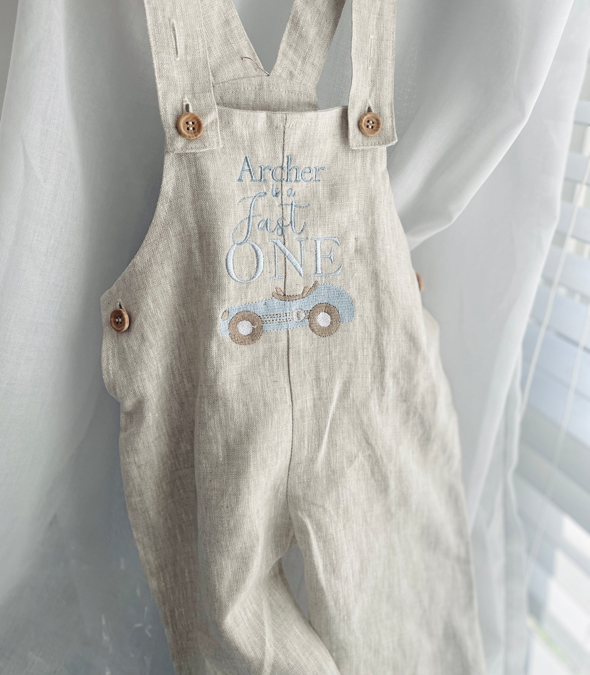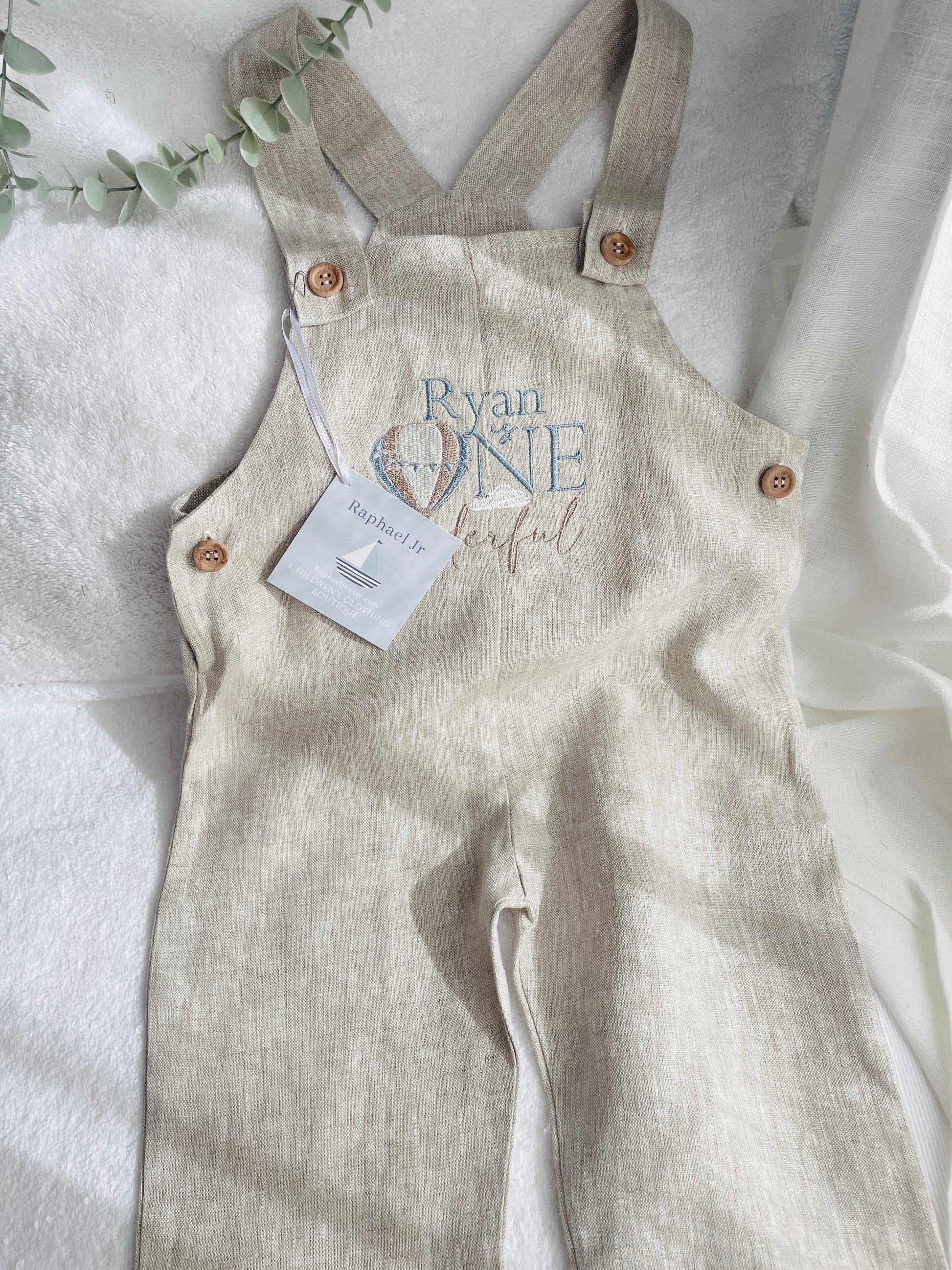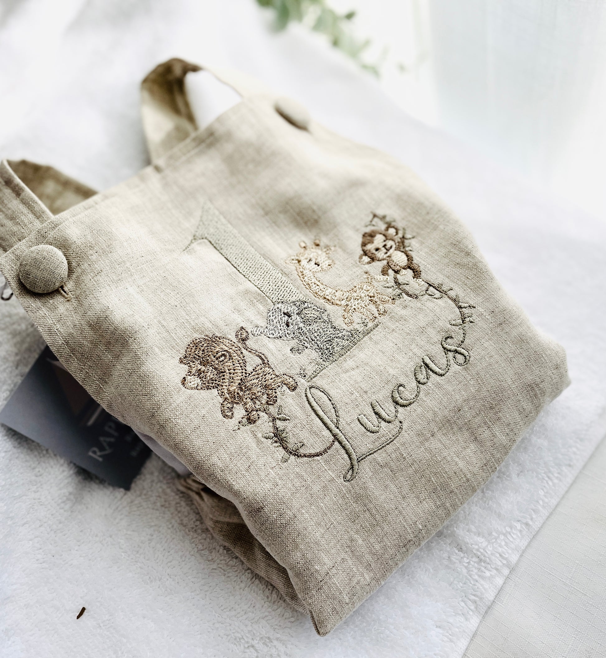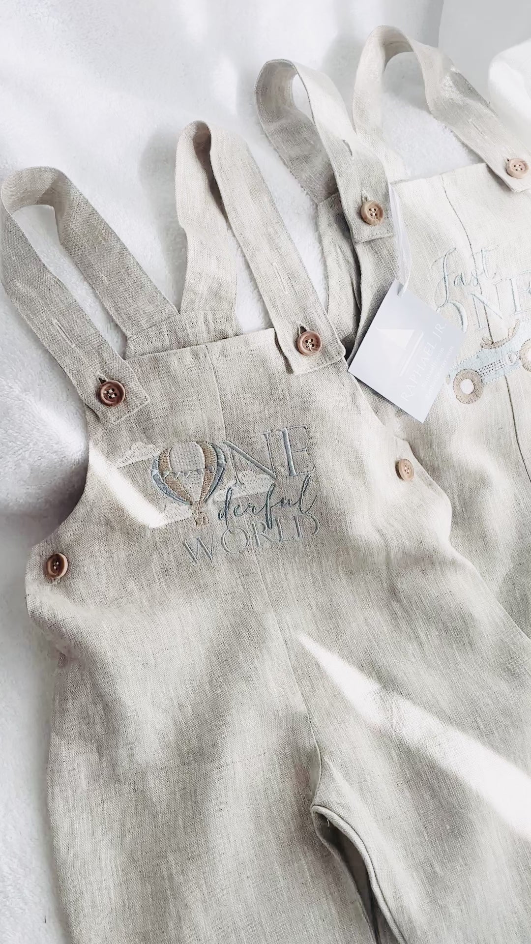 Boys Beige Linen Birthday overalls romper dungarees safari balloon fast car wild sea themes