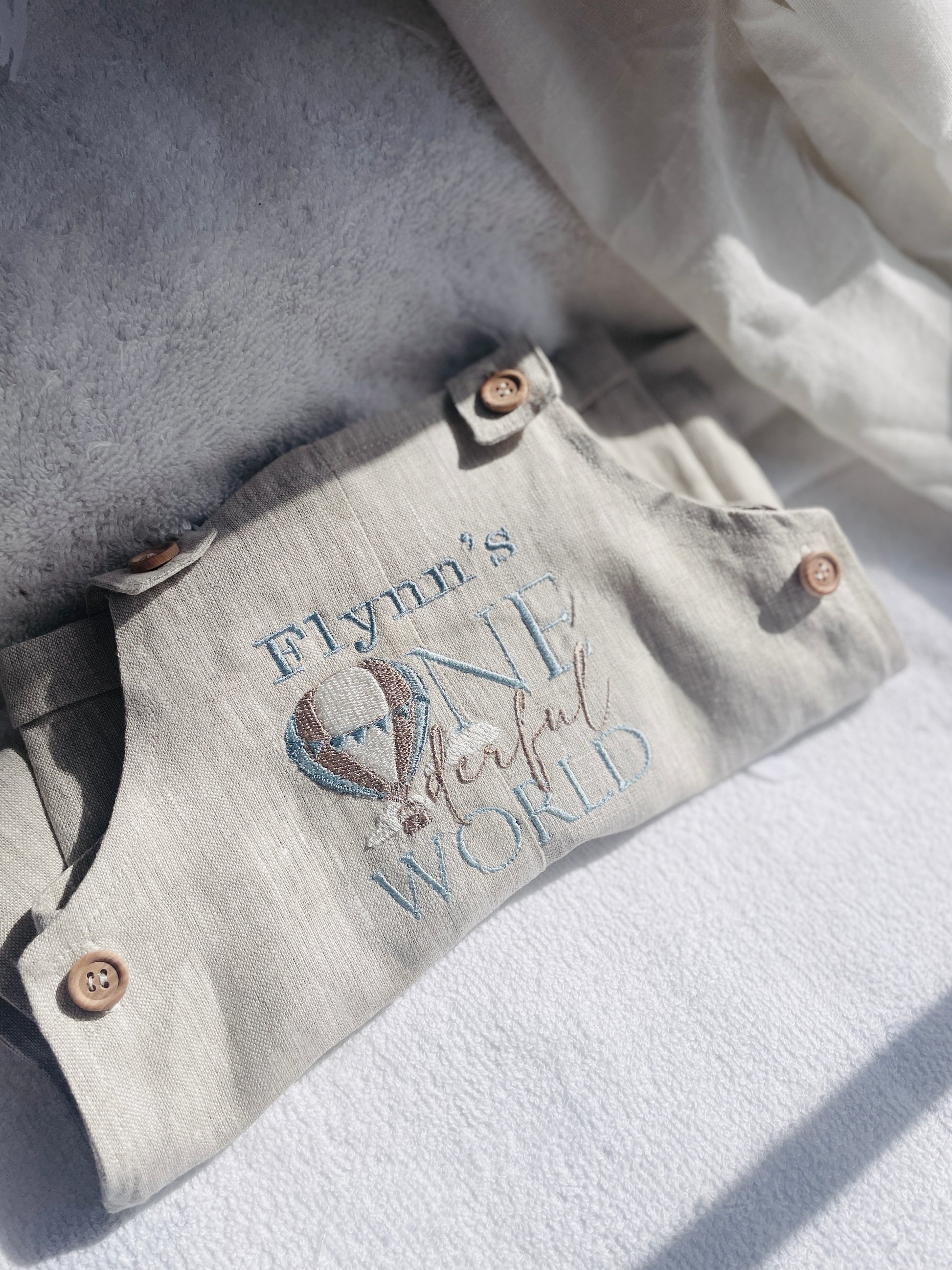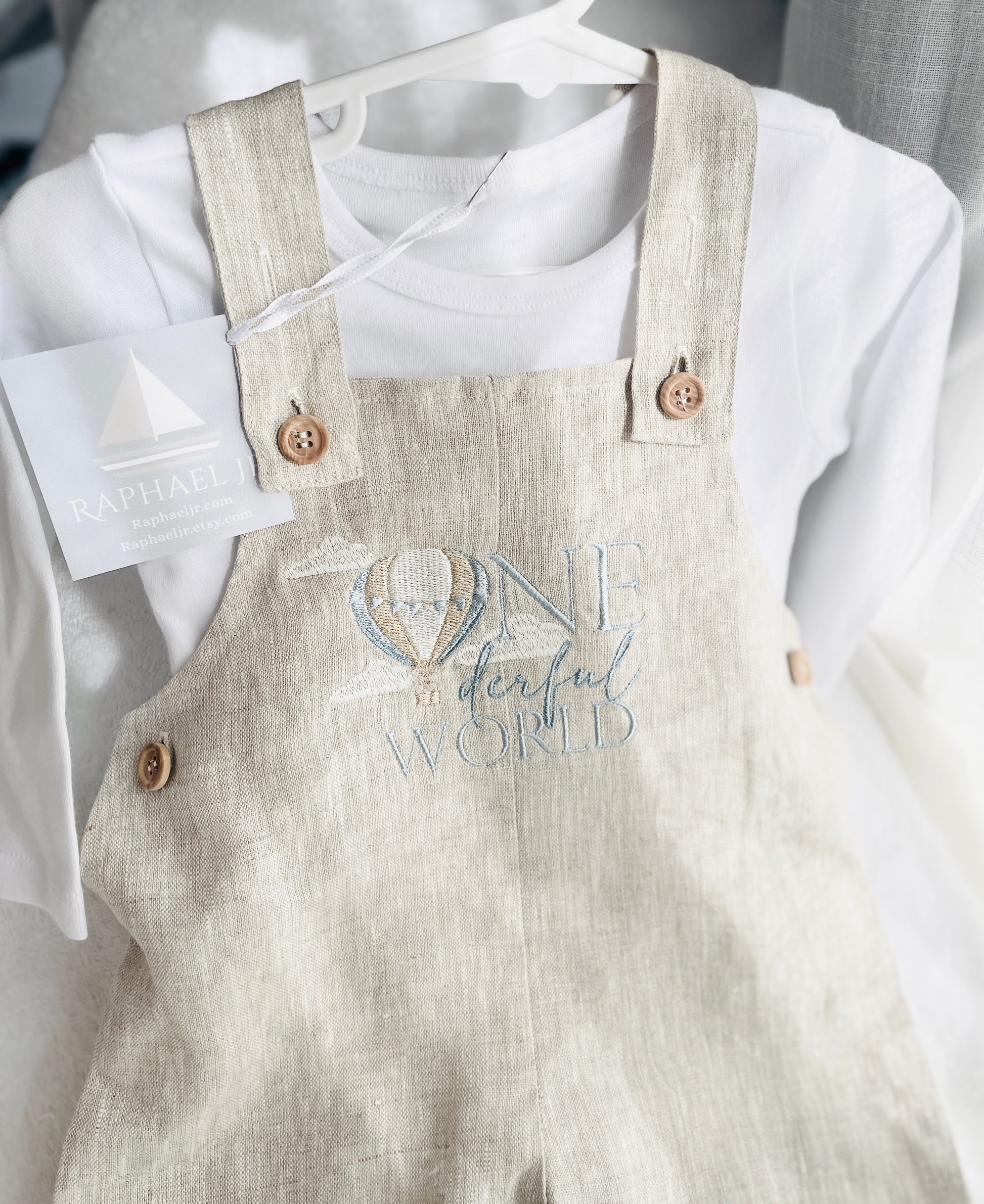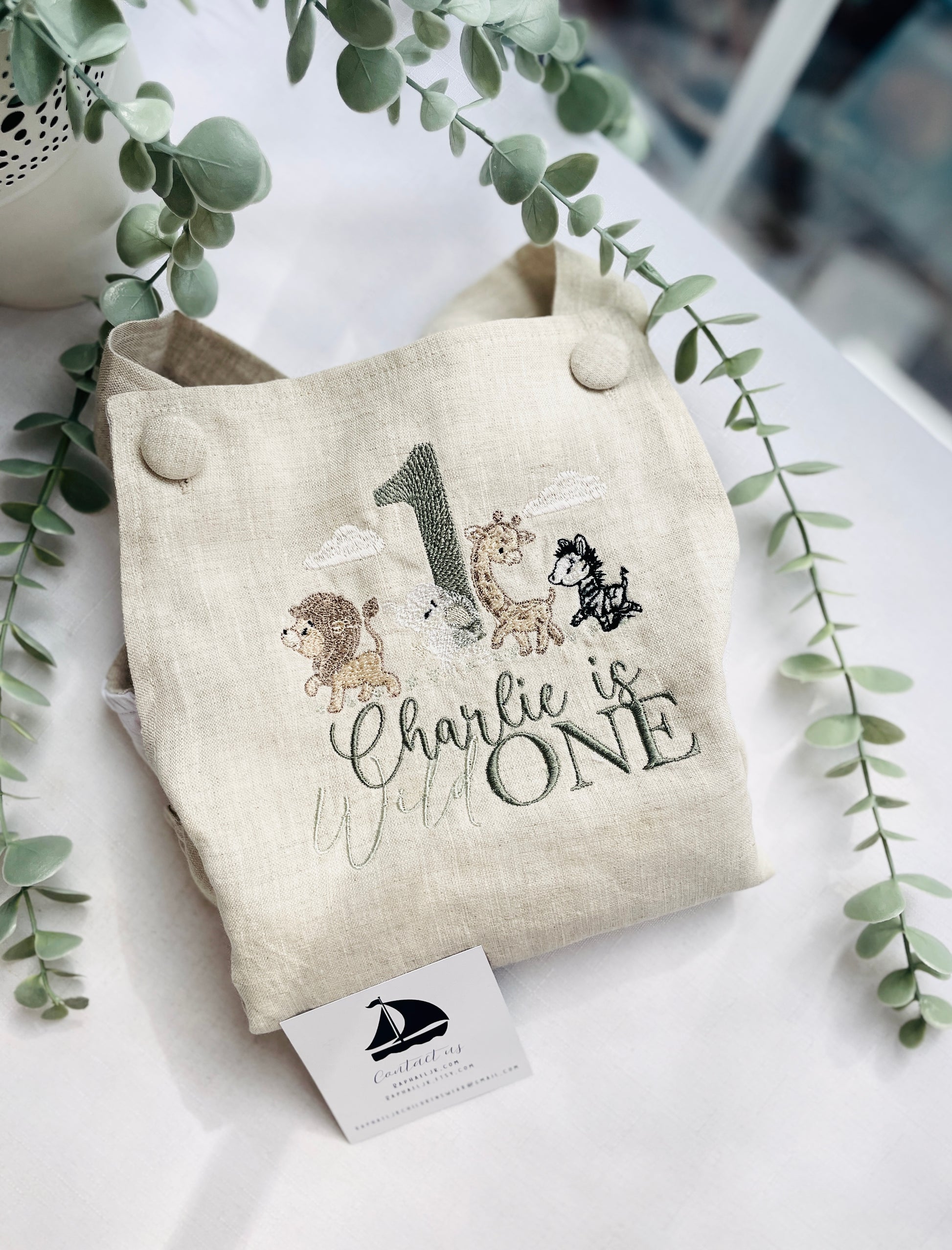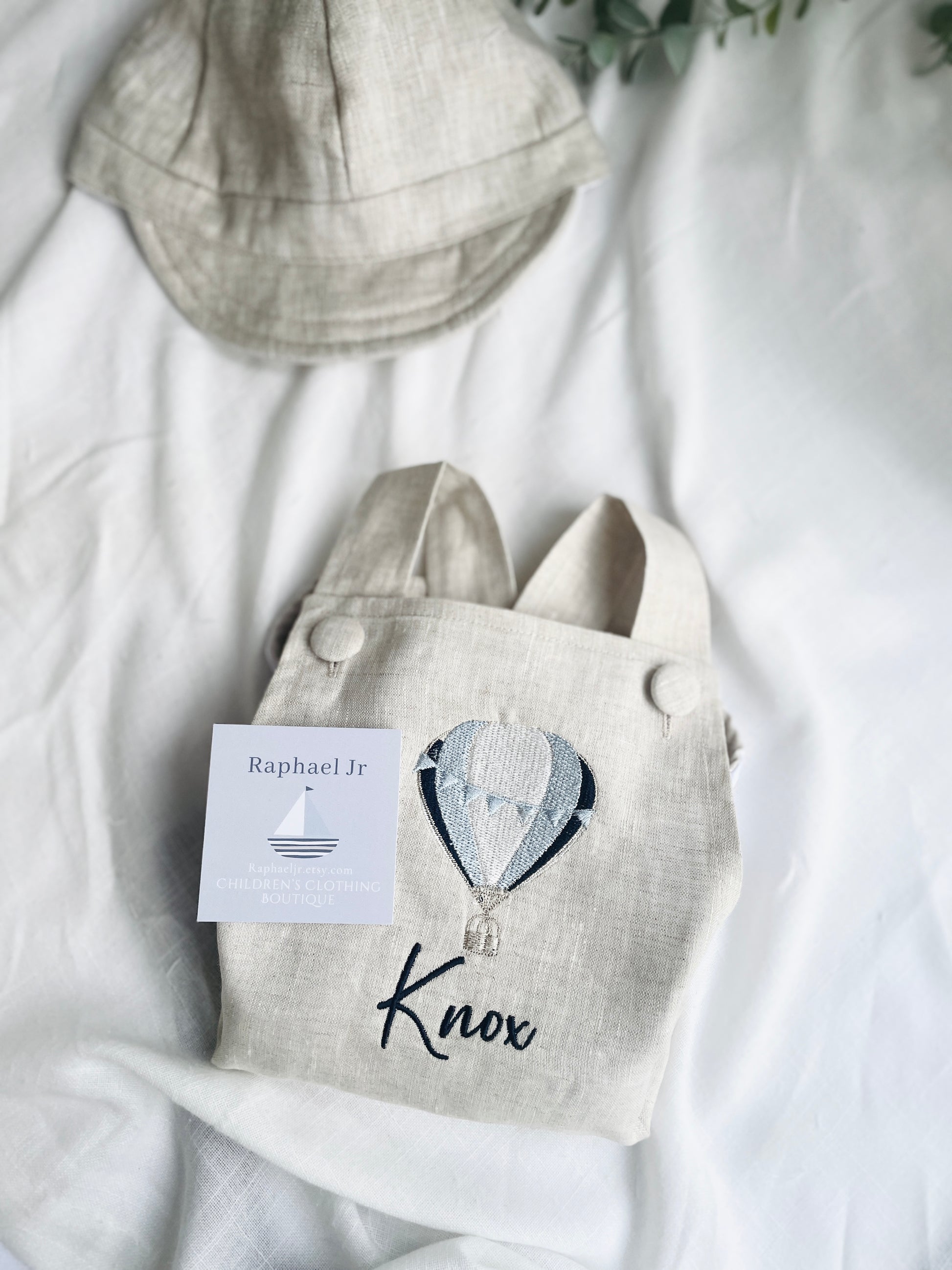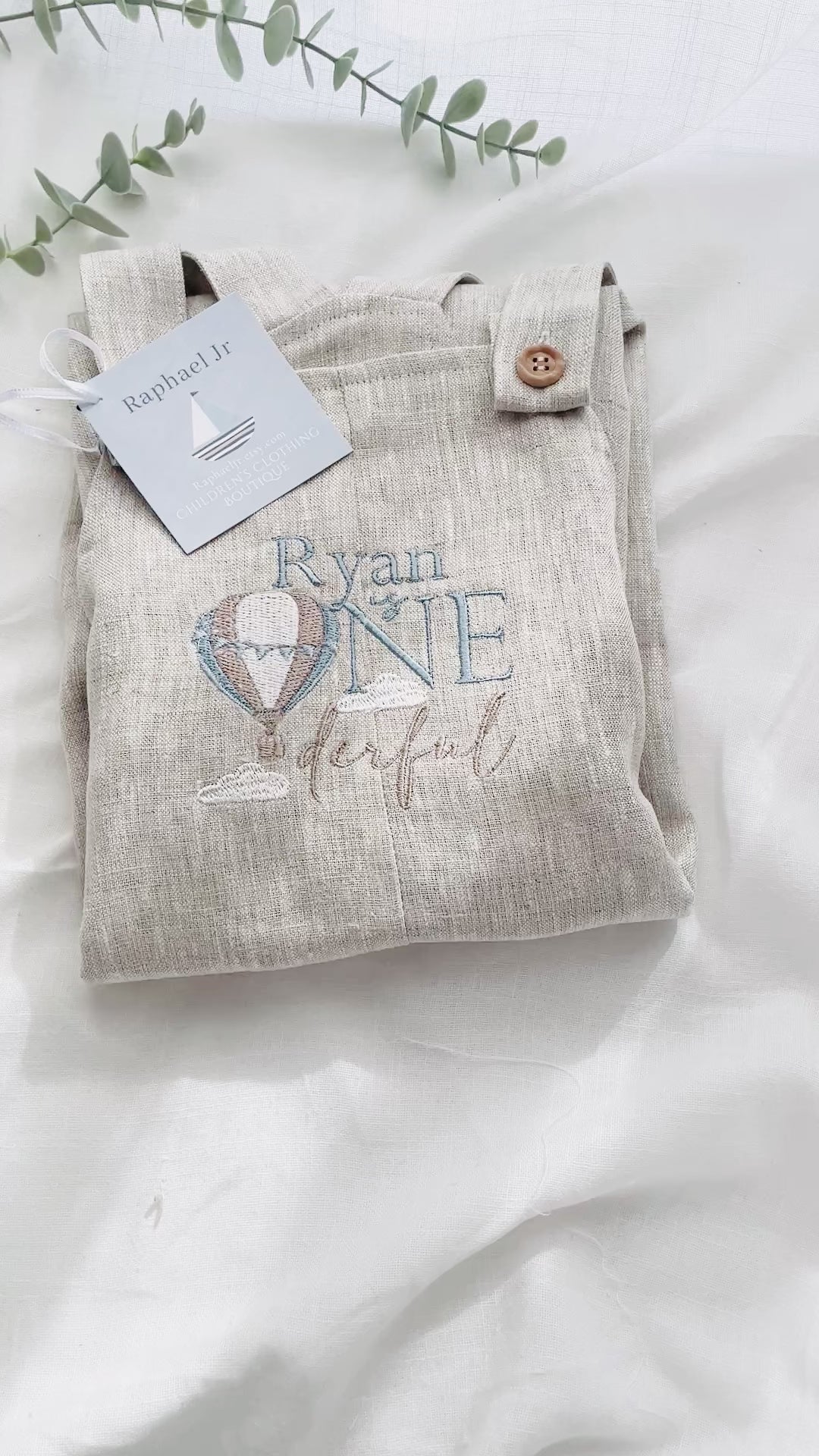 Boys Beige Linen Birthday overalls romper dungarees safari balloon fast car wild sea themes