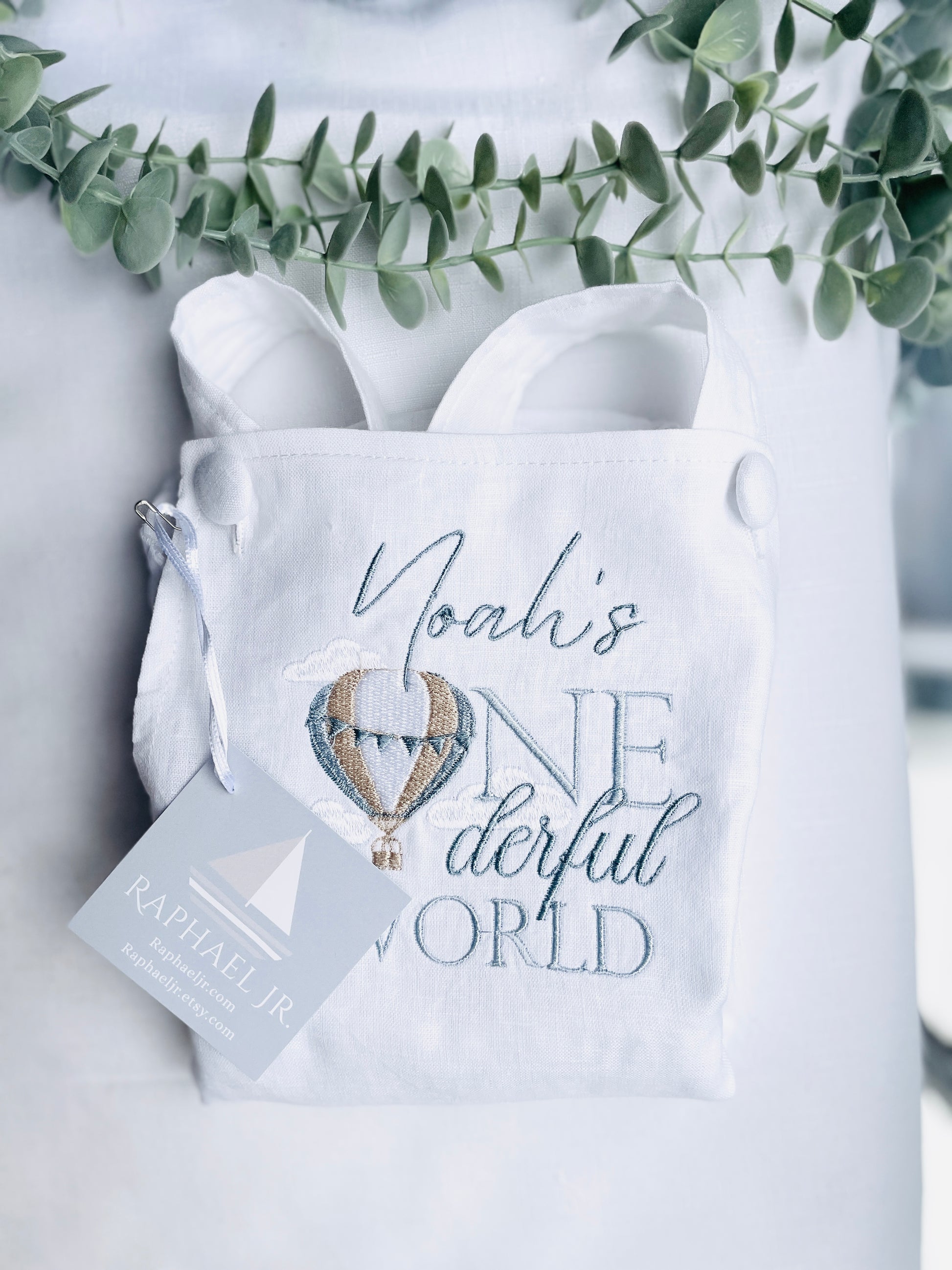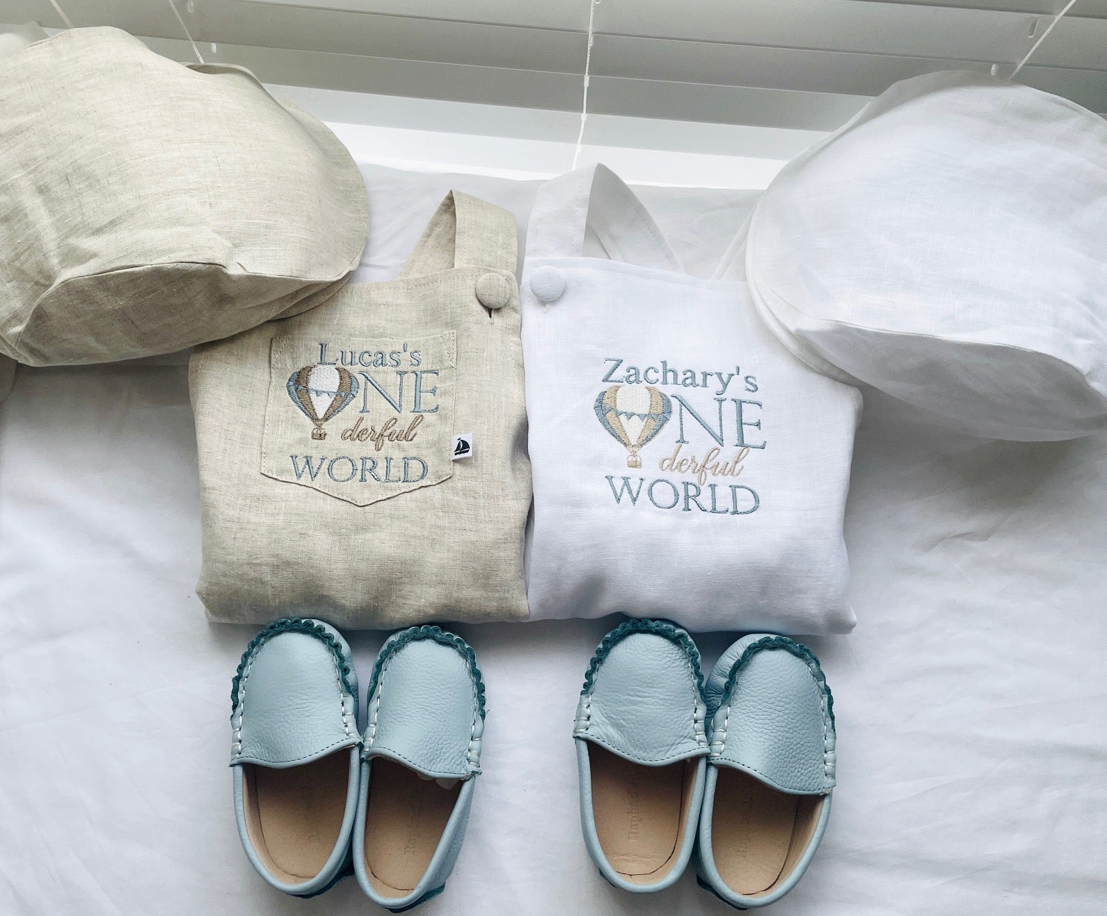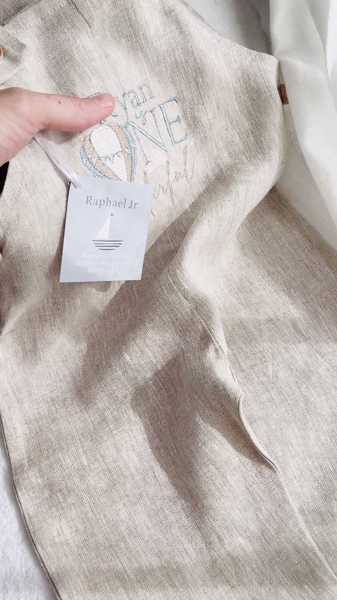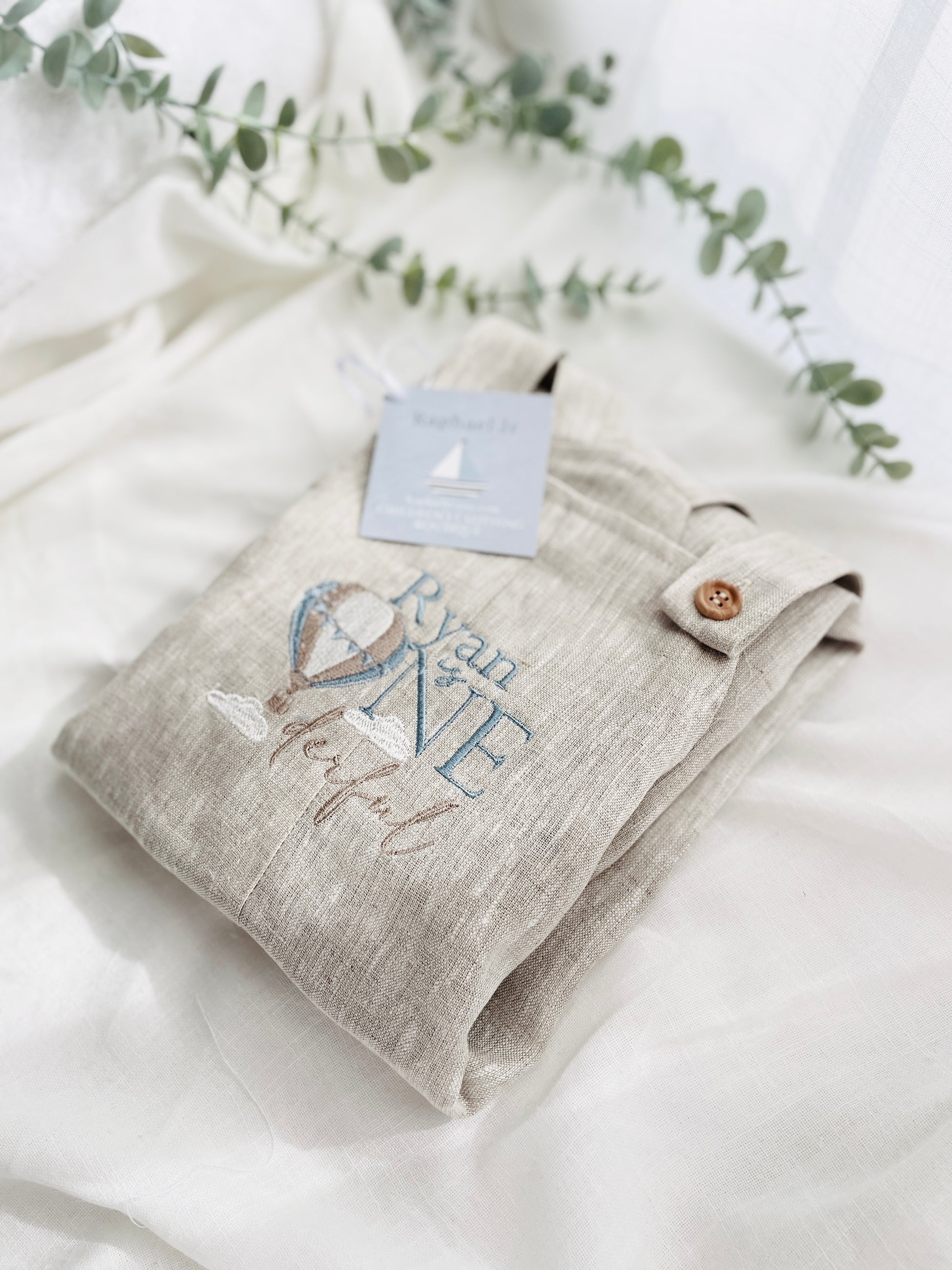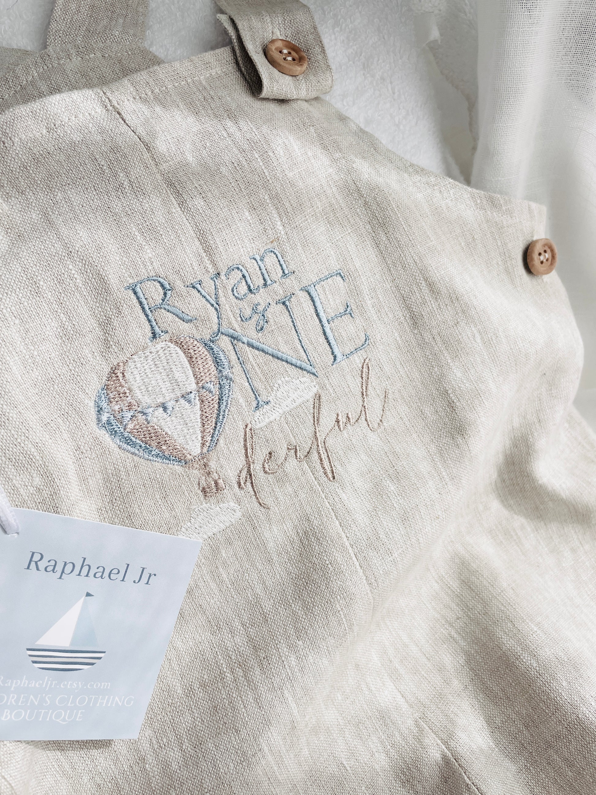 Boys Beige Linen Birthday overalls romper dungarees safari balloon fast car wild sea themes