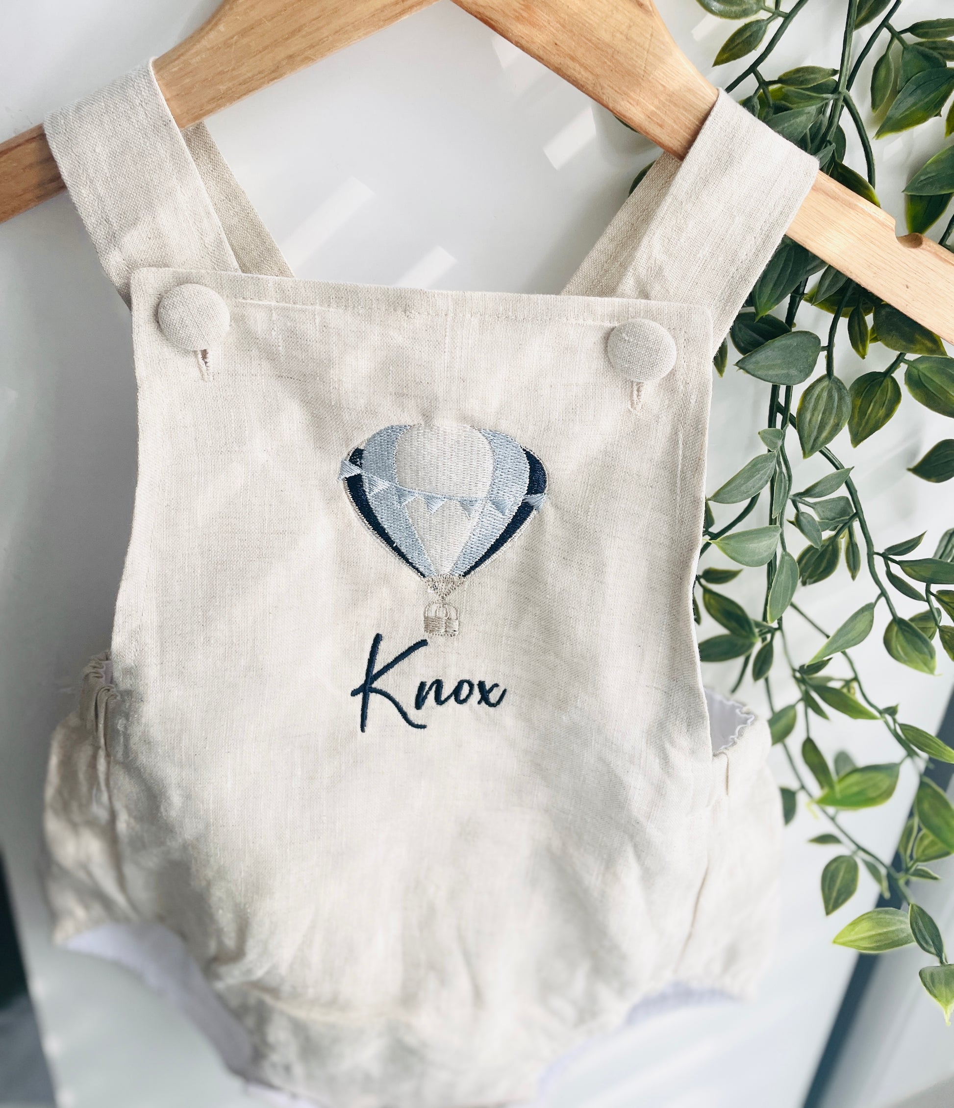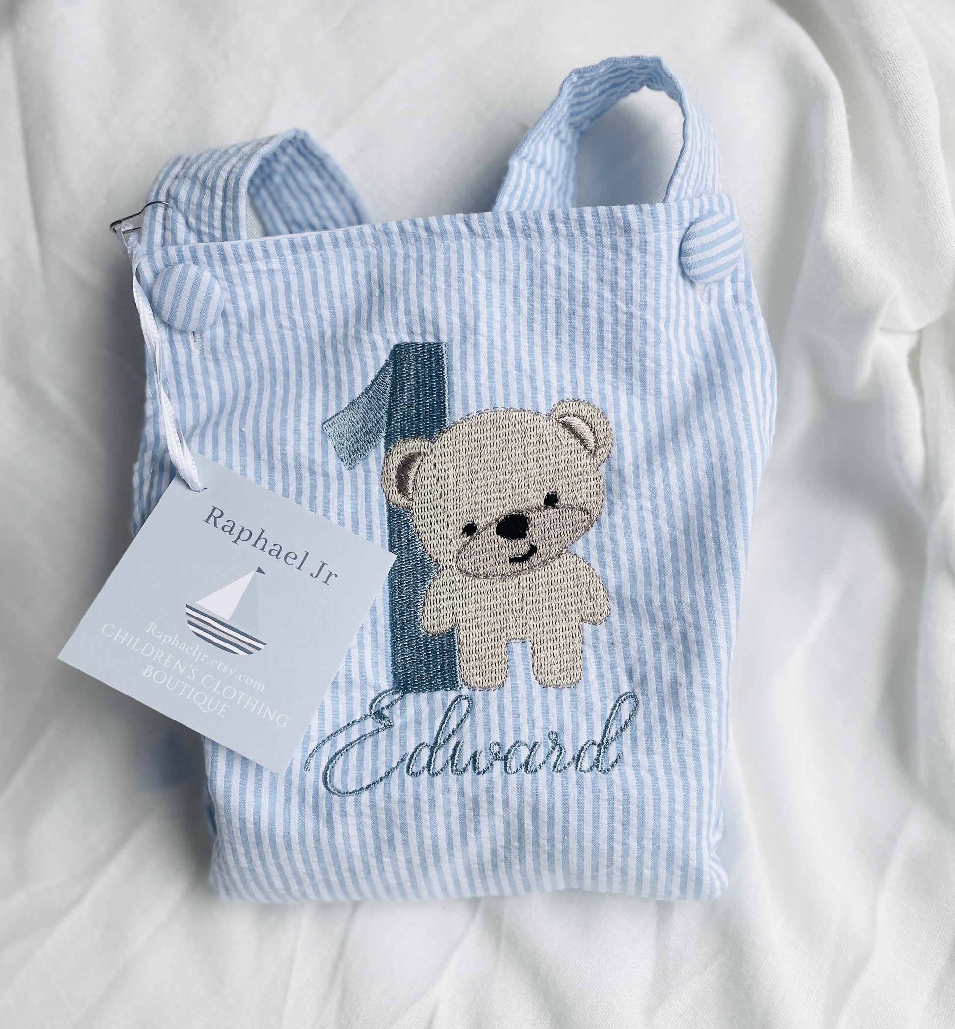 Gorgeous pale blue and white seersucker cotton, white cotton lined romper with optional embroidery.