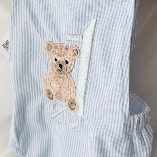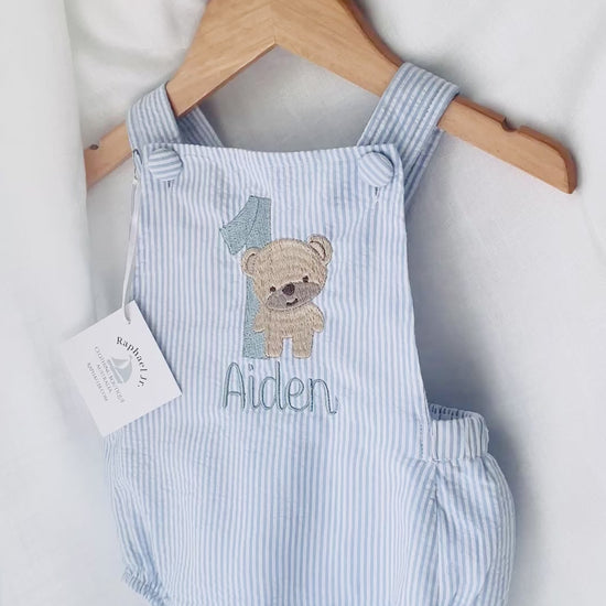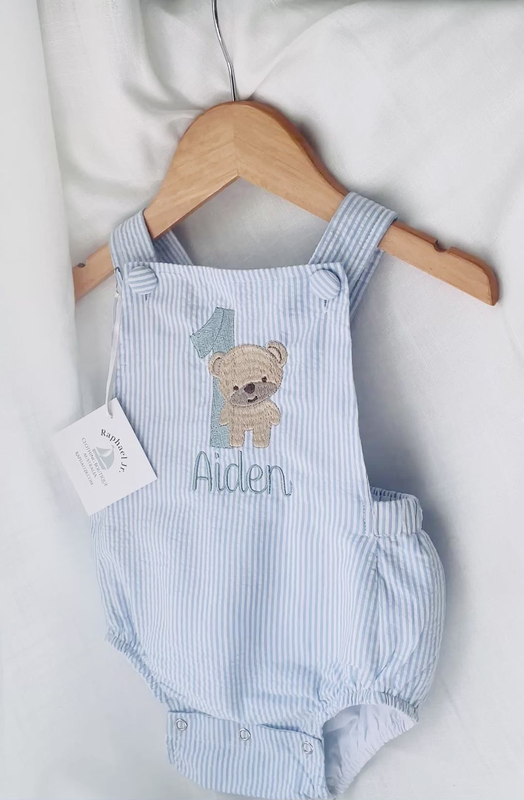 Gorgeous pale blue and white seersucker cotton, white cotton lined romper with optional embroidery.