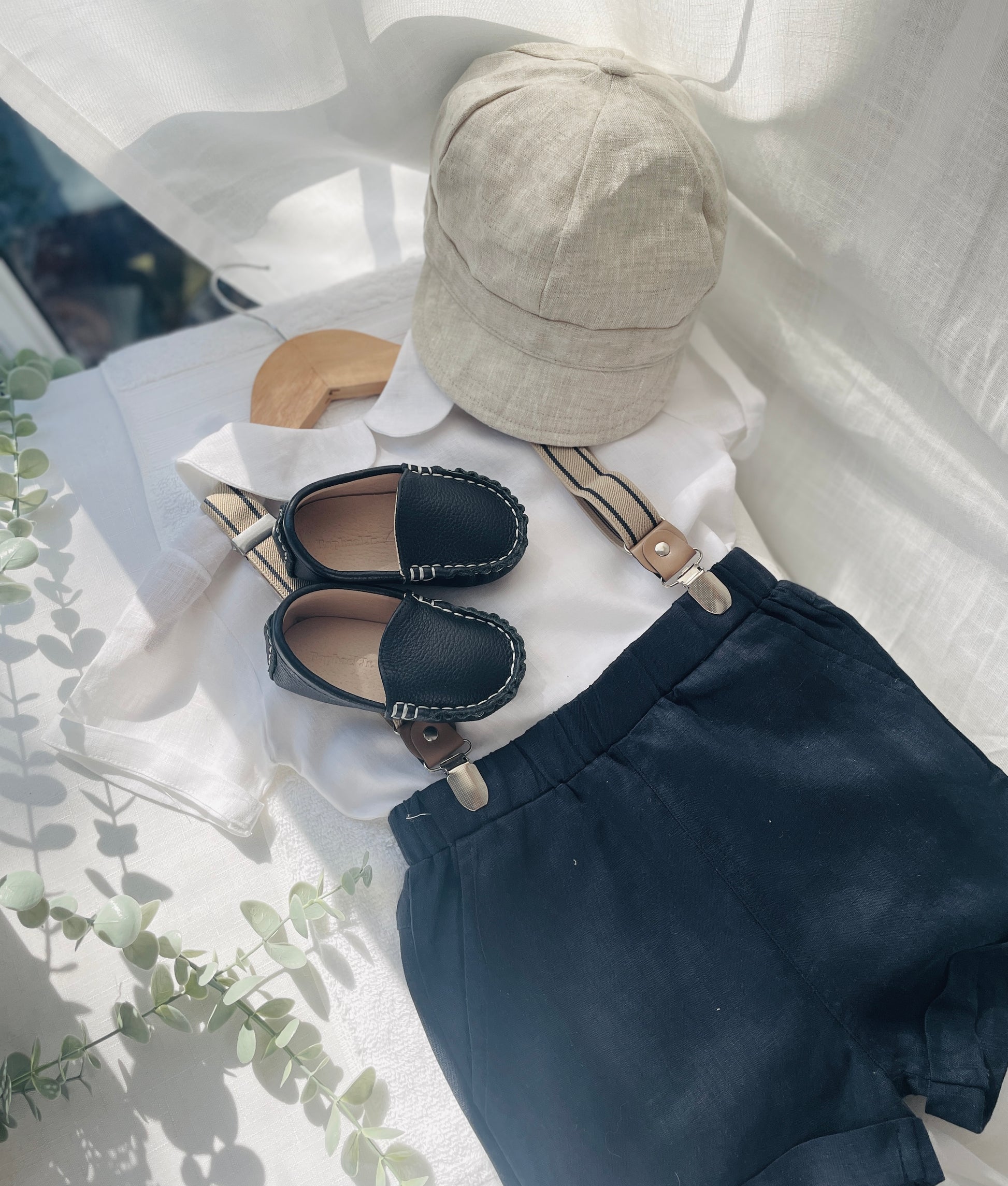 White 100% linen shorts with elastic waistband. Add suspenders to complete the look!