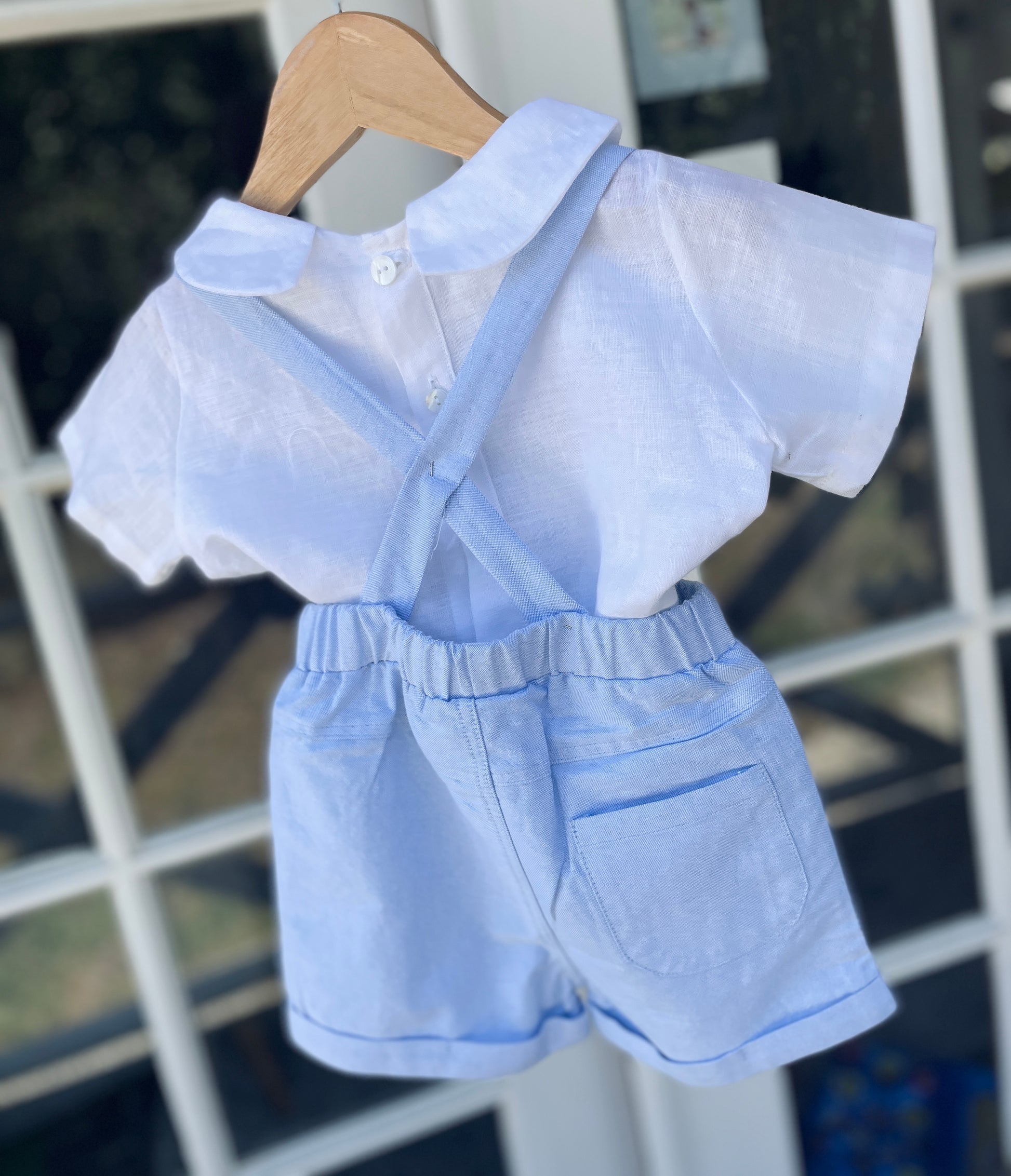 Gorgeous pale blue chambray cotton shorts with elastic waistband. Add suspenders to complete the look!