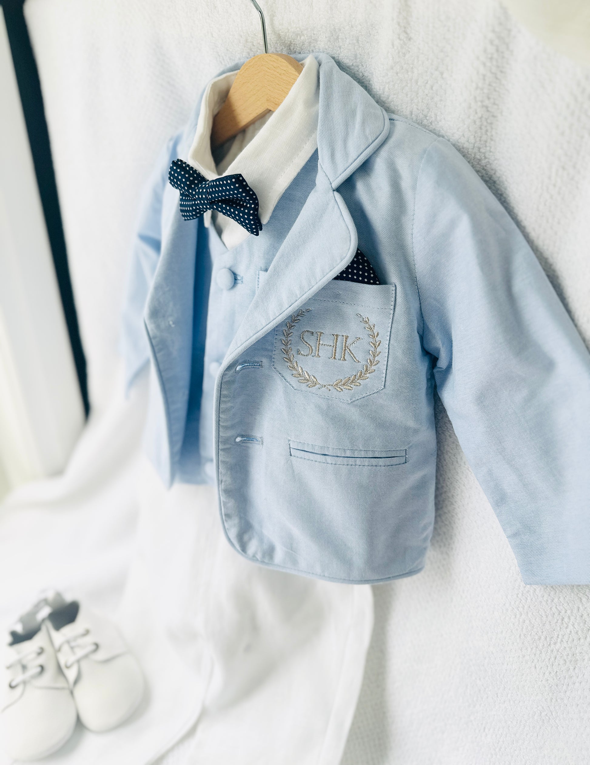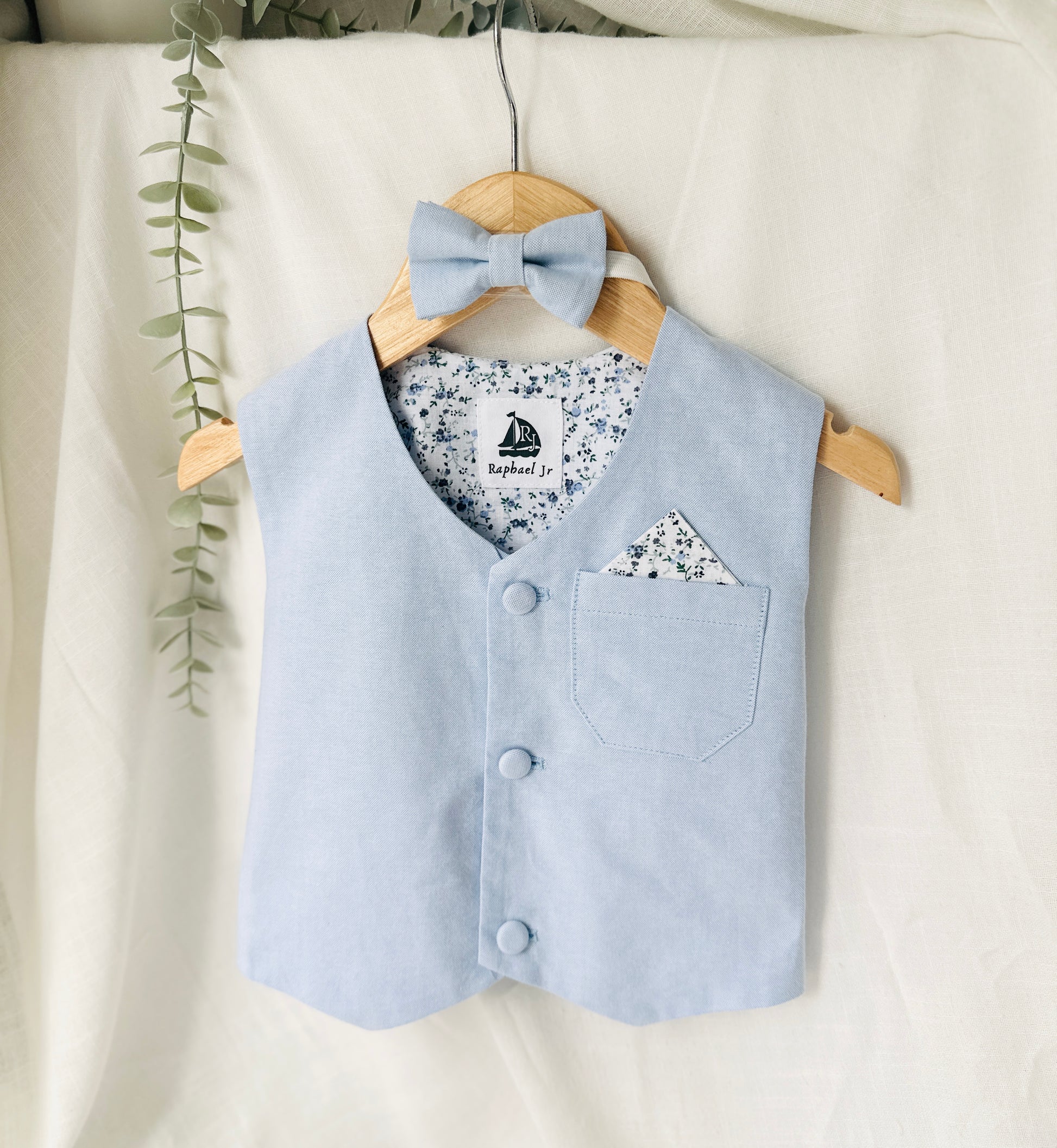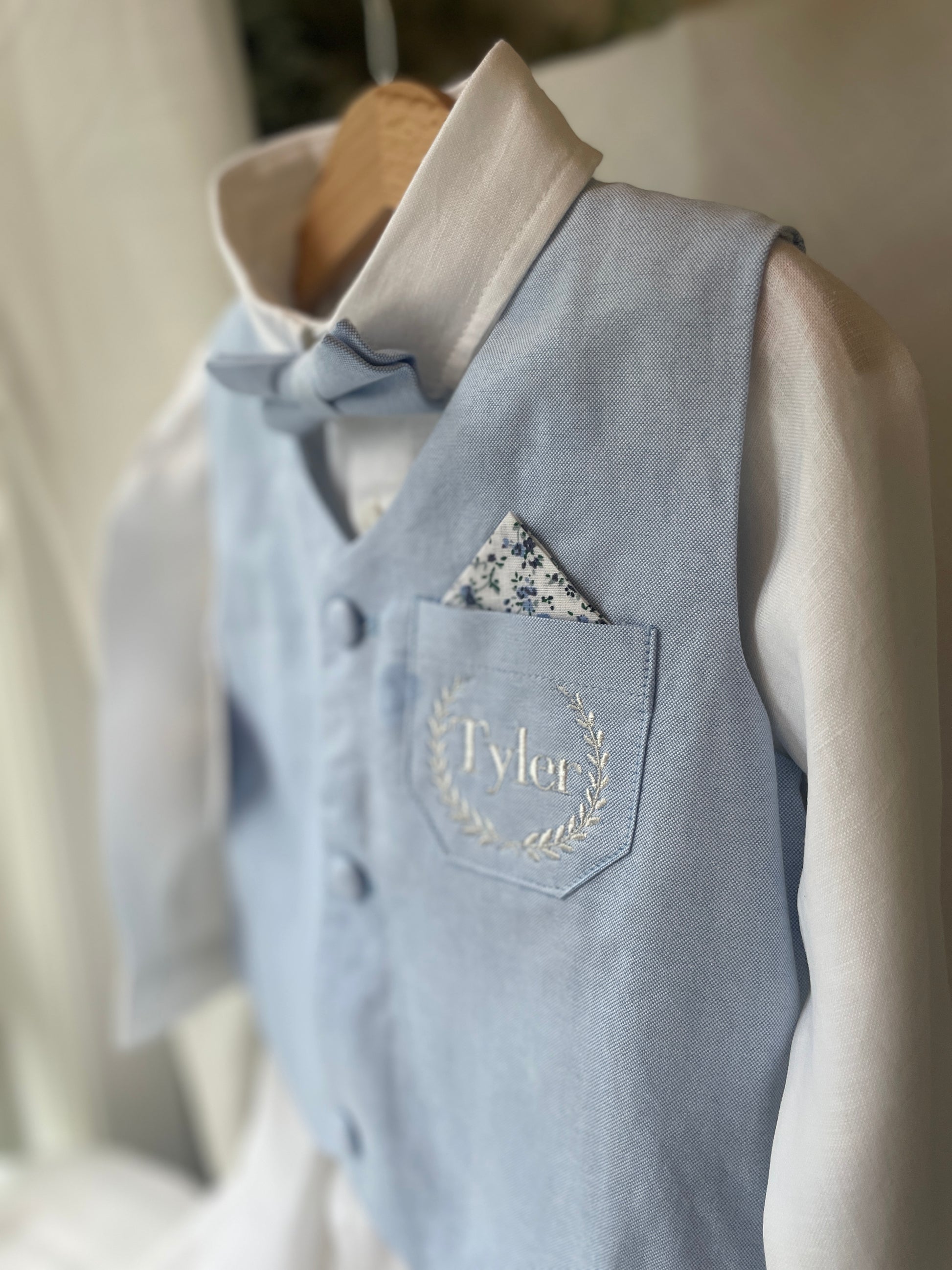 The perfect outfit! White 100% linen shirt (long sleeved, romper style up to 12 months, regular shirt sizes 1-4) with adorable bowtie of your choice, beige or white suspenders and matching white linen pants, and a cute pale blue chambray vest to top it off. Standard outfit comes with blue matching bow tie. The vest has a blue floral lining and matches with the pale blue floral bow tie.