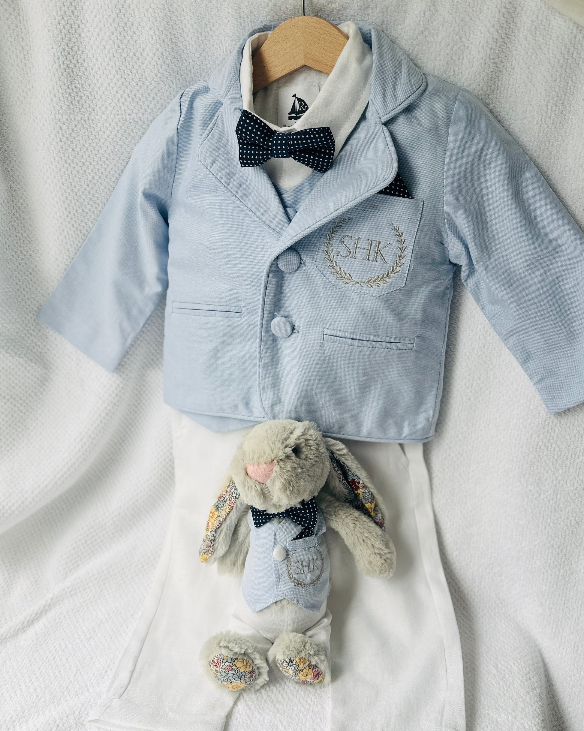 Add embroidery; add your child’s name, initials, a cross, or any custom design to the pocket of the shirt and/or vest, the cap, jacket or bunny (or all!)