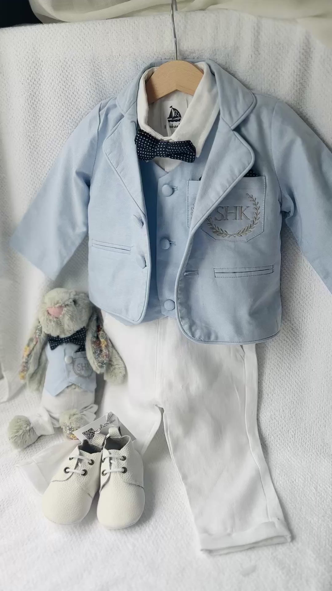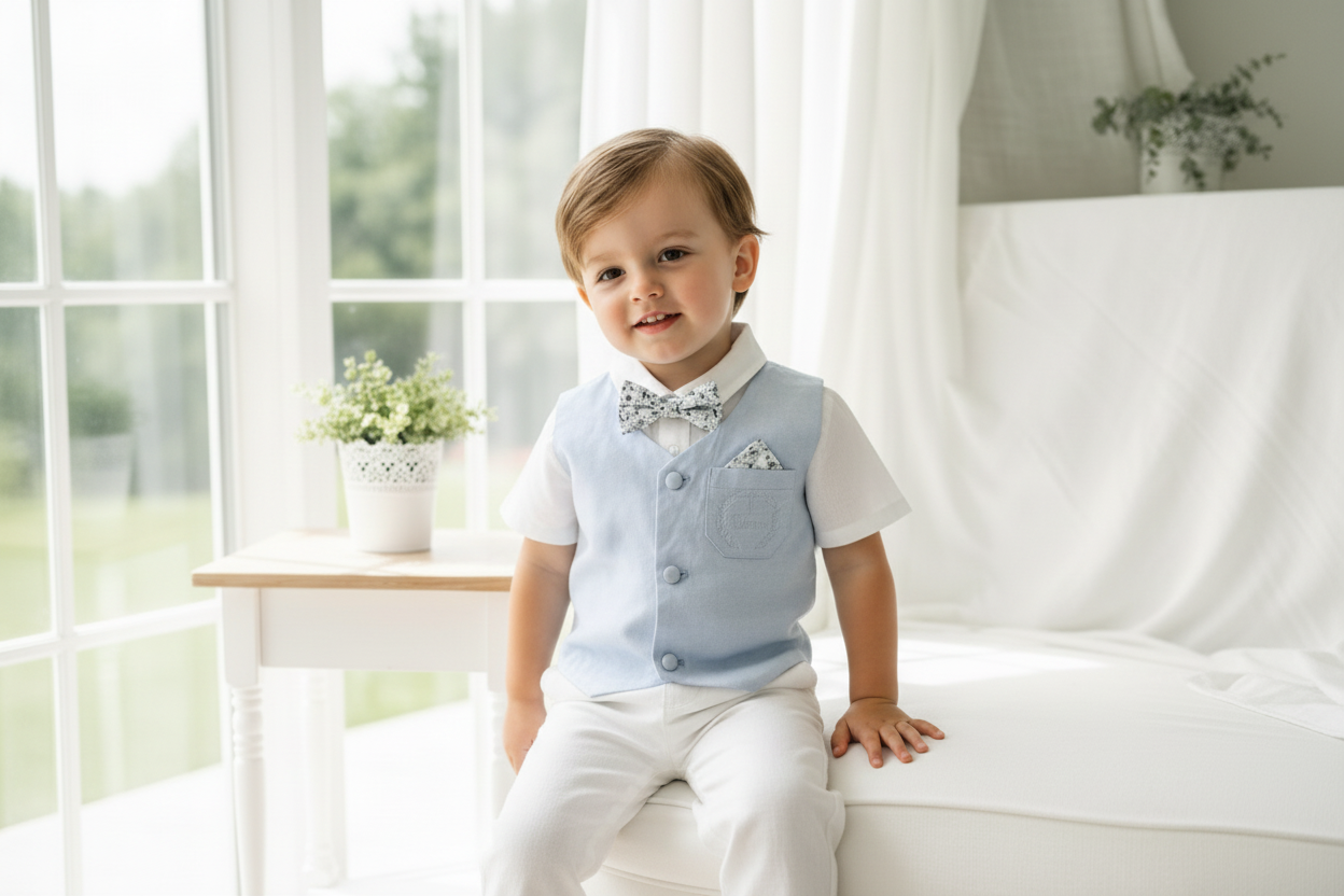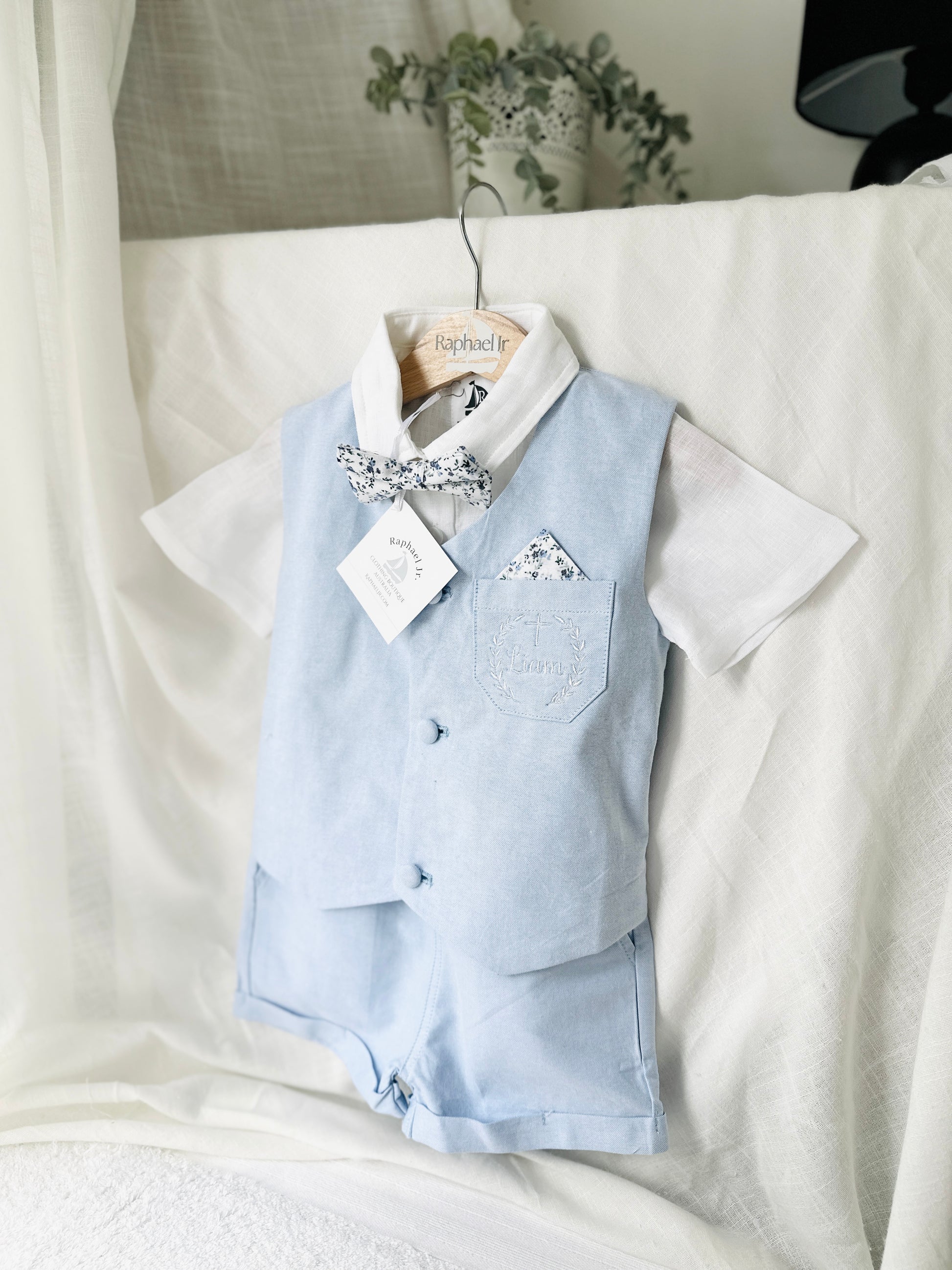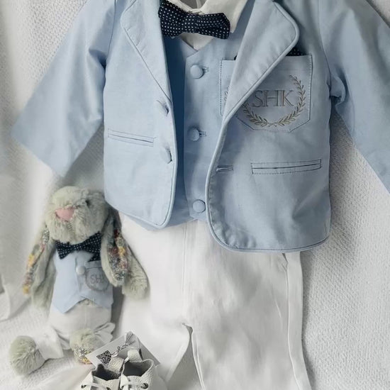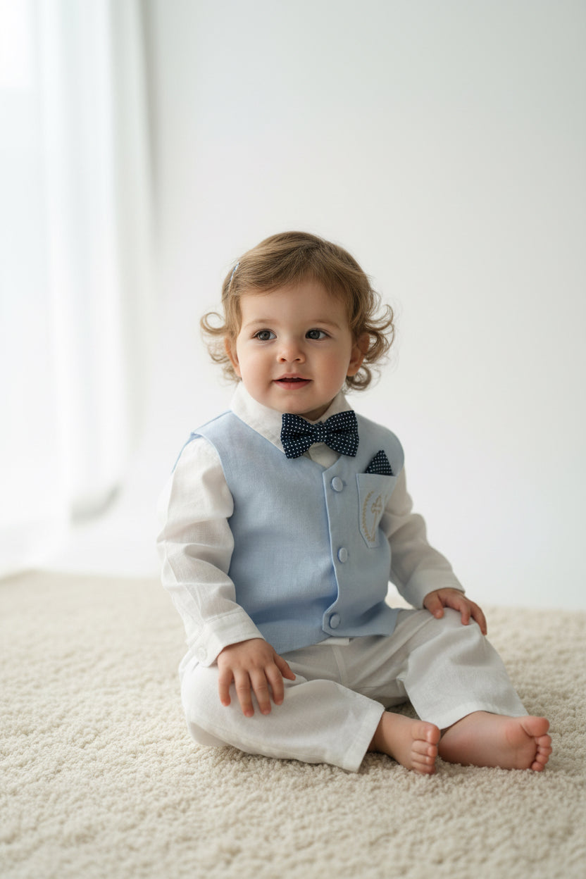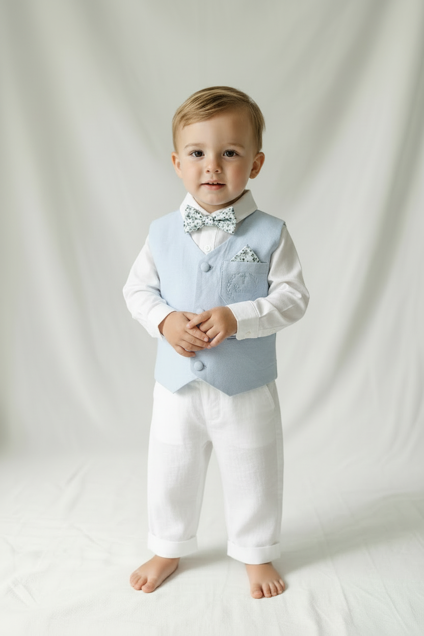 Boys pale blue and white Baptism outfit with blue vest, white linen suspender pants and shirt