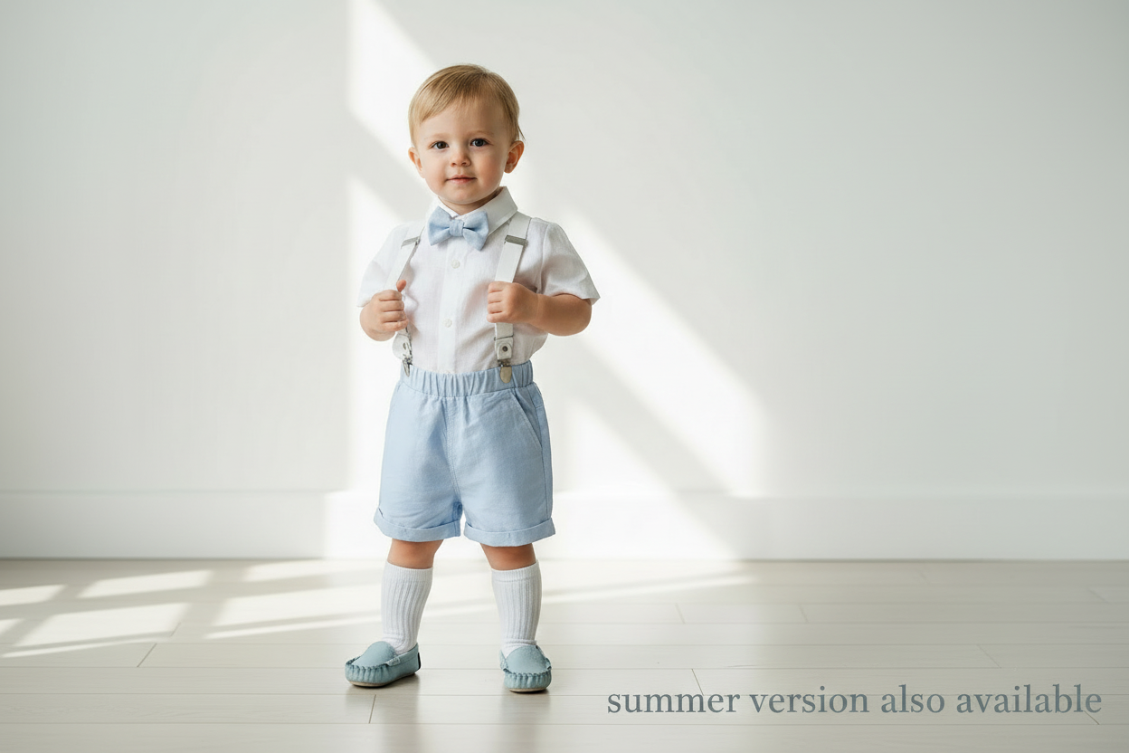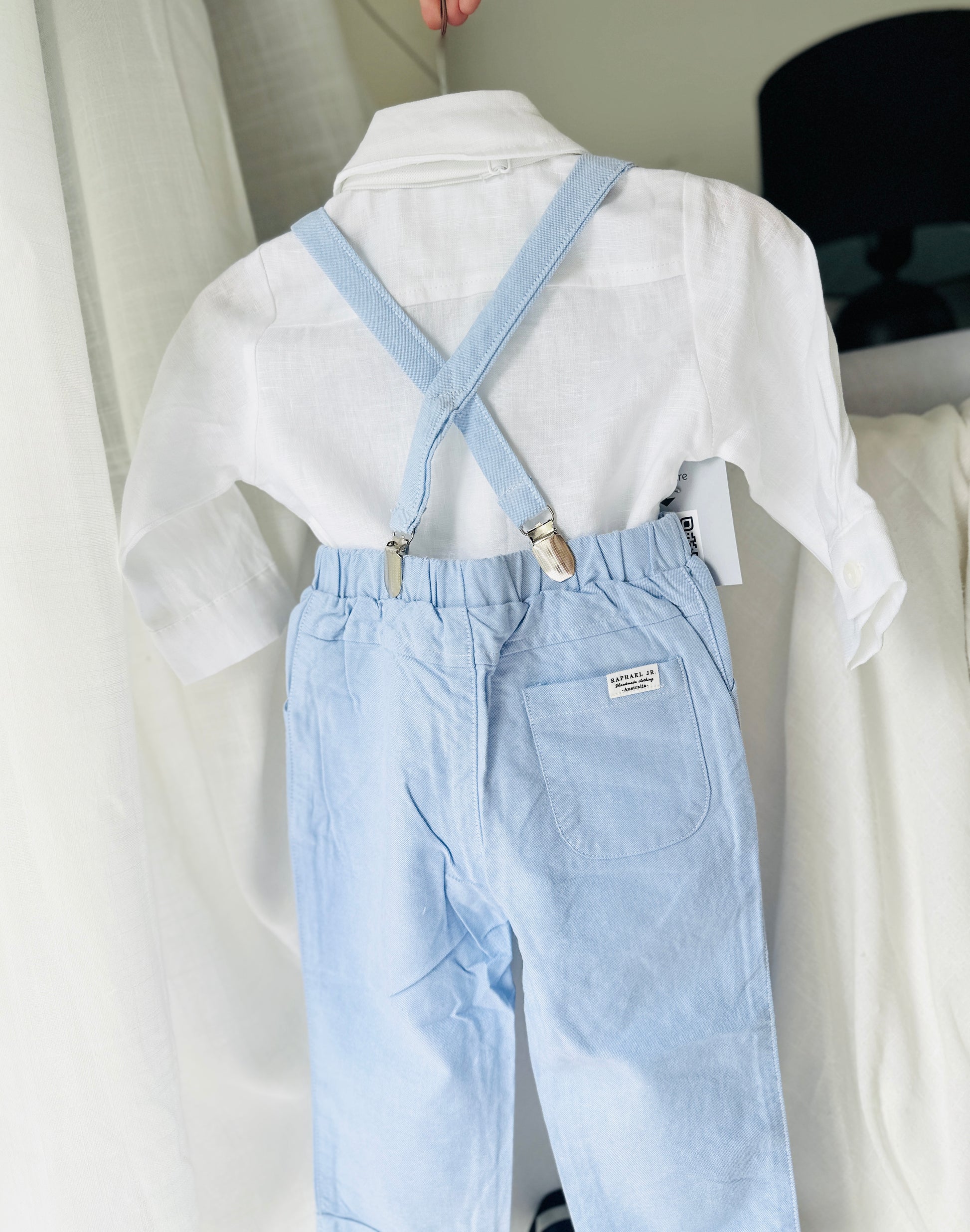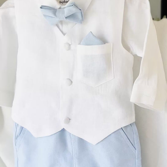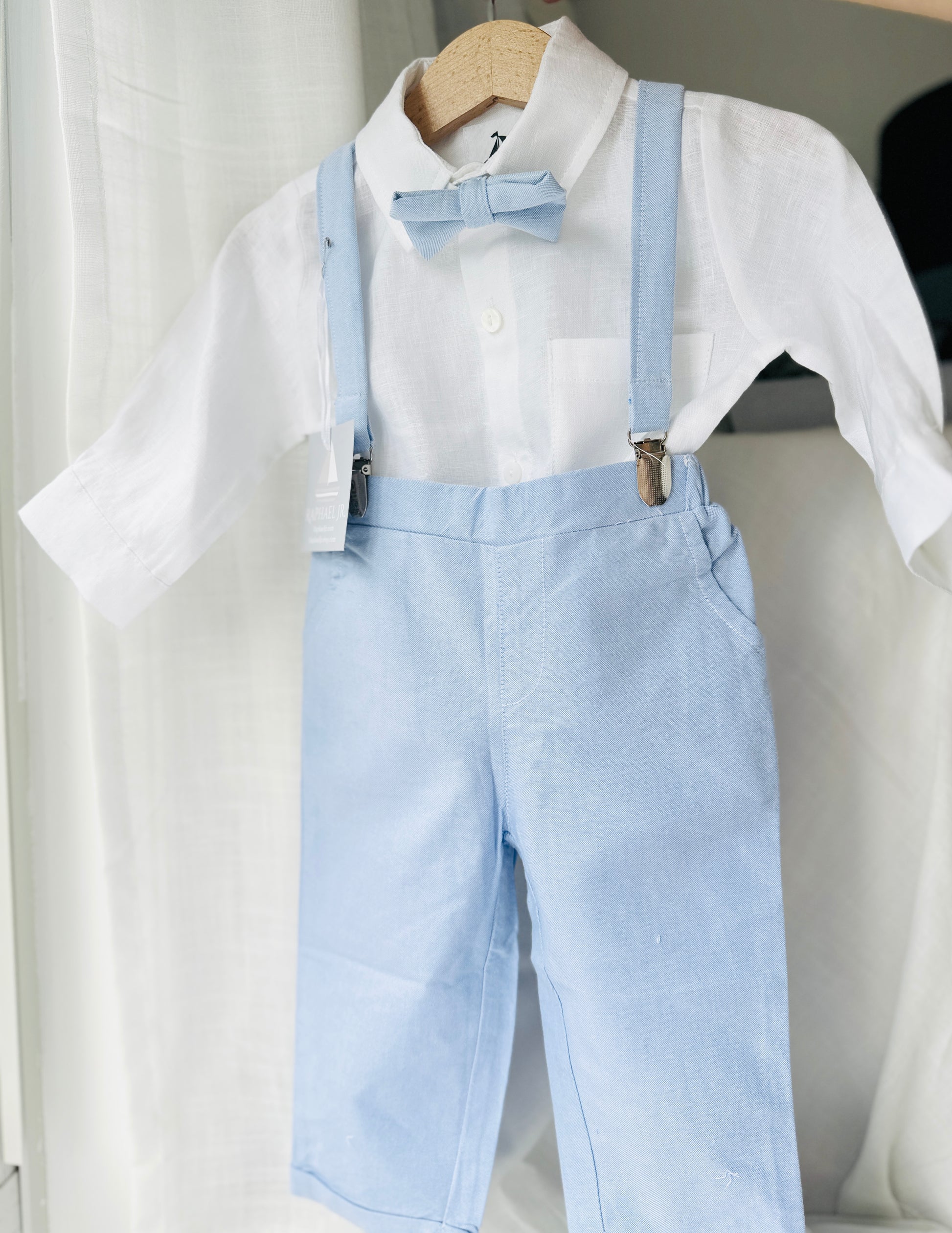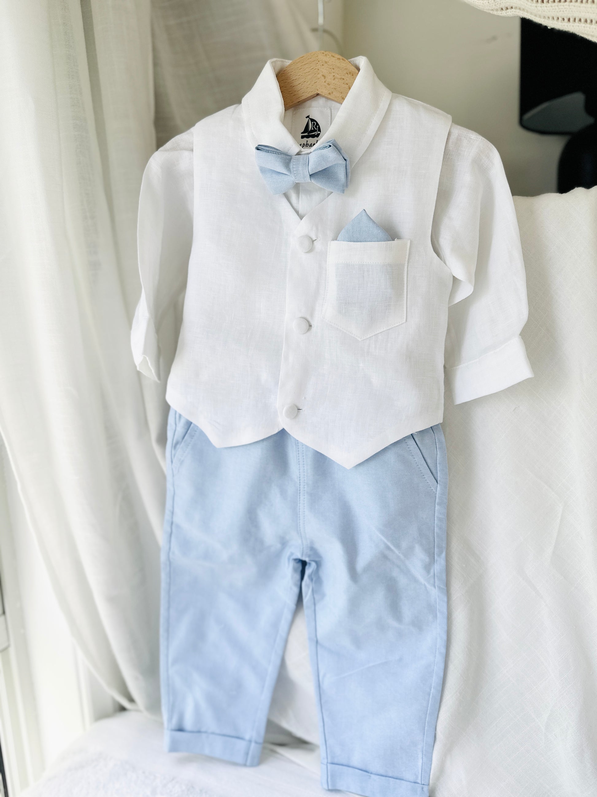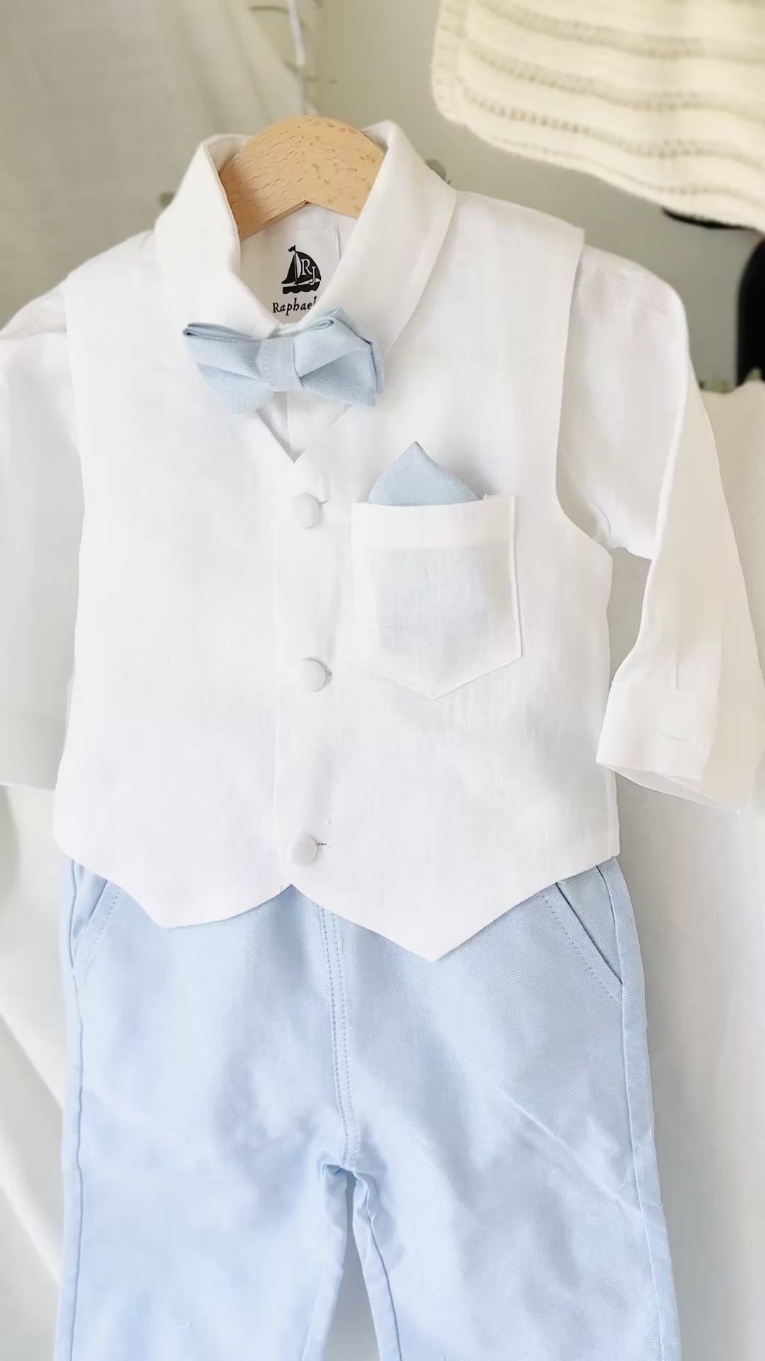 The perfect outfit! White 100% linen shirt (long sleeved, romper style up to 12 months, regular shirt sizes 1-4) with adorable bowtie of your choice, beige or white suspenders and matching pale blue pants, and a cute white linen vest to top it off. Standard outfit comes with blue matching bow tie.