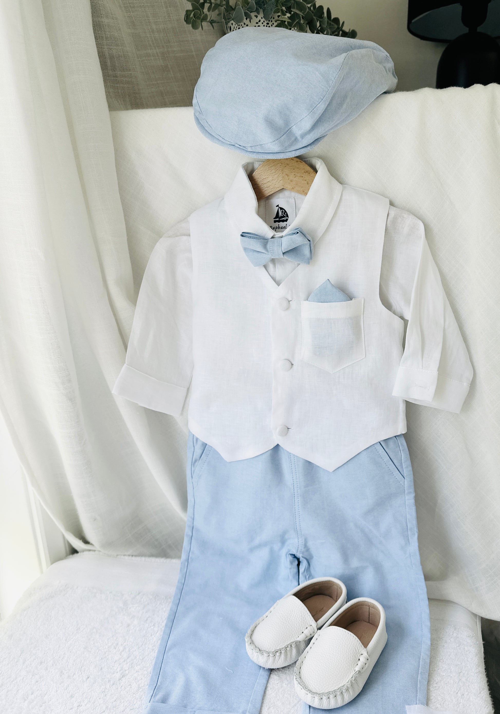 Boys pale blue and white set with vest, pants, linen shirt, bowtie and suspenders, plus optional jacket cap and shoes