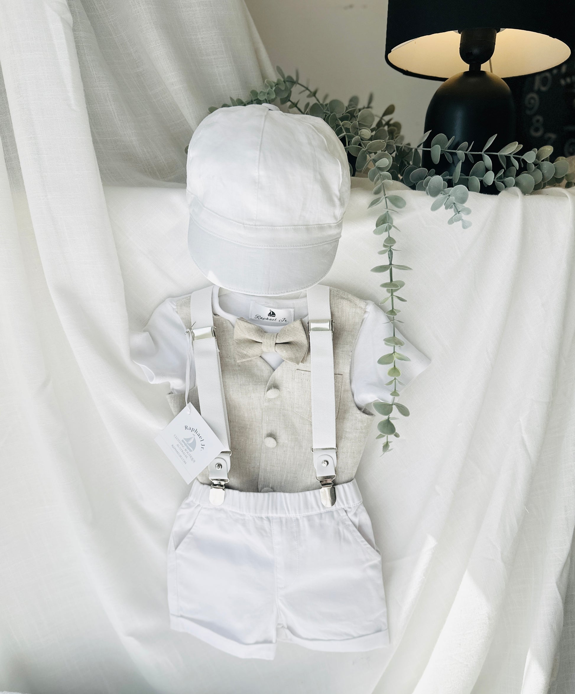 Boys white and beige cotton Baptism wedding set with vest onesie, shorts, suspenders and bow tie