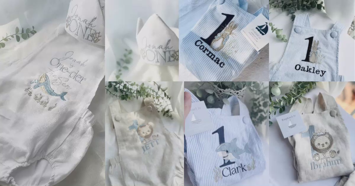 Boys White Linen romper first birthday overalls one silly goose onederful world oneder the sea and more