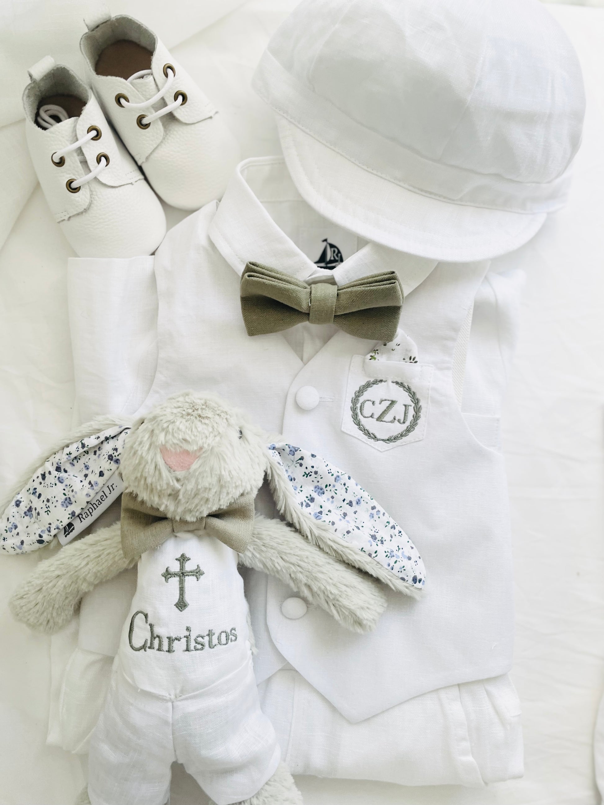 Grey fluffy christening bunny rabbit toy in little suit and bow tie to match babys outfit embroidery optional