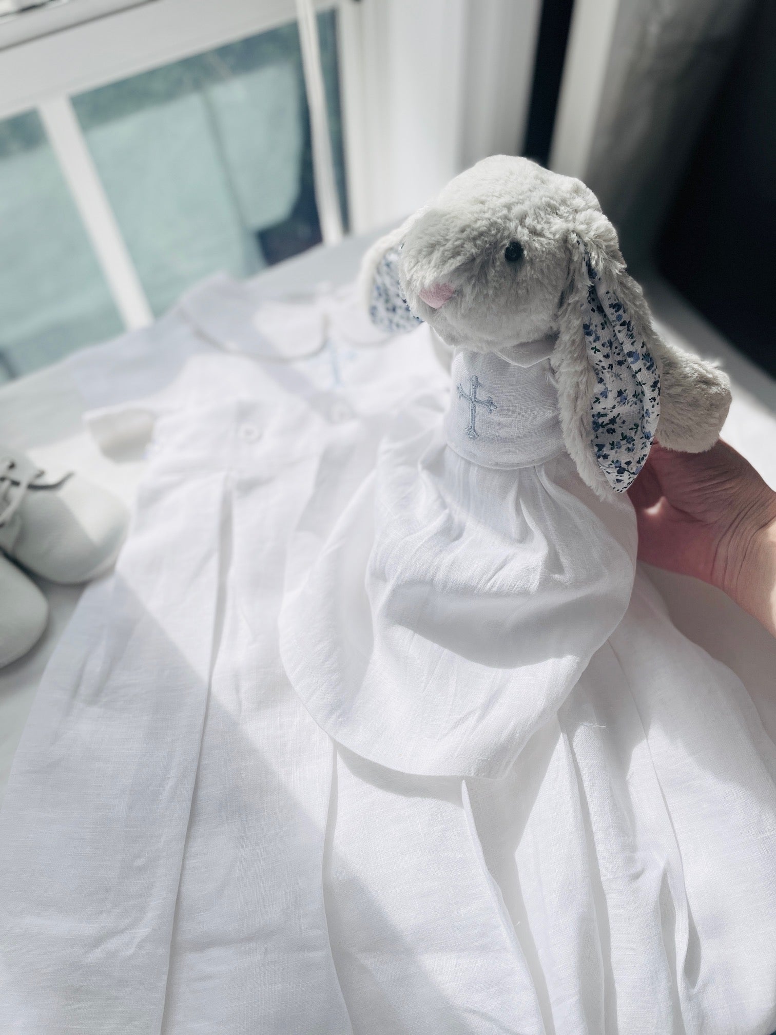 Soft fluffy bunny for snuggling into for comfort, and a keepsake for your little ones special occasion.