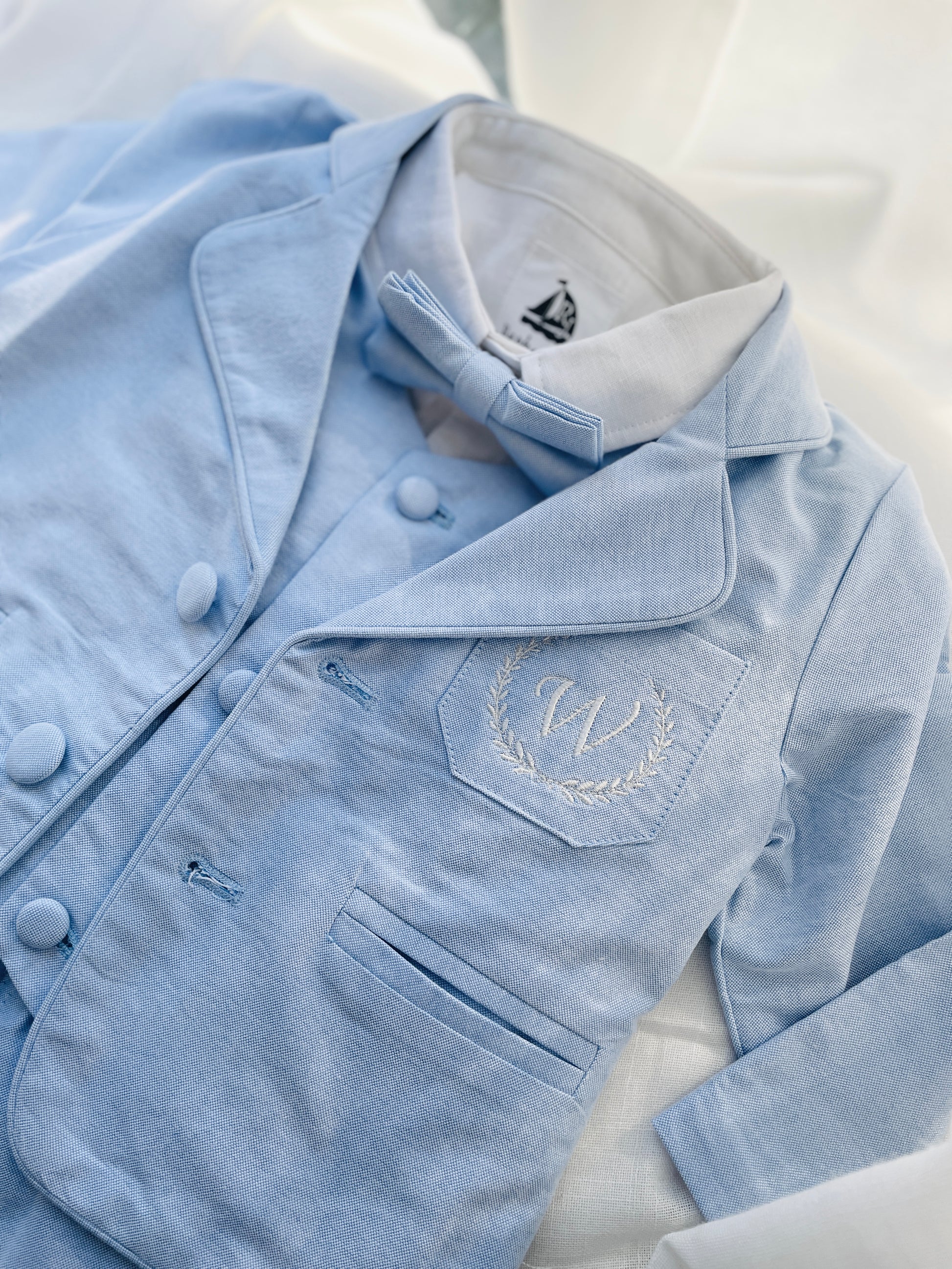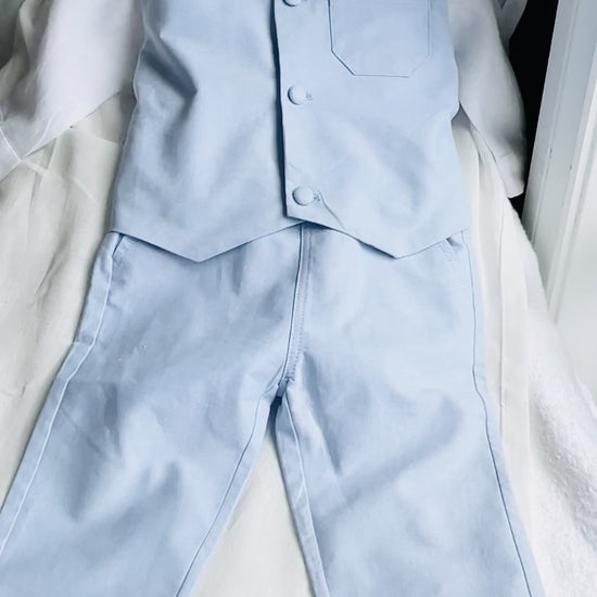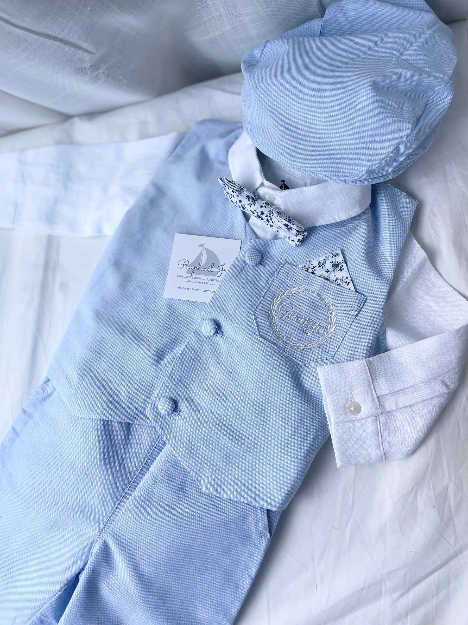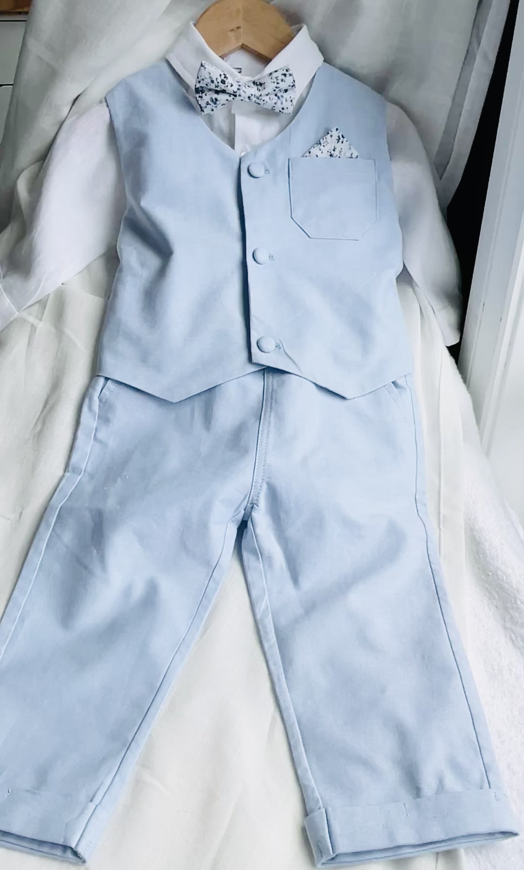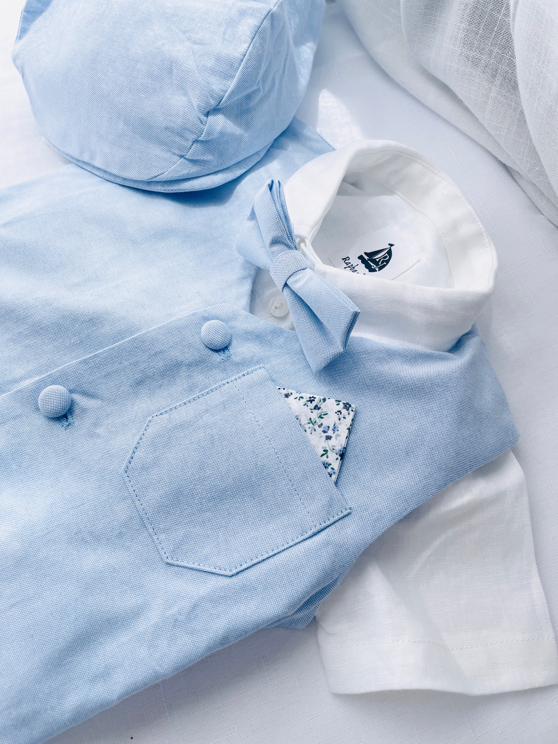 Baby and Toddler Boys pale blue chambray set with vest, pants, linen shirt, bowtie and suspenders, plus optional jacket cap and shoes