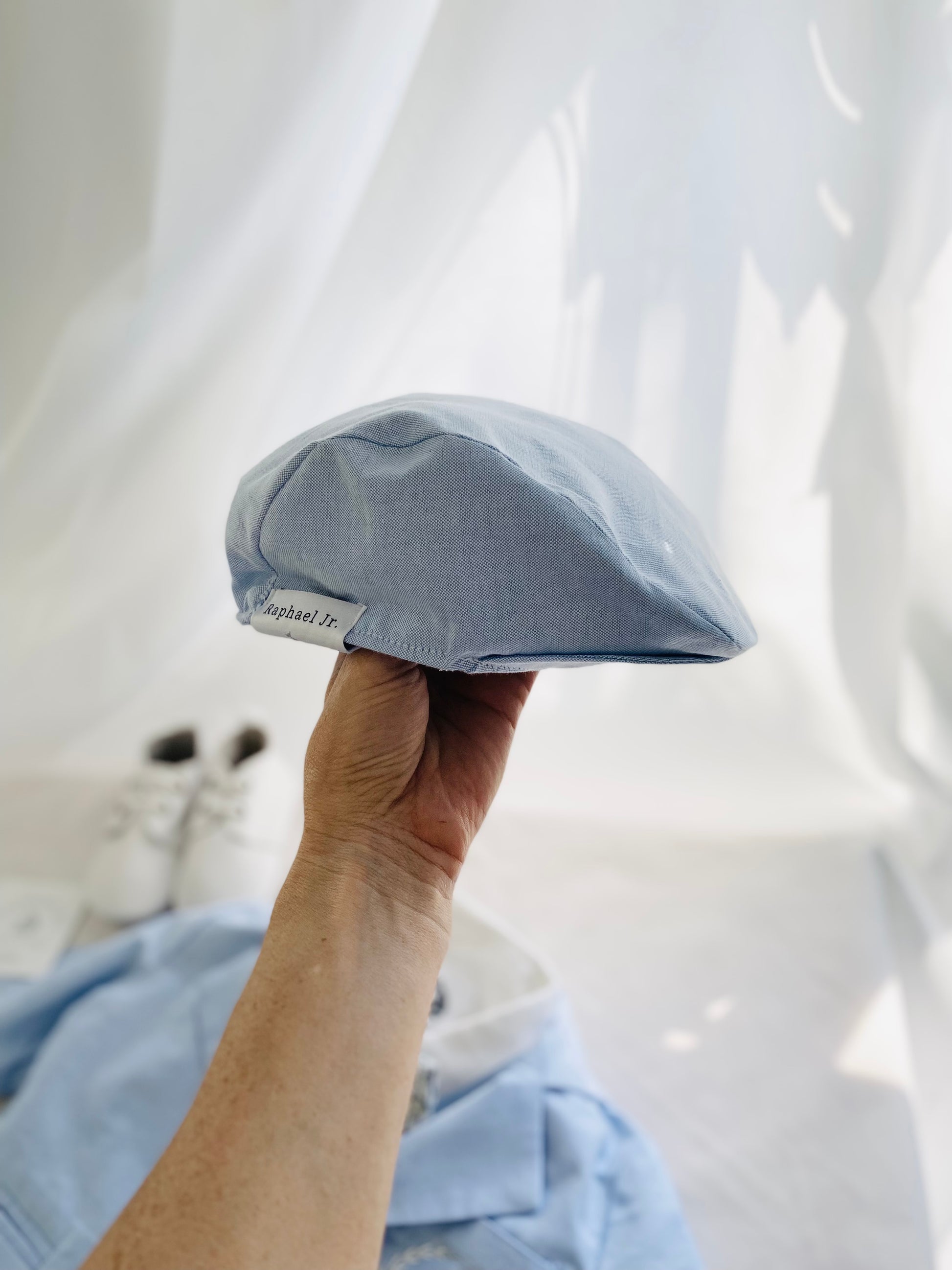 Add hat (as above add 100% cotton or linen beige paperboy style hat available is 4 sizes- XS (0-3m), S (3-6m), M (6-12m) and L (1-3 years). Flat caps available in 0-12m and 1-3 years. (white linen available also)