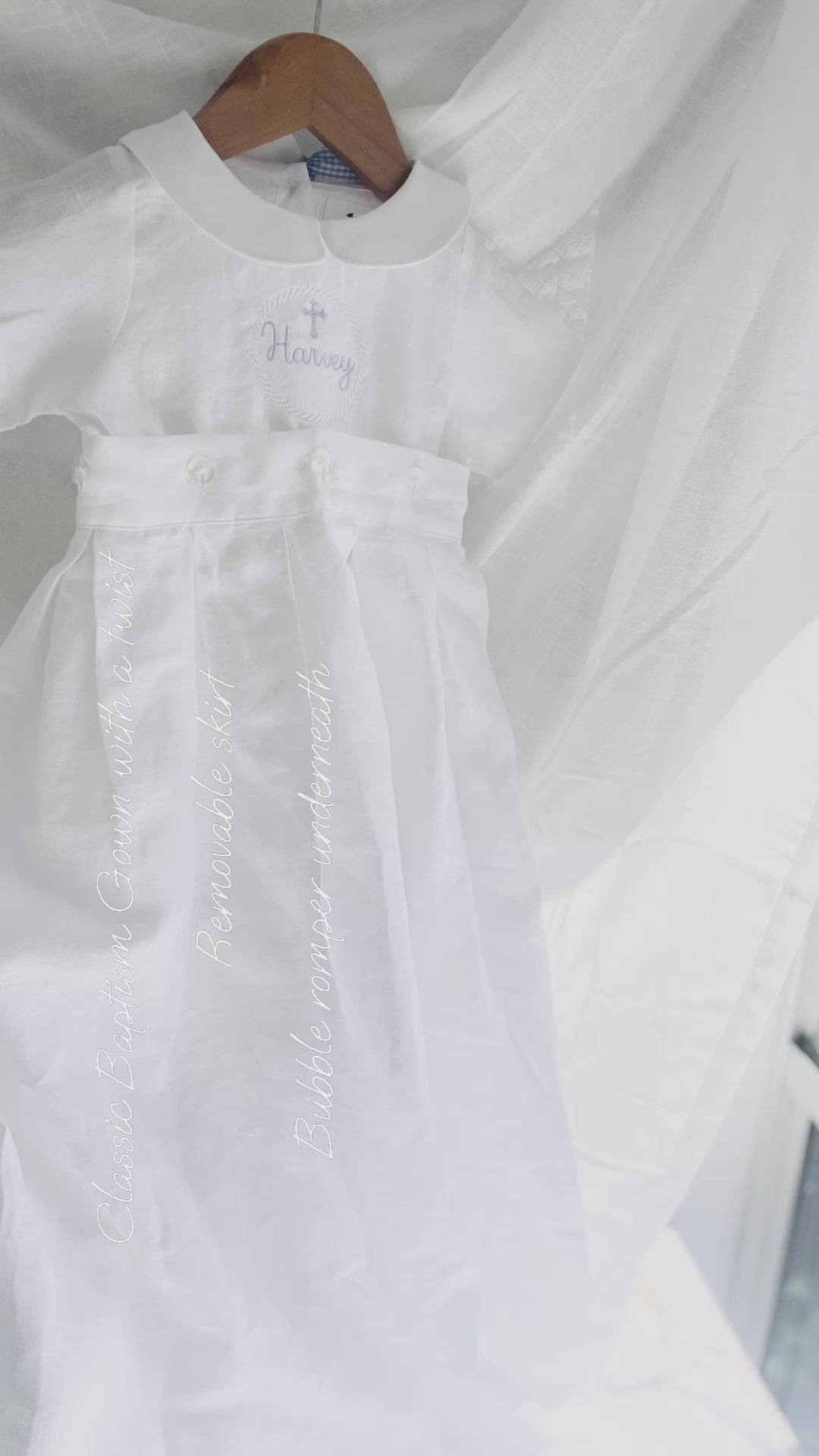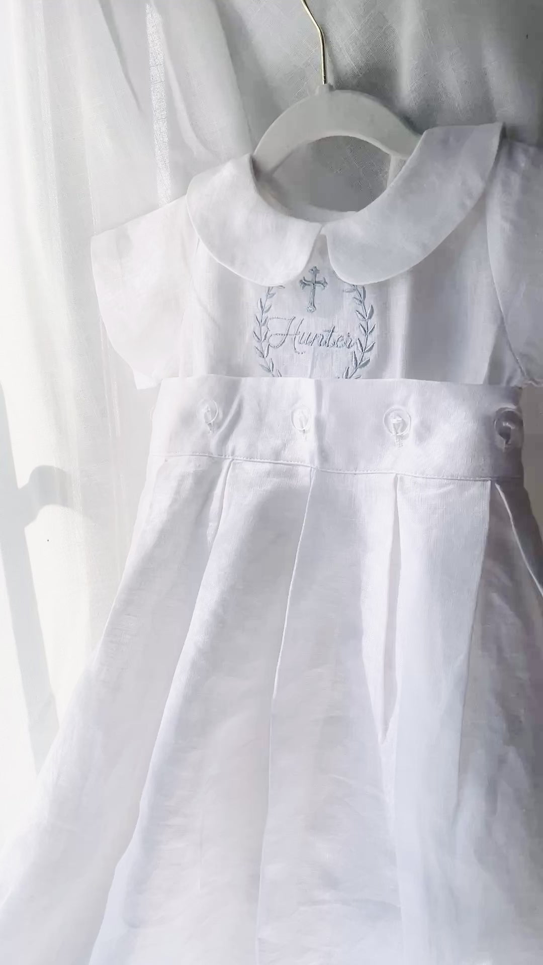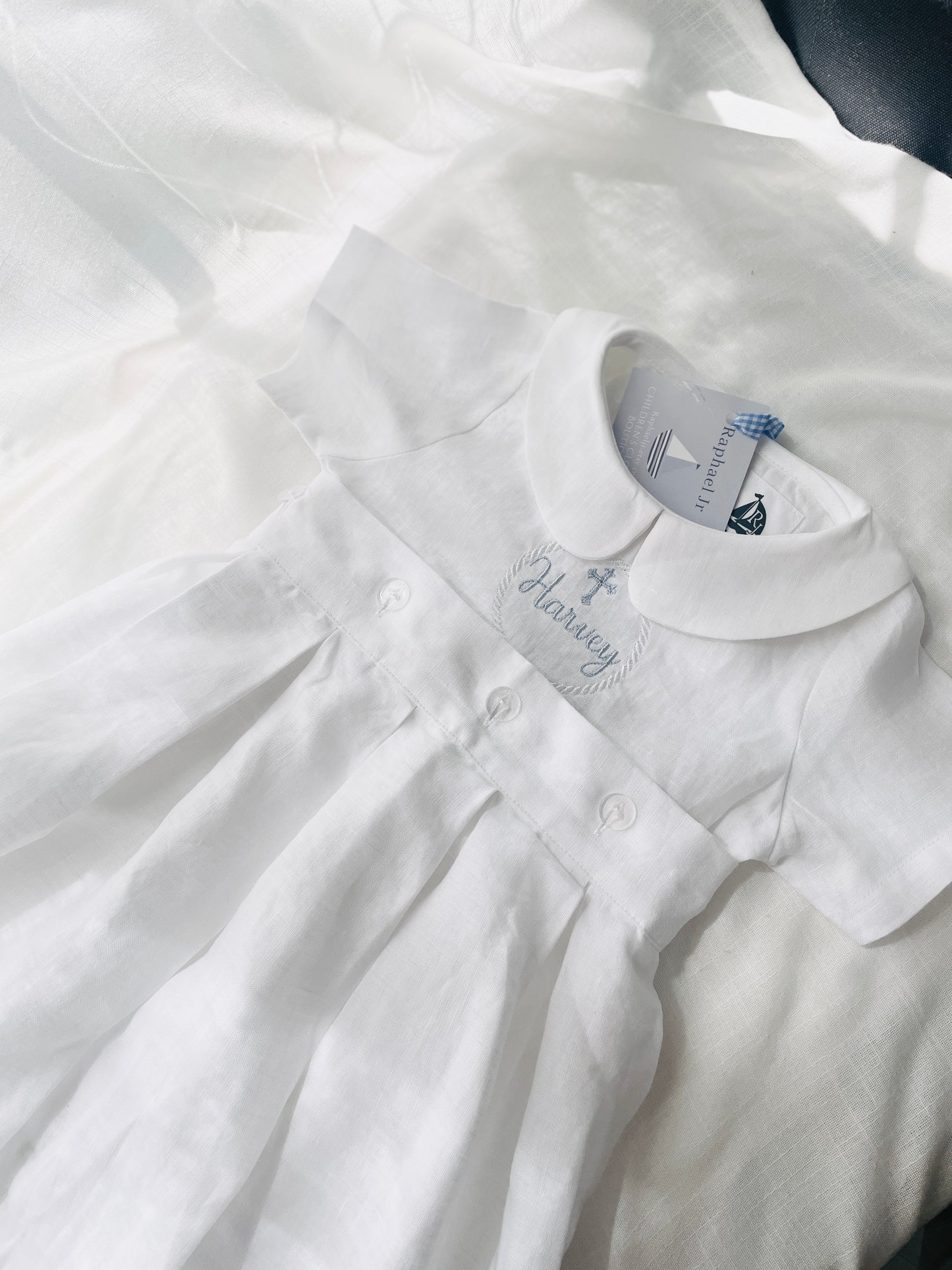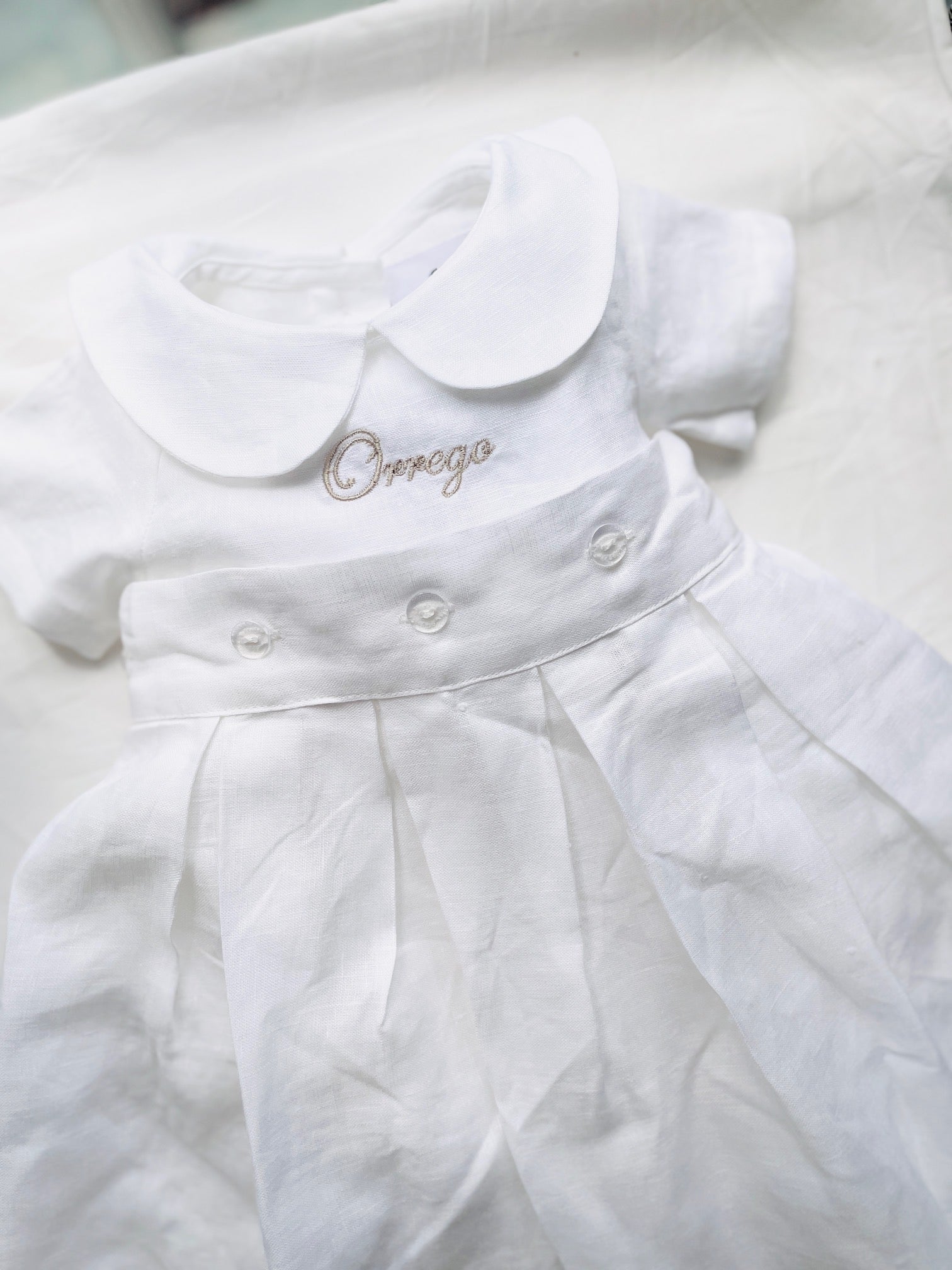 White Linen Baptism Gown romper with detachable skirt dress and optional embroidery