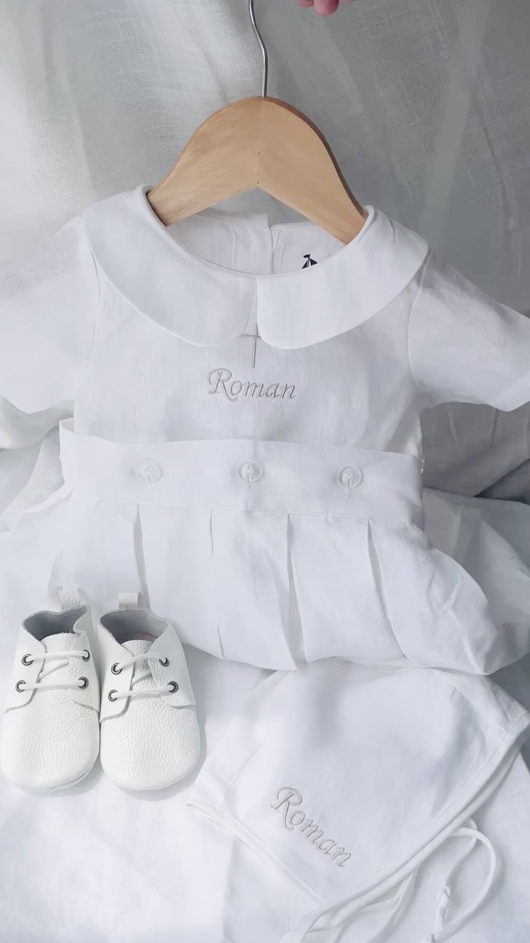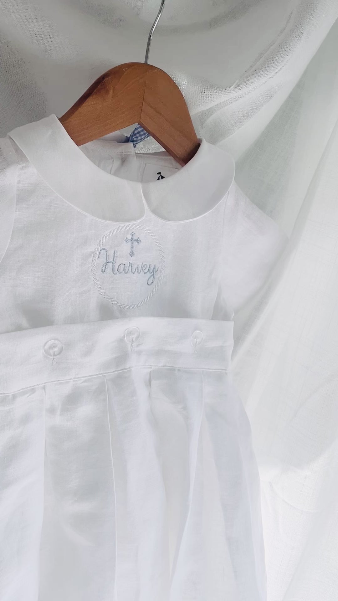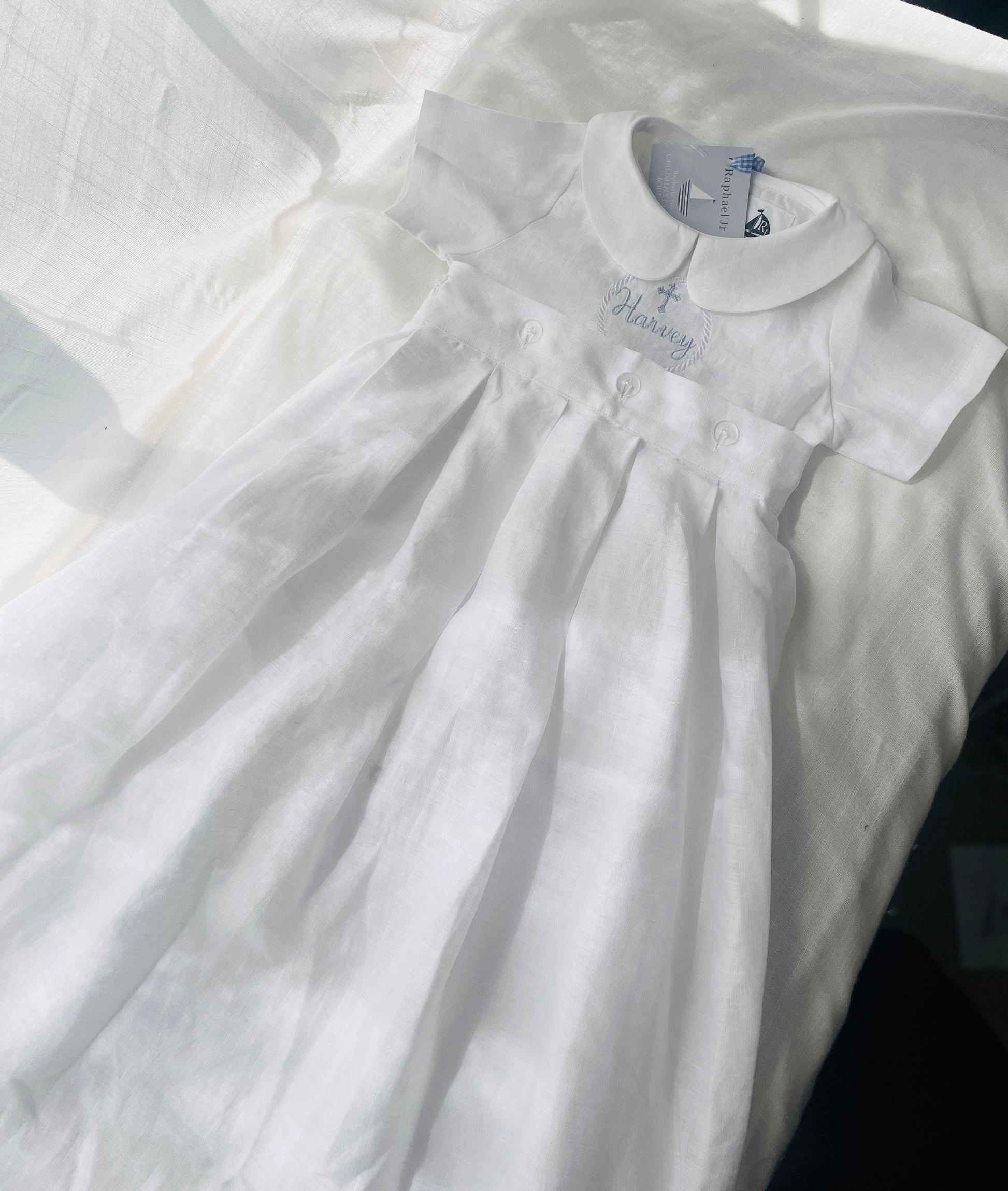 White Linen Baptism Gown romper with detachable skirt dress and optional embroidery