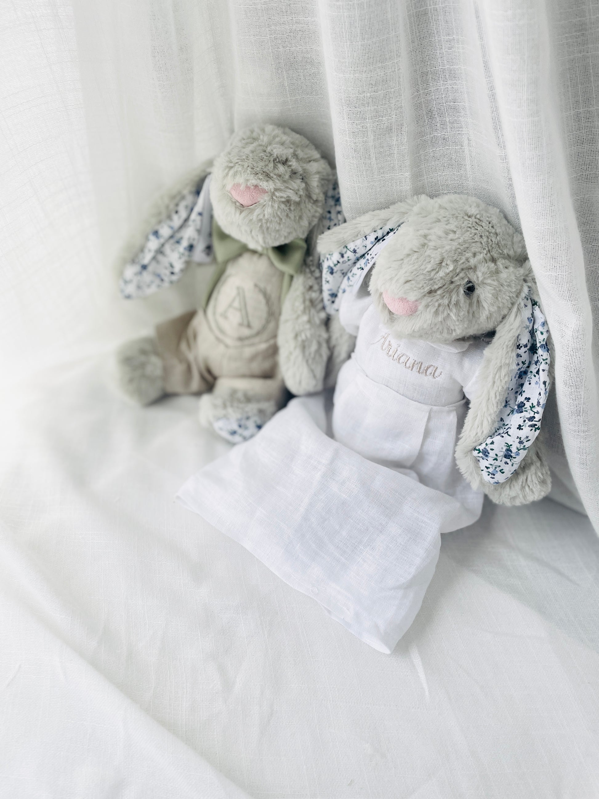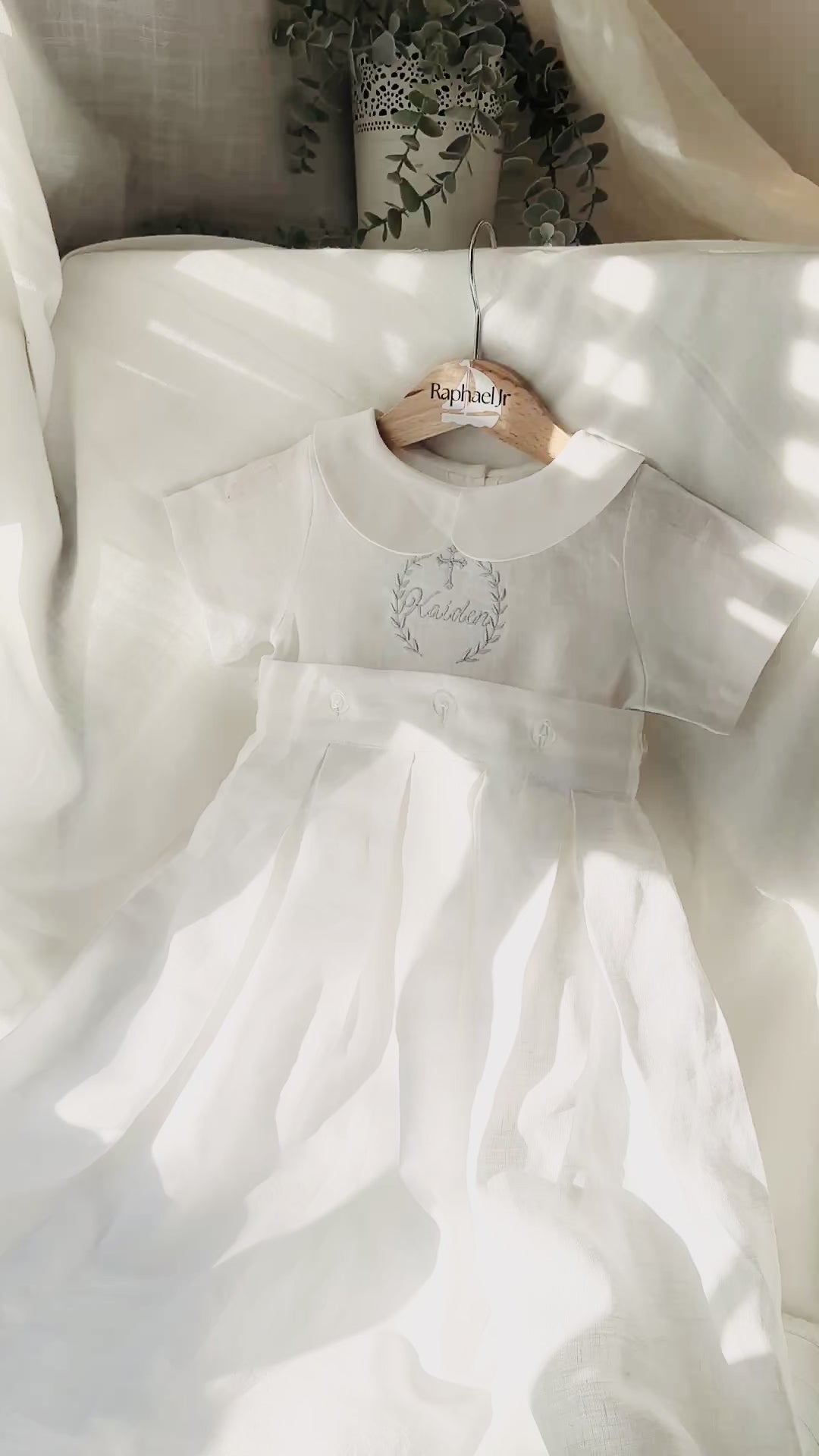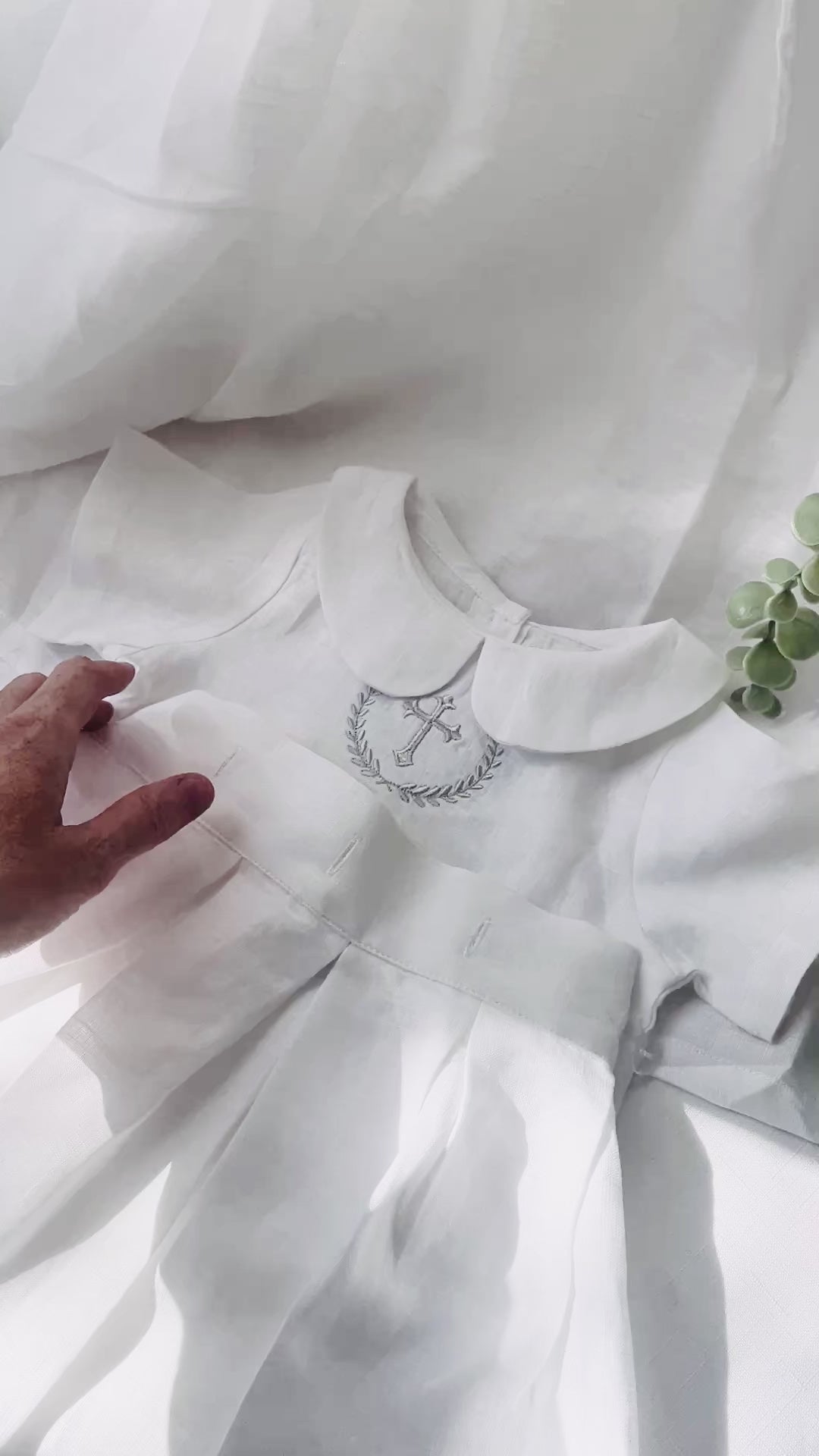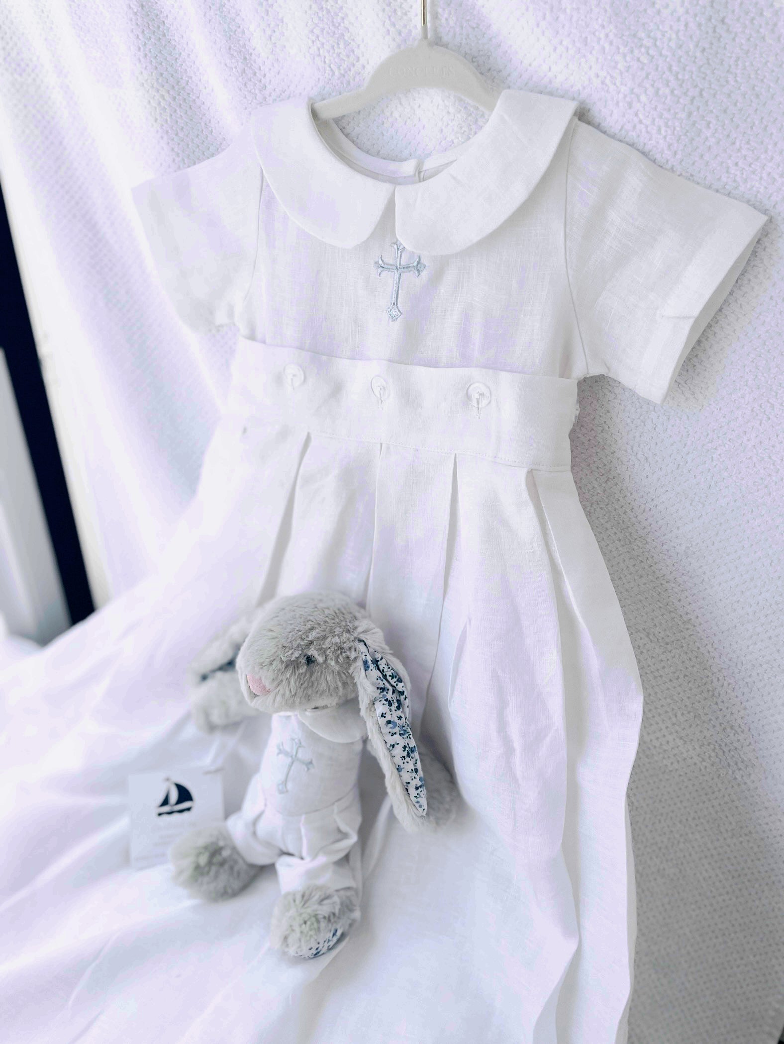 White Linen Baptism Gown romper with detachable skirt dress and optional embroidery