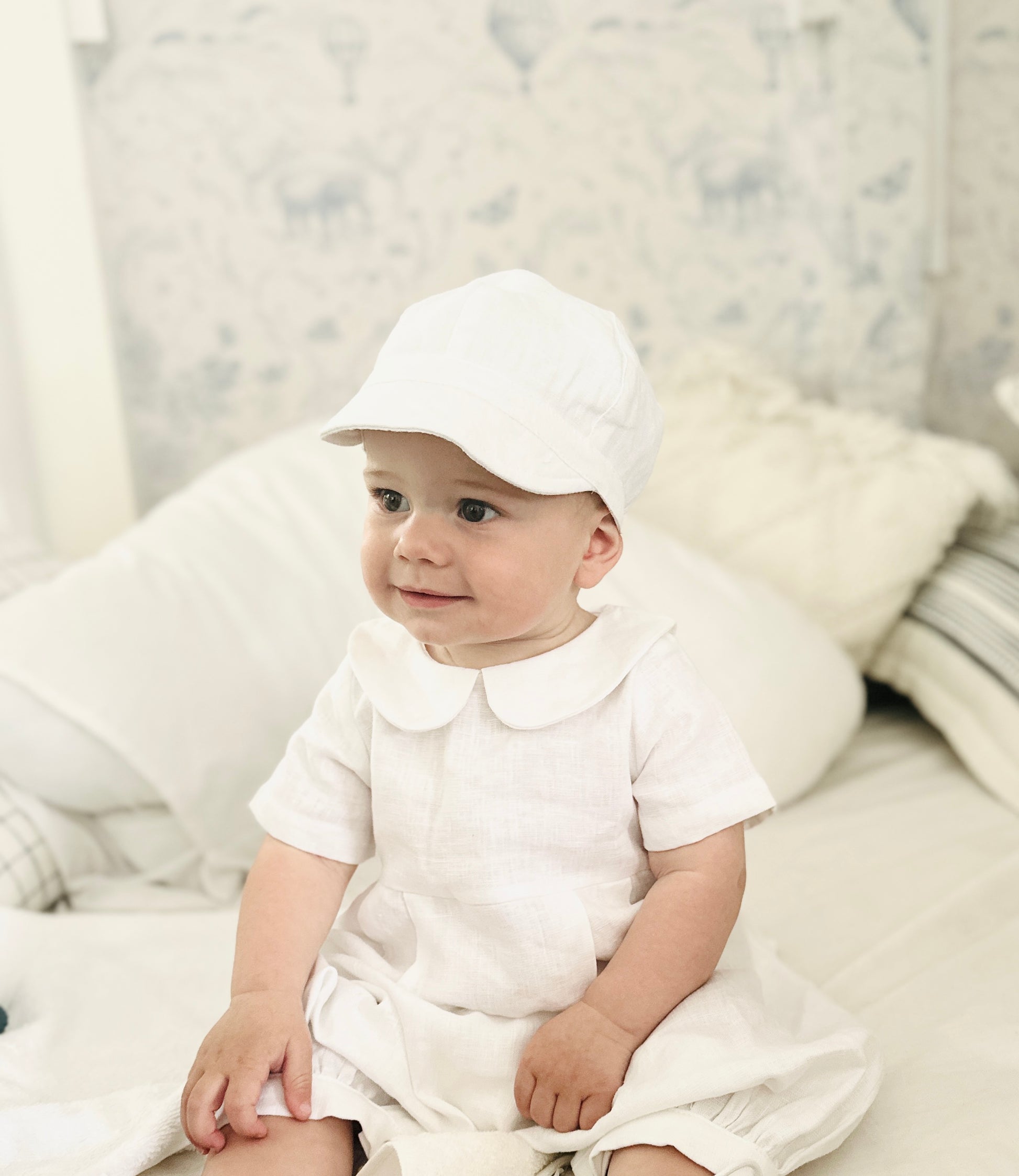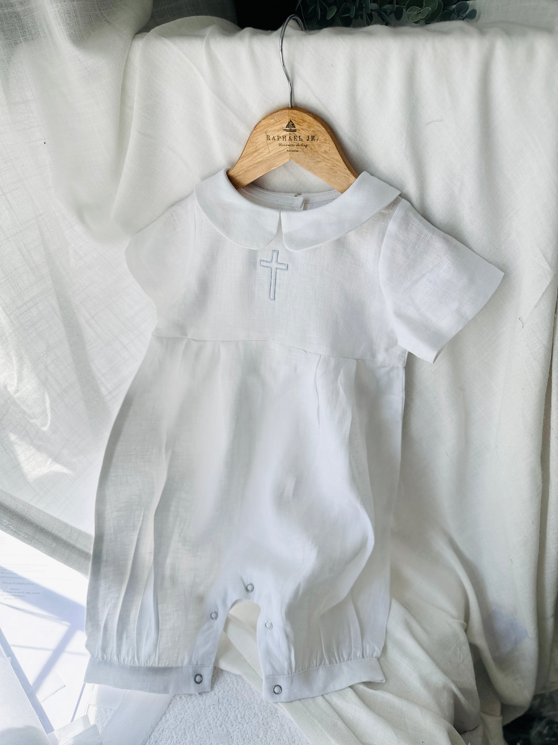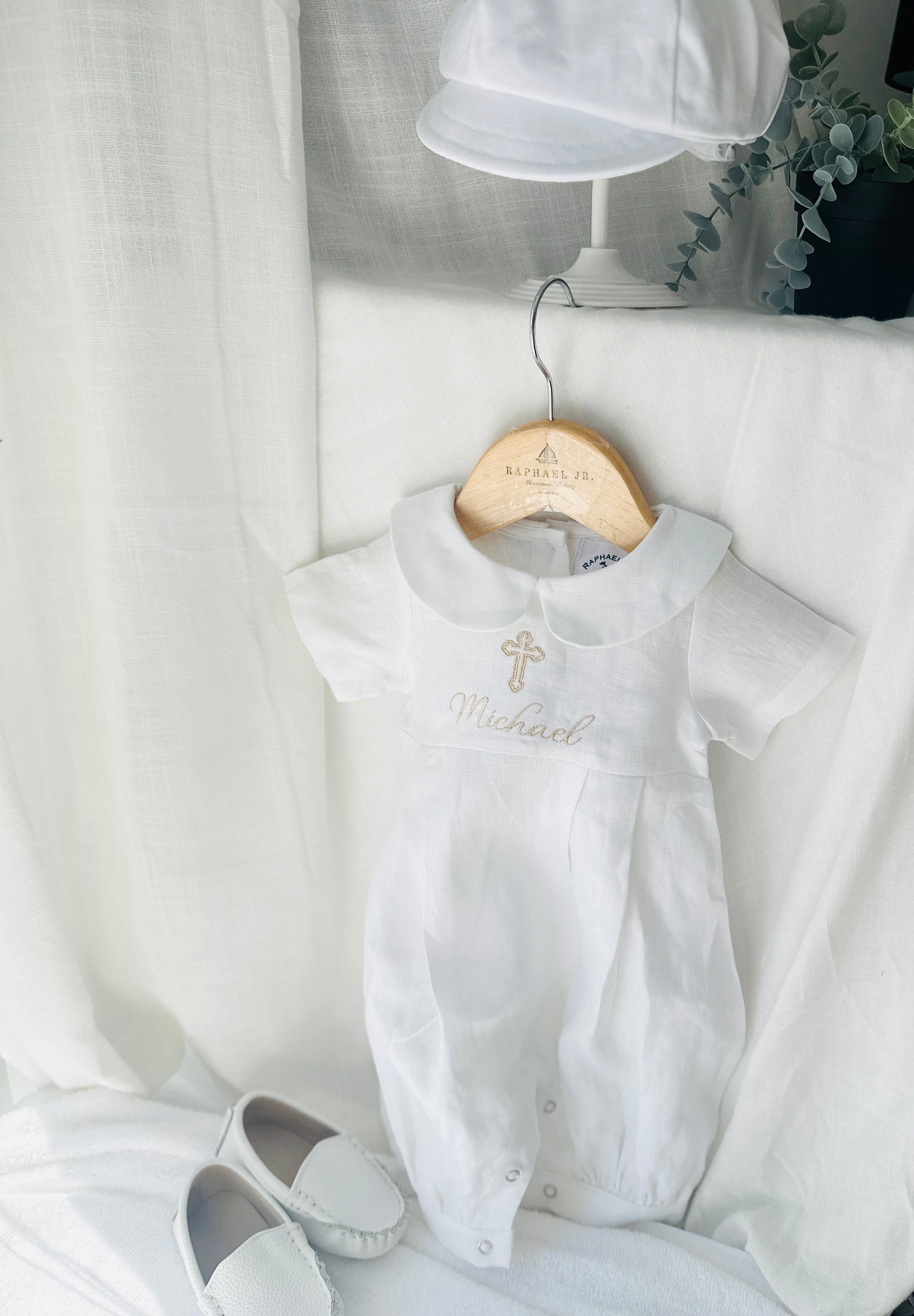 100% linen white 3/4 length romper outfit for baby boys Baptism or Christening. From Newborn, all the way up to 3 years old. The romper has a gorgeous peter pan collar, lovely mother of pearl buttons at the back, press studs at the crotch, and stunning pleats across the middle. The bodice and the collar can both be embroidered with your chosen design.