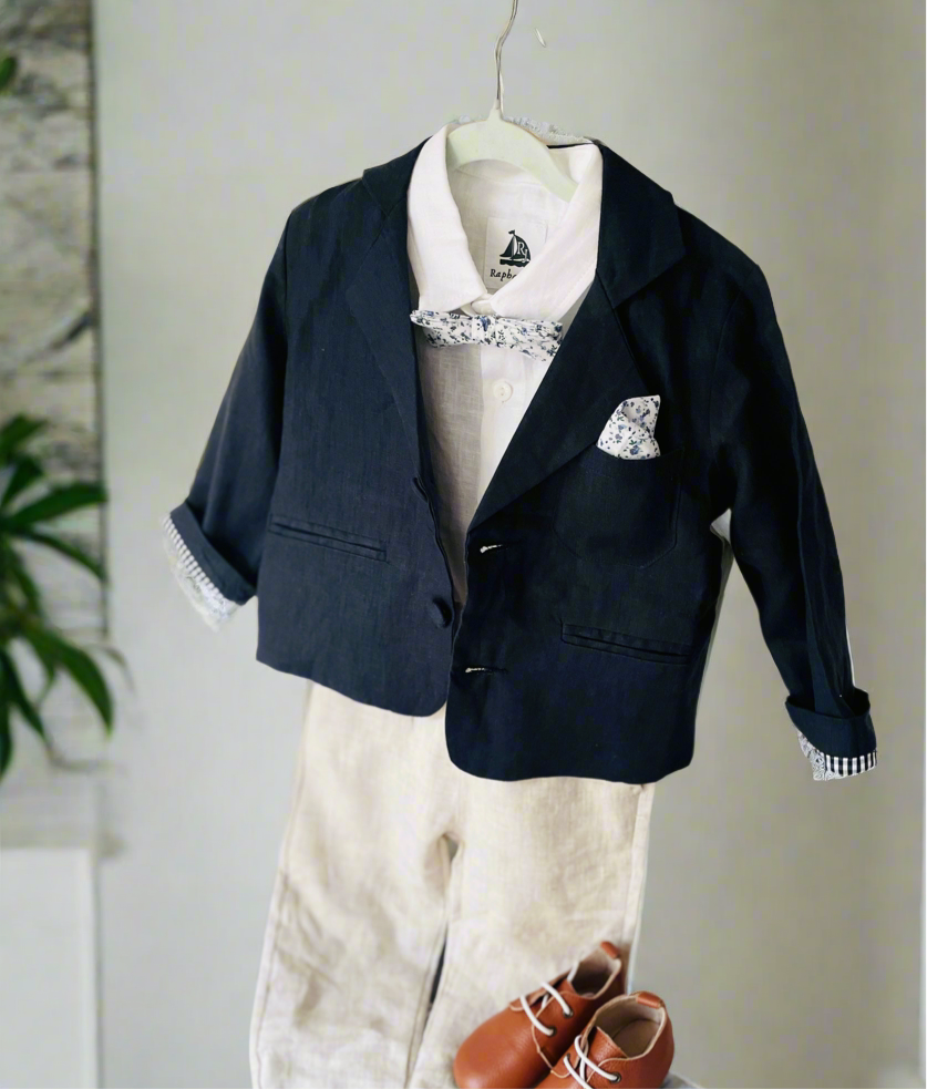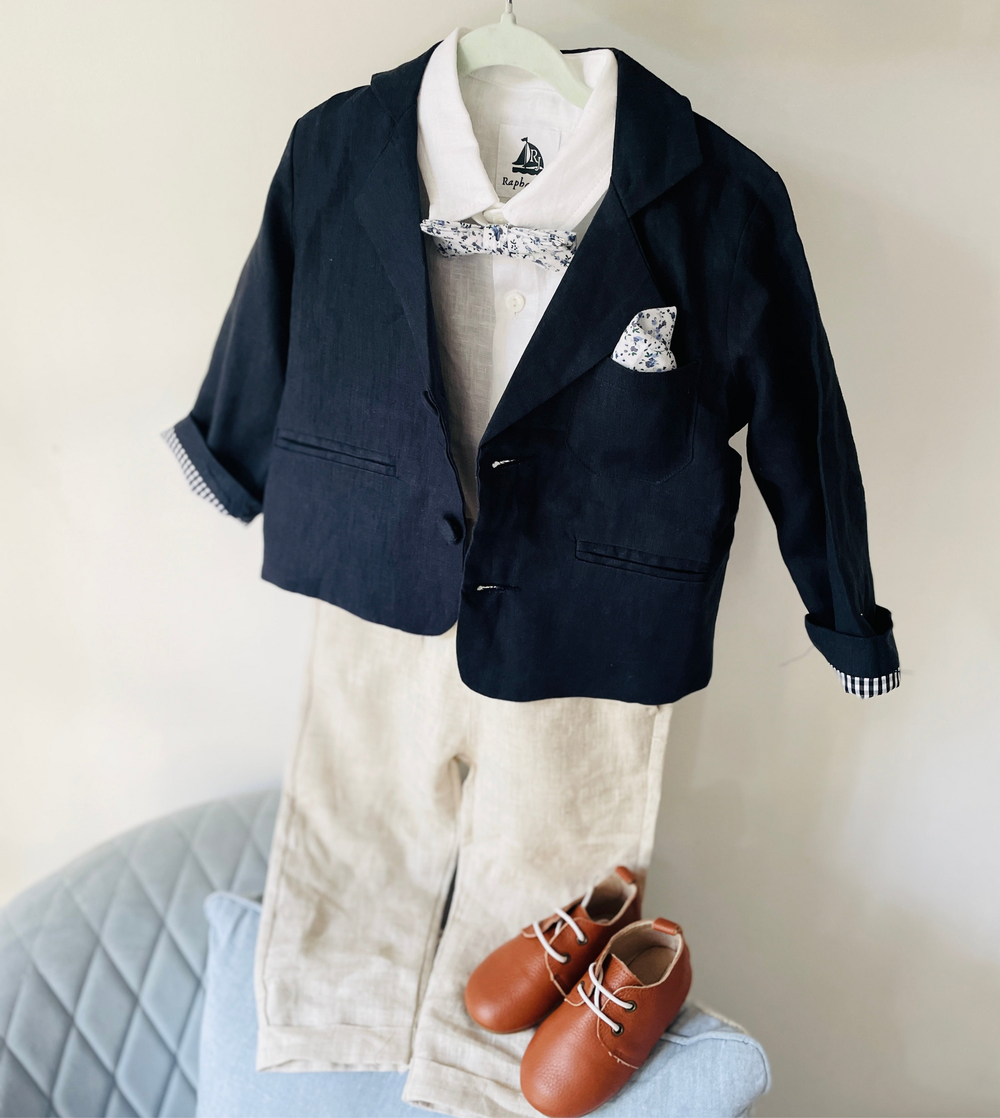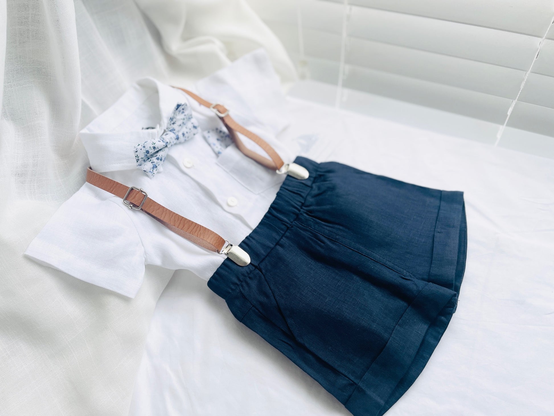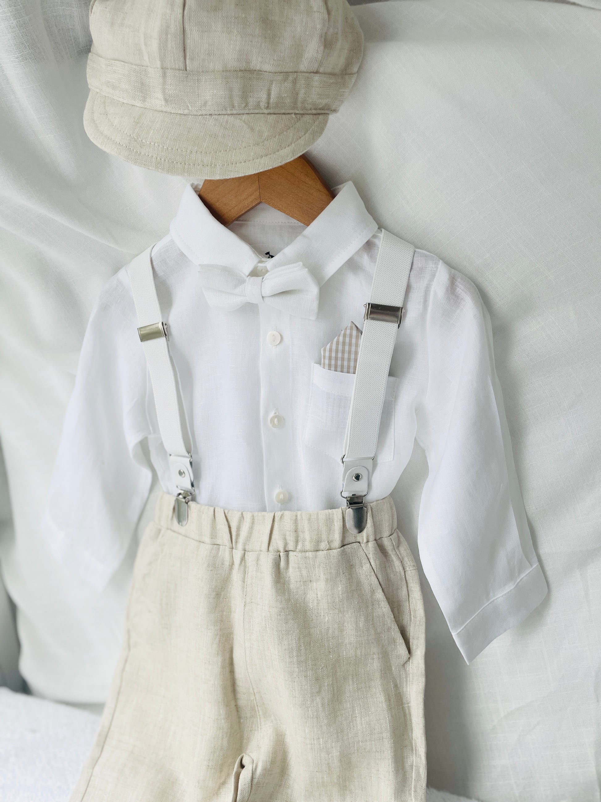 Gorgeous pure linen shirt, with pants in white, beige or navy, suspenders in white, beige, navy, or tan, and bow tie to match. A Standard set comes with the beige pants. Durable, stylish, formal attire made with the highest quality natural fabrics, for a classic baptism look with a modern twist. Many bow tie colour schemes are available to fit your theme, please check the photos for available colours (and feel free to request a specific colour to match your theme!).