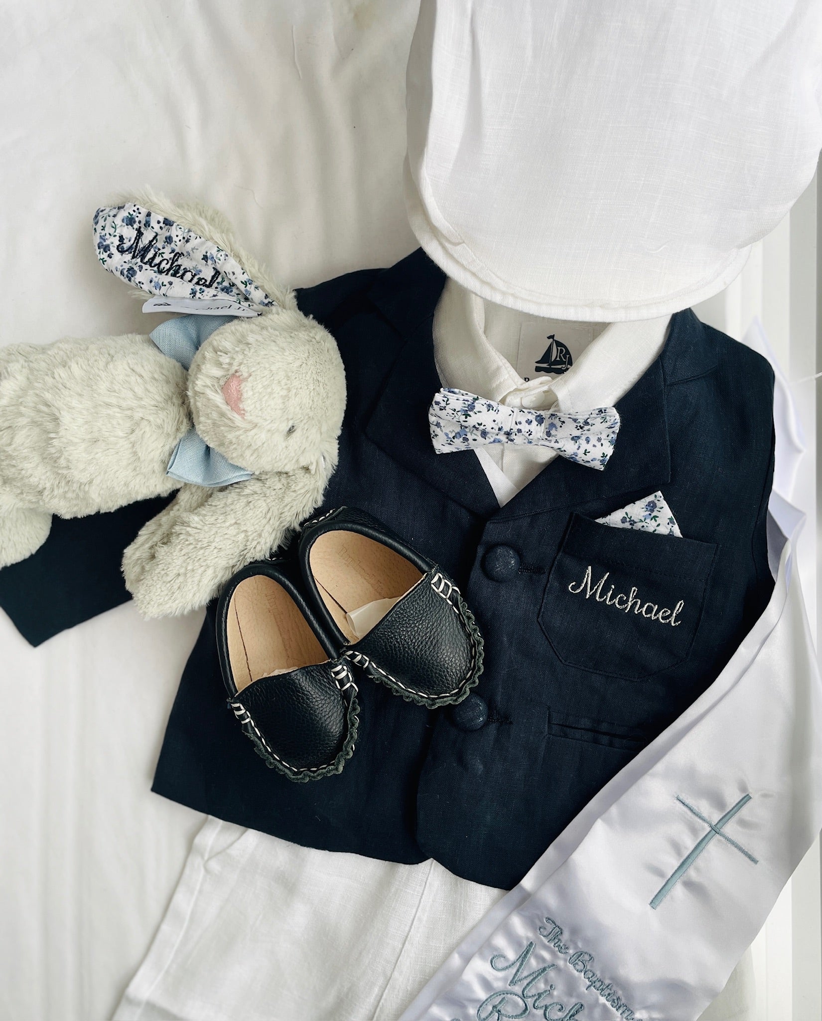 Navy blue and beige formal baptism or wedding suit with accessories and optional personalisation