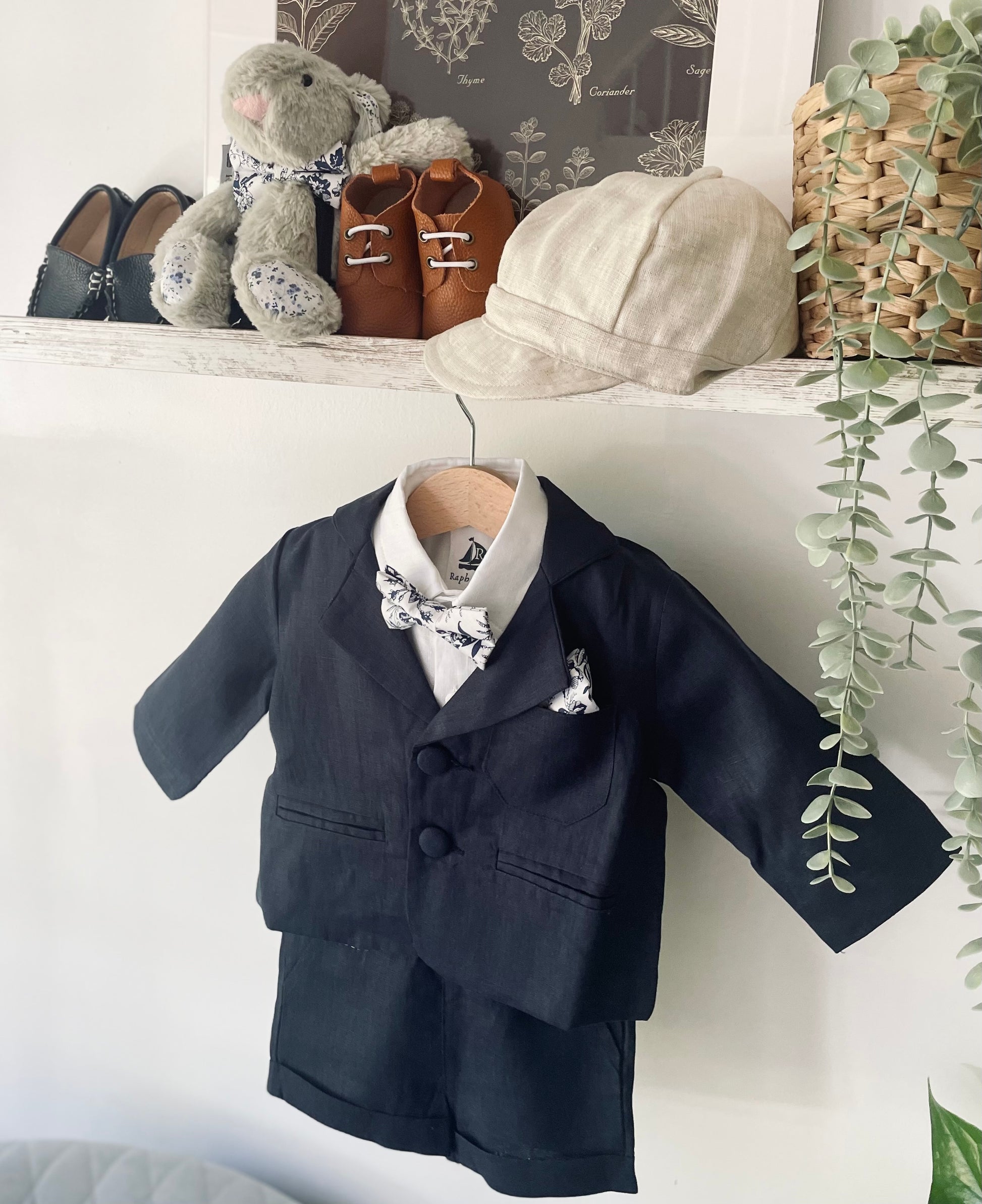 Navy blue linen summer set with shorts, shirt, suspenders and bow tie plus optional jacket, embroidery, shoes and cap
