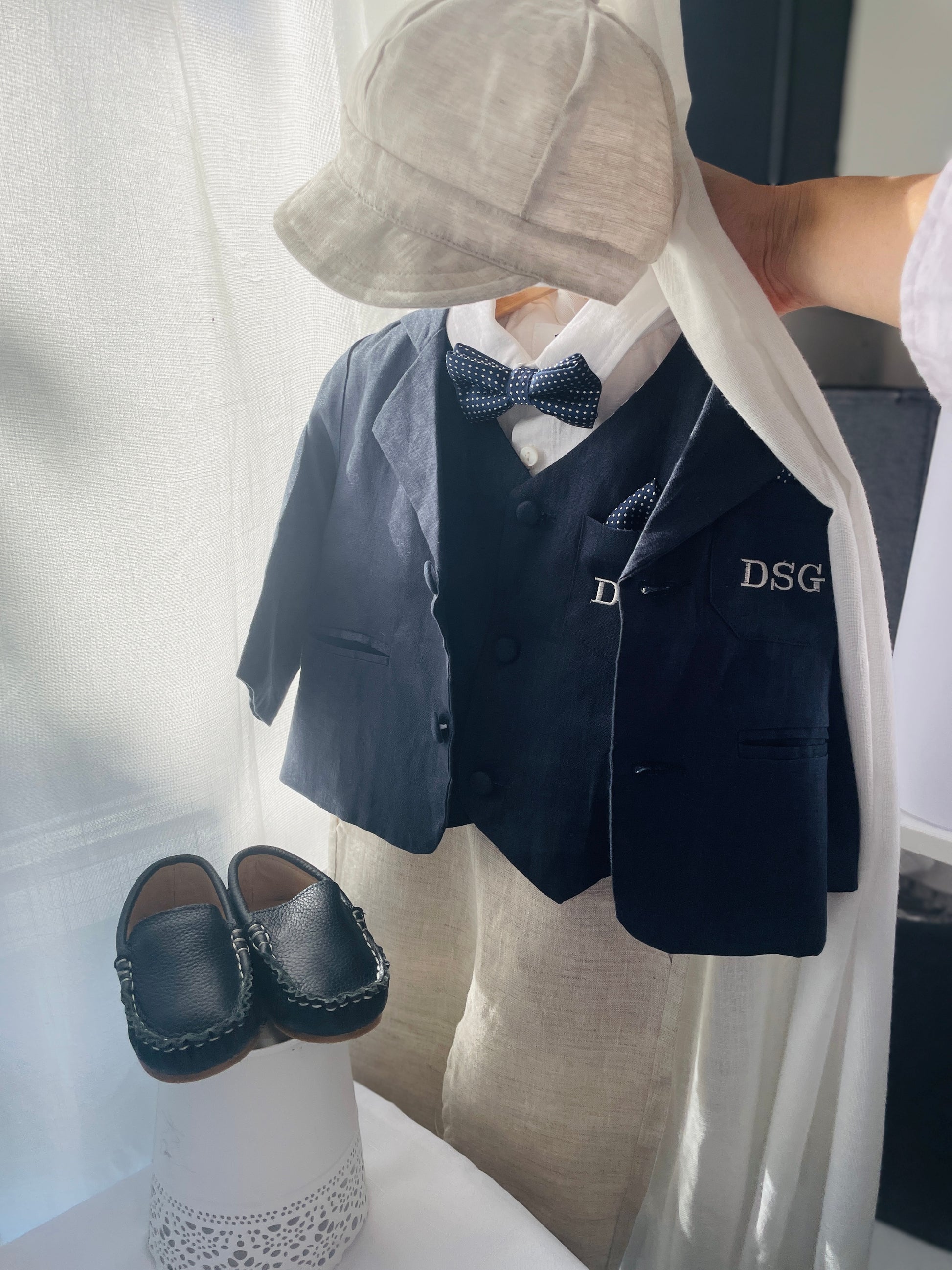 Navy blue linen suit with vest, pants, shirt, suspenders and bow tie plus optional jacket, embroidery, shoes and cap