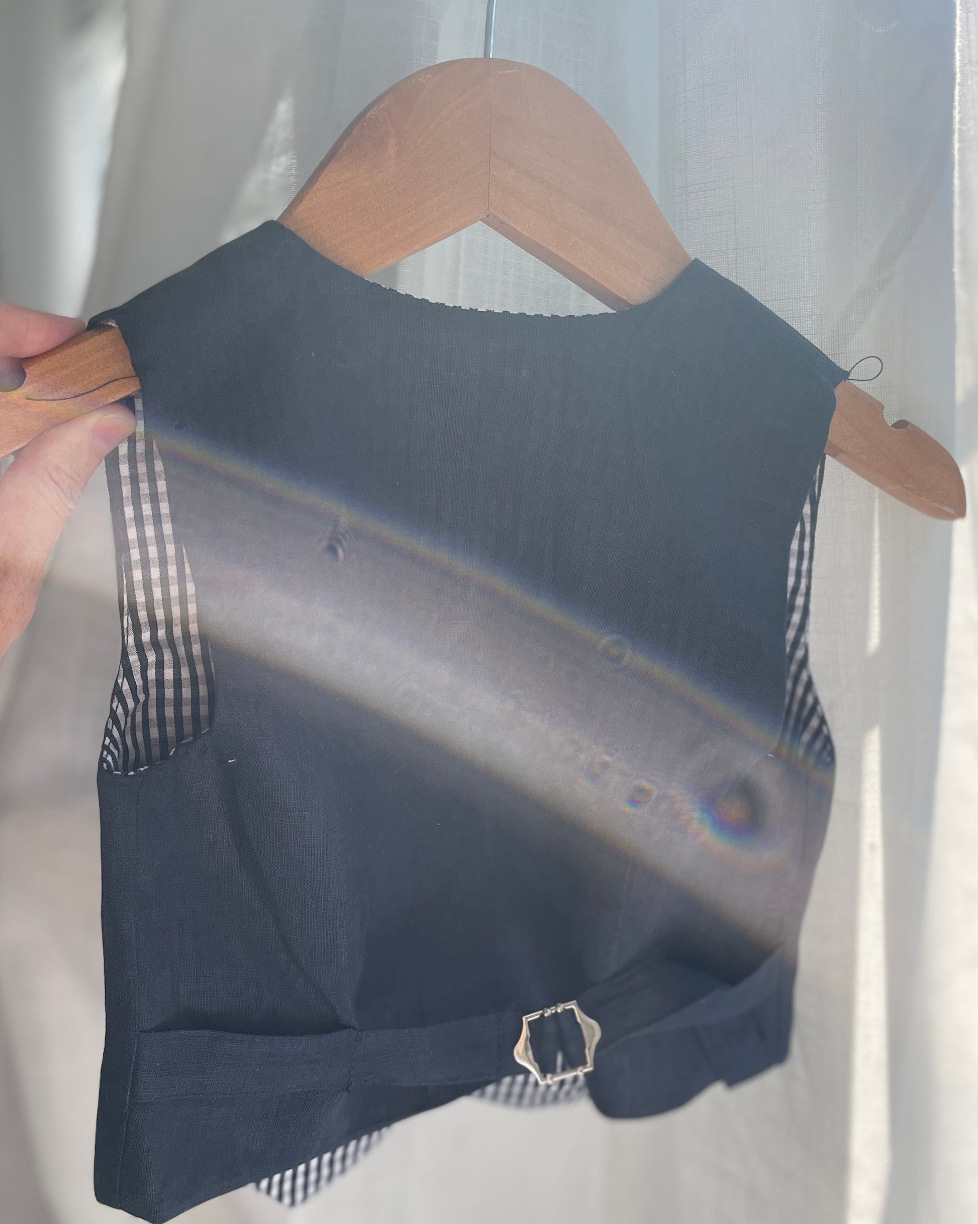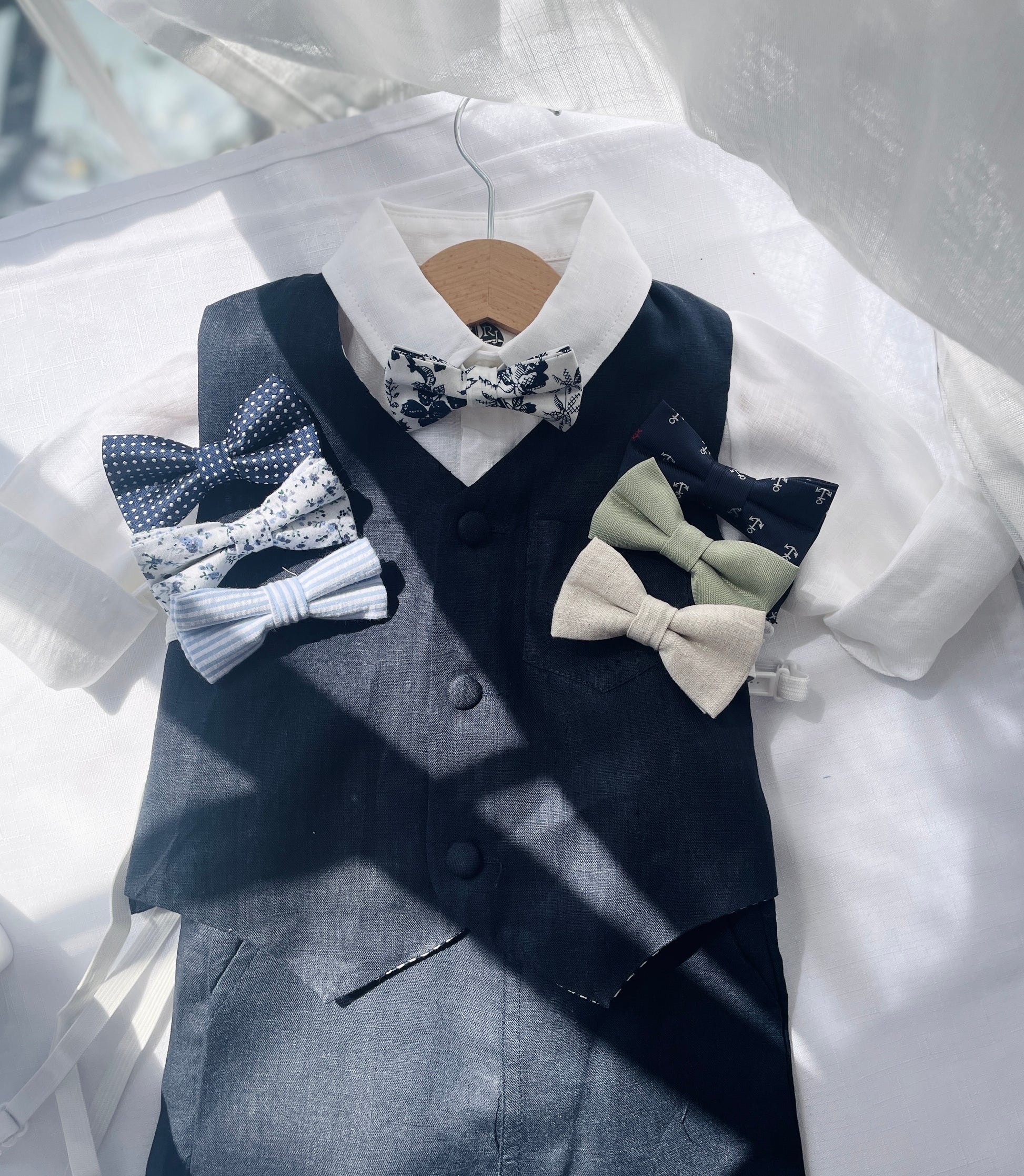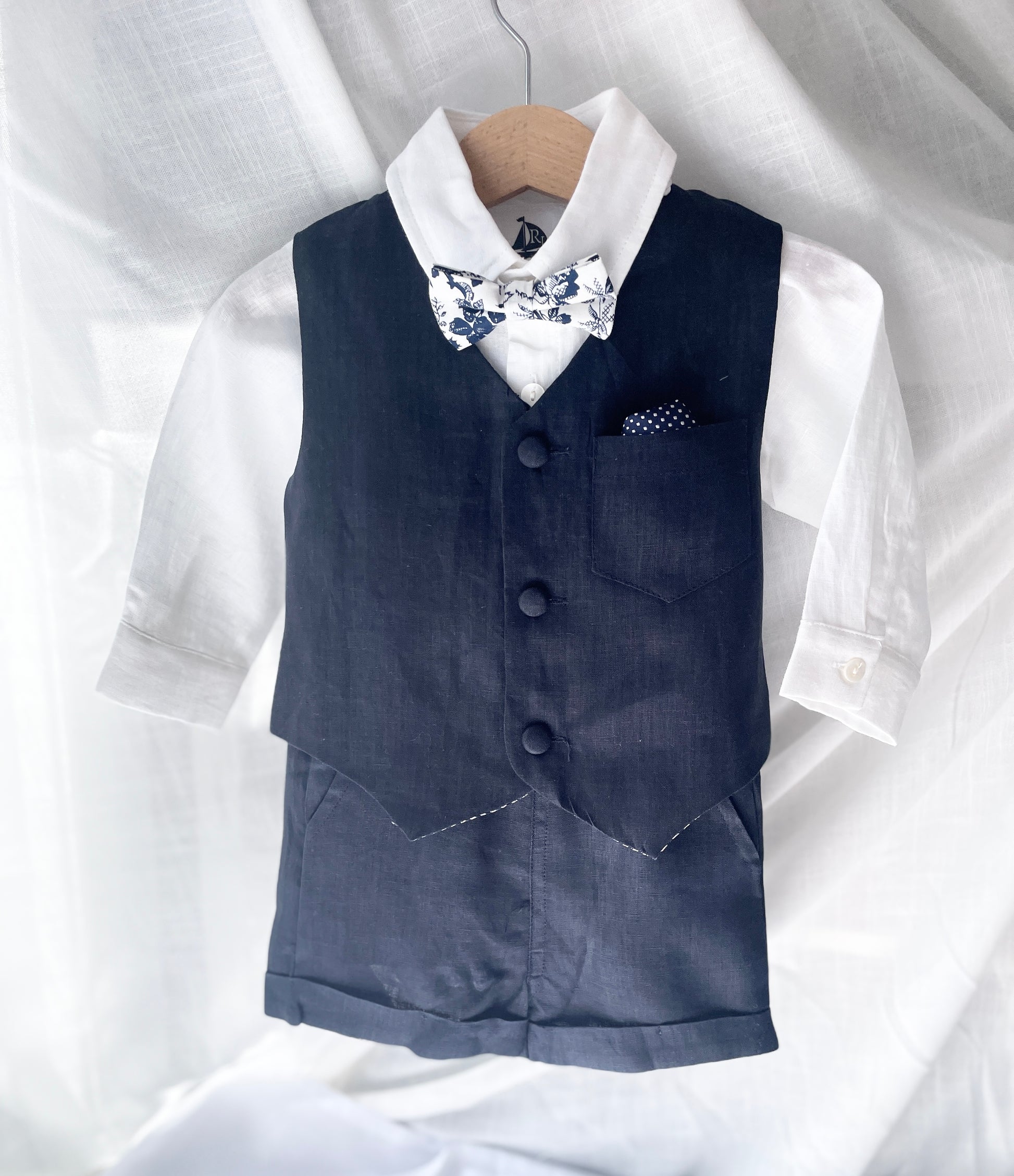 Navy blue linen summer set with vest, shorts, shirt, suspenders and bow tie plus optional jacket, embroidery, shoes and cap