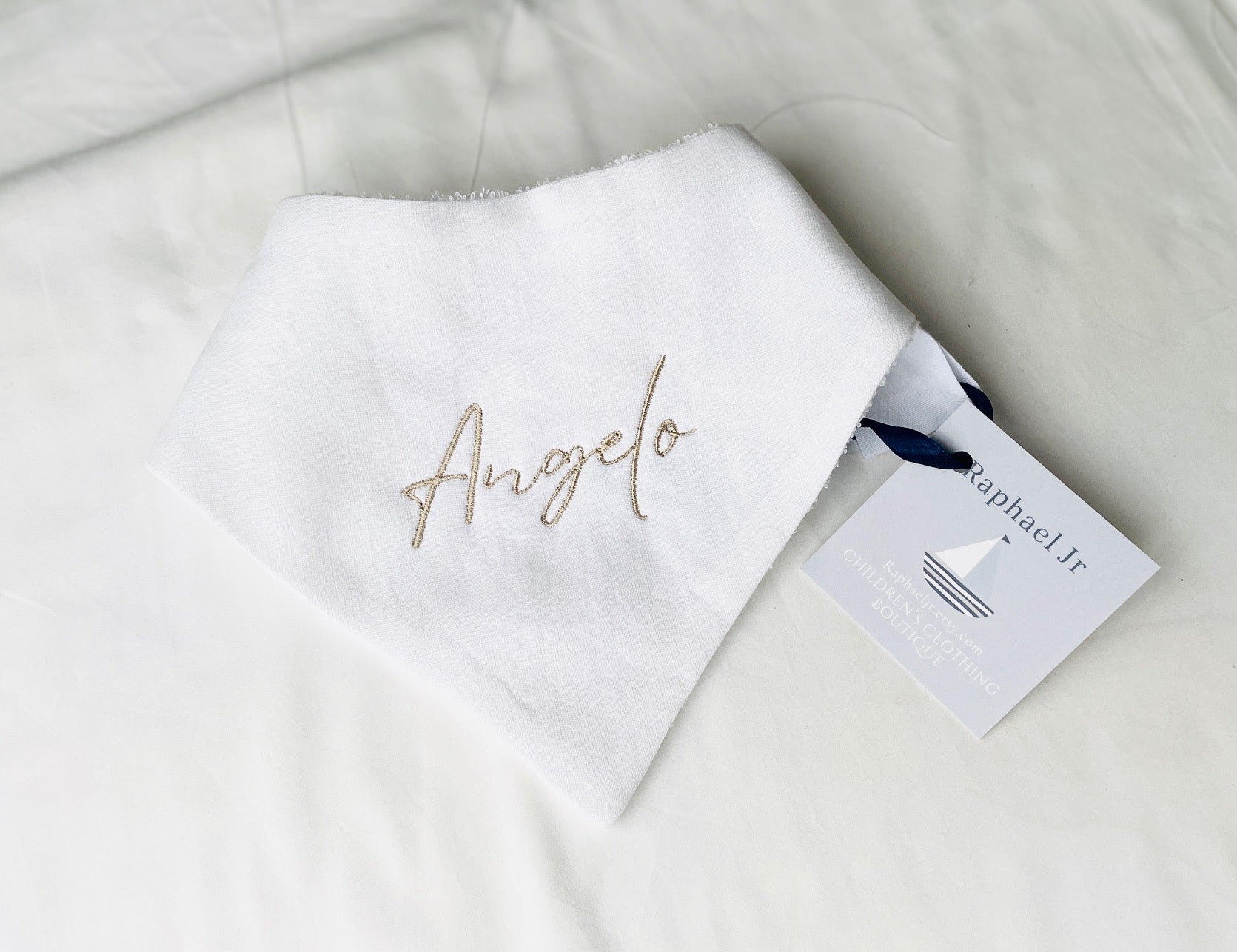 optional 100% linen front and soft fleece reverse, snap closure, bandana style bib to match the linen suits and bow ties. Protect your outfit from dribble and spills during the special event!