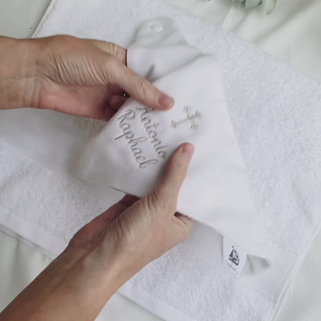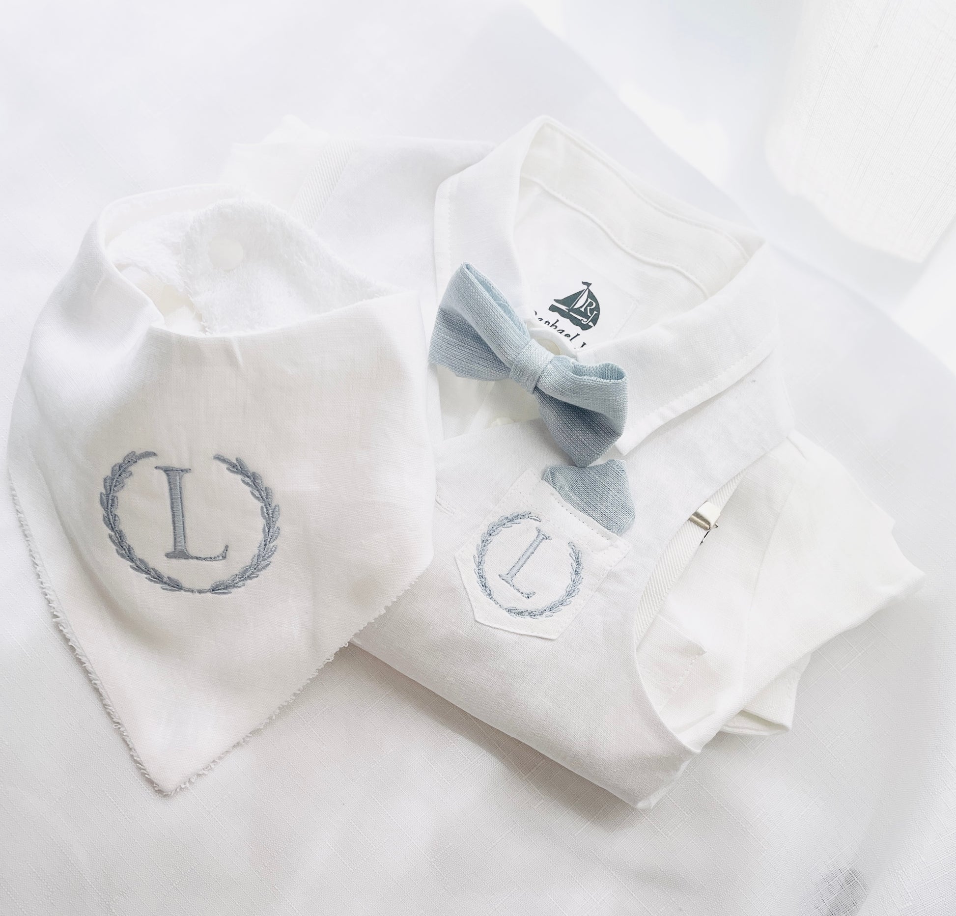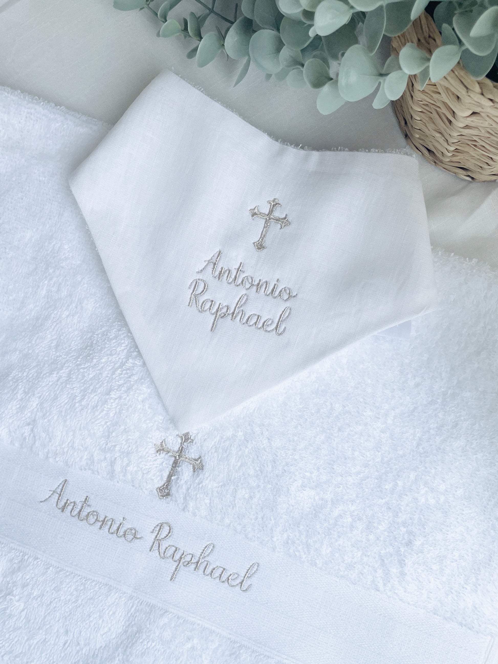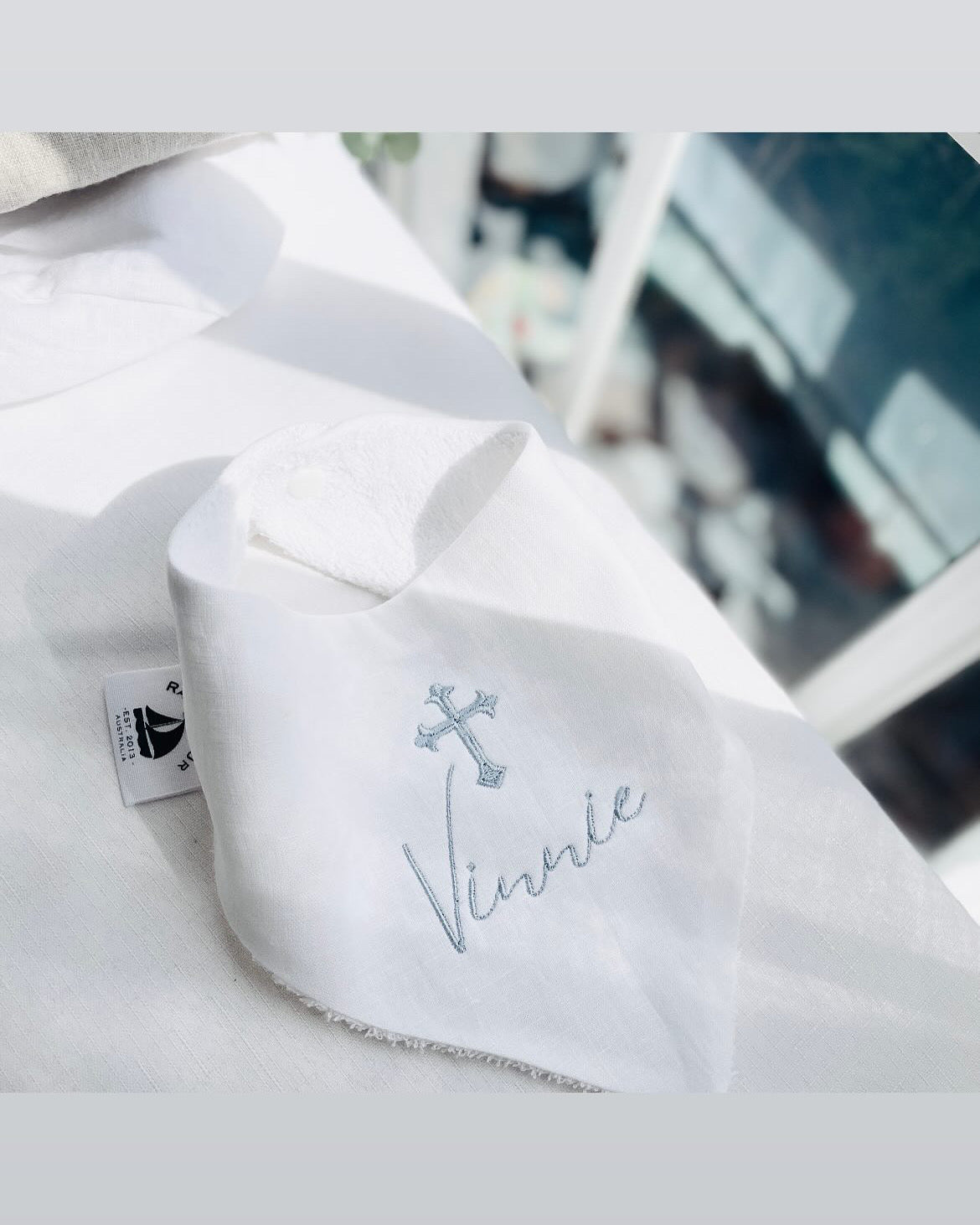 White linen baby dribble bandana baptism Christening bib with optional cross or custom embroidery